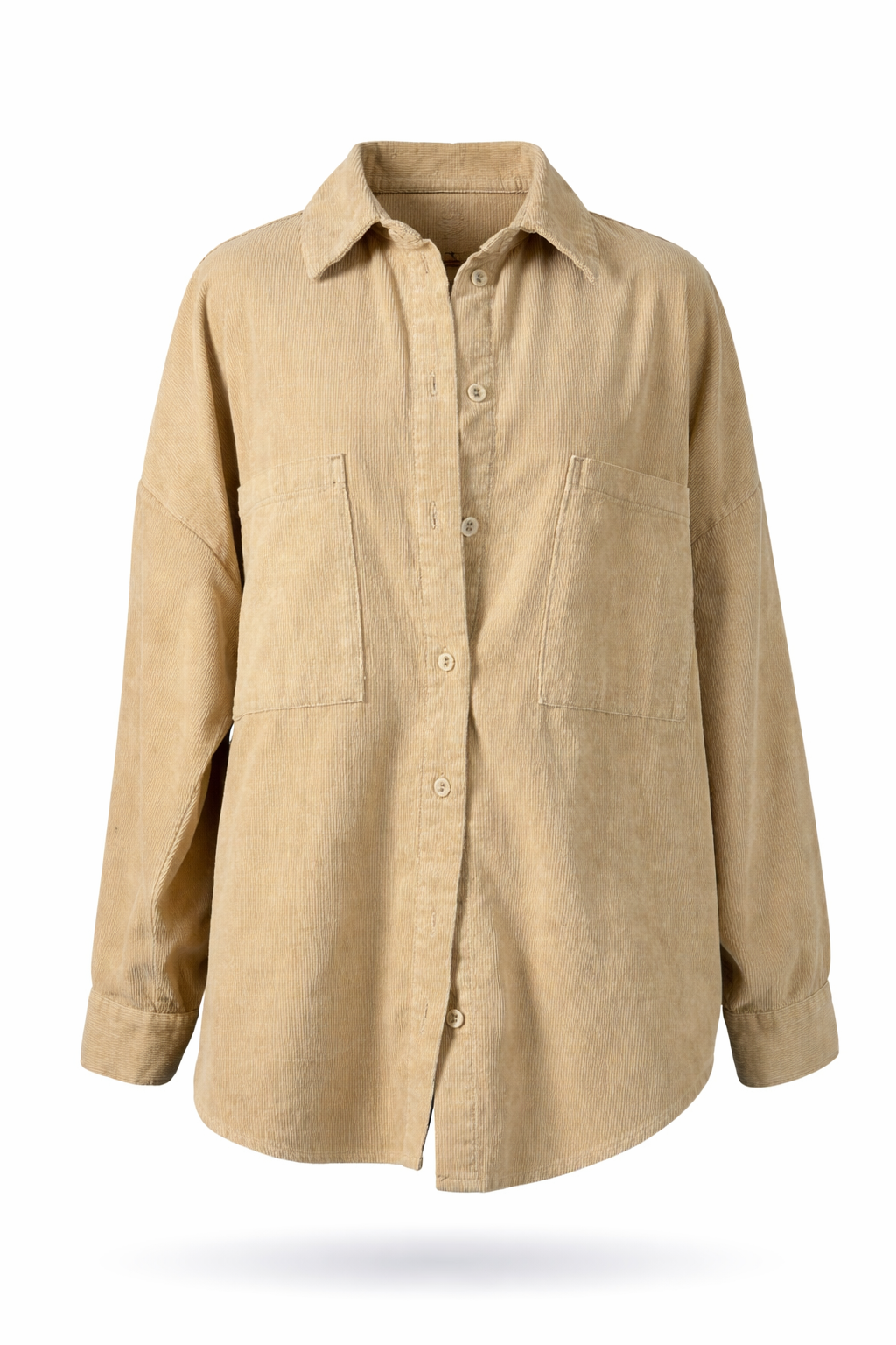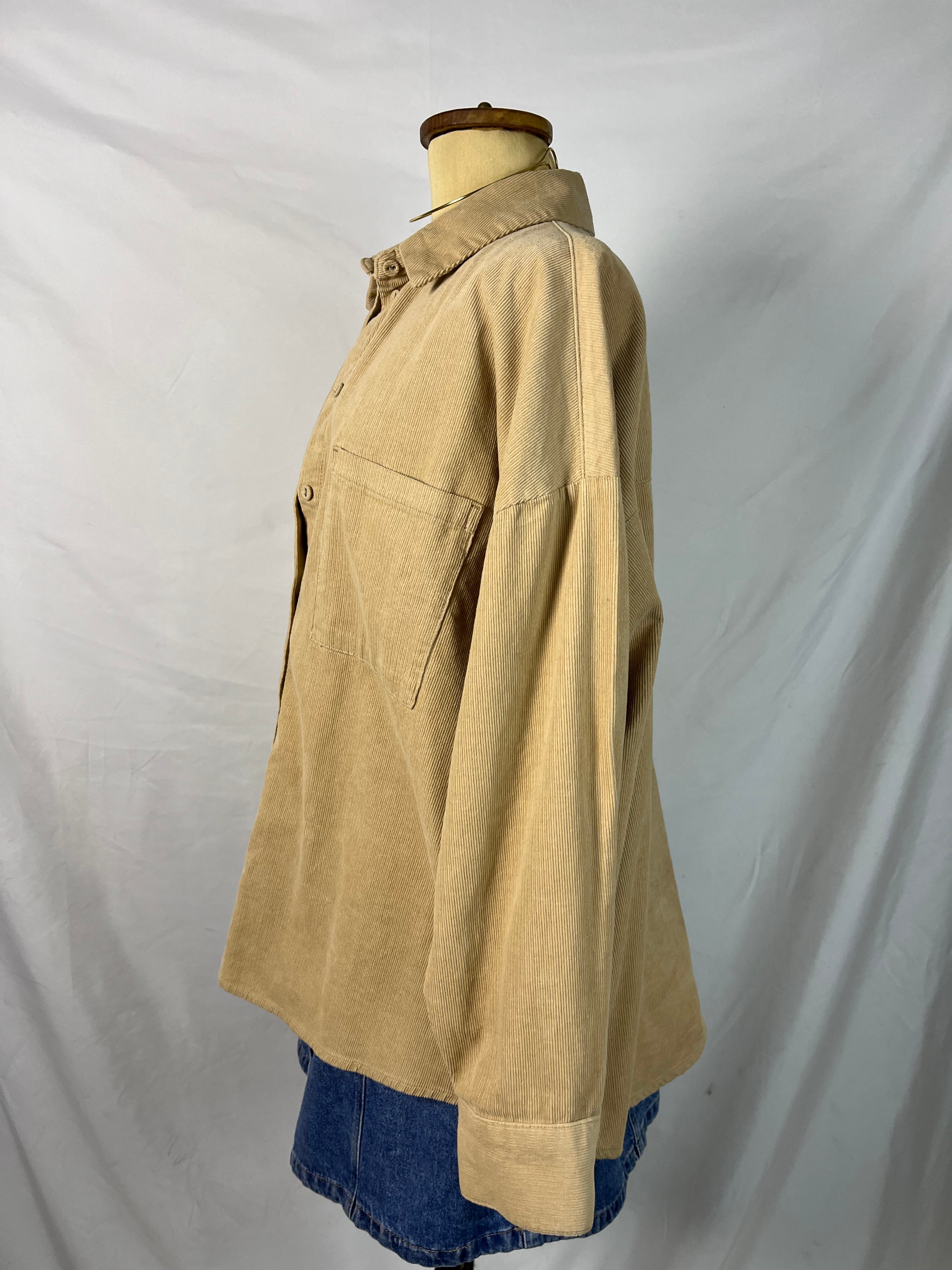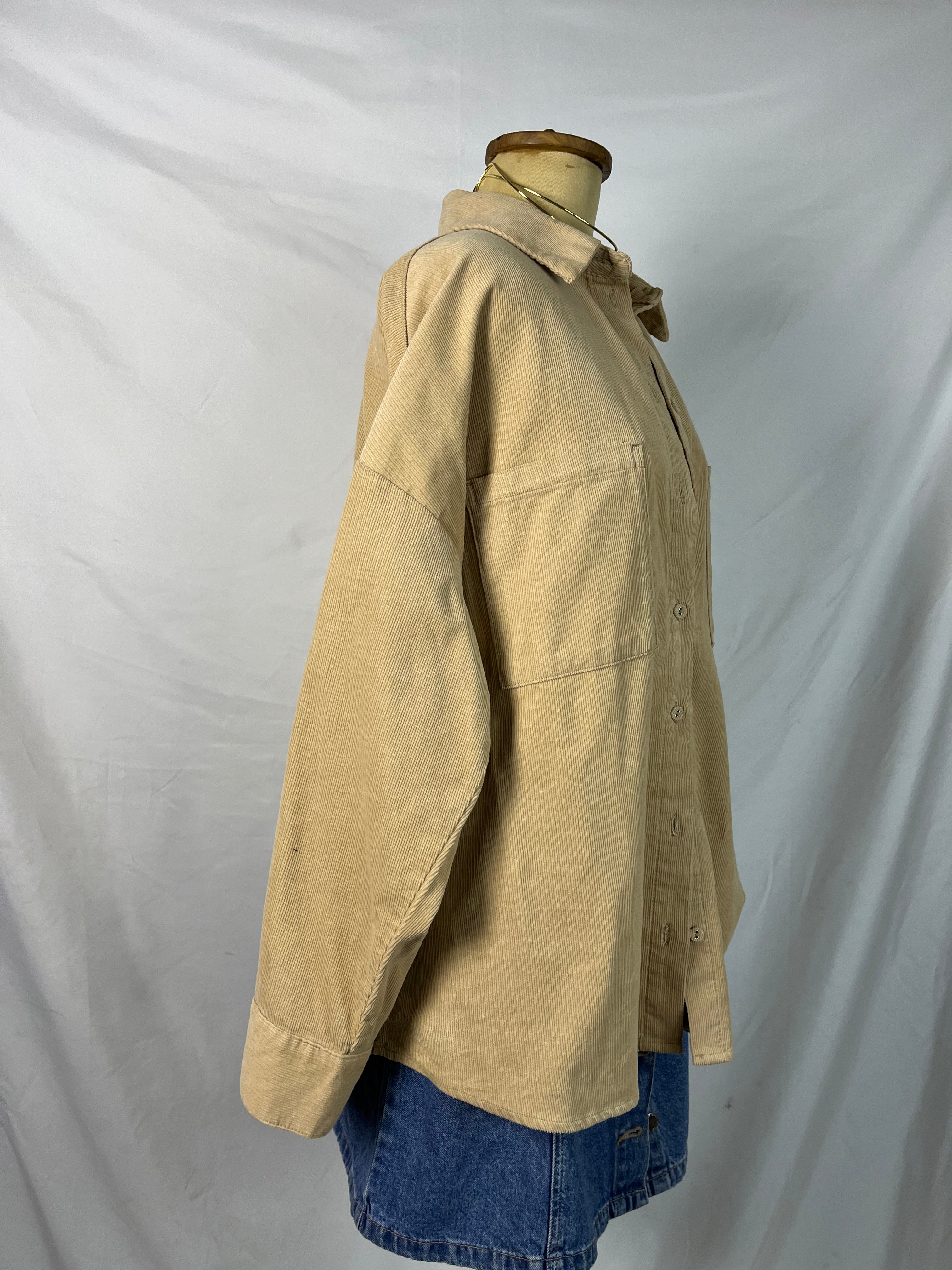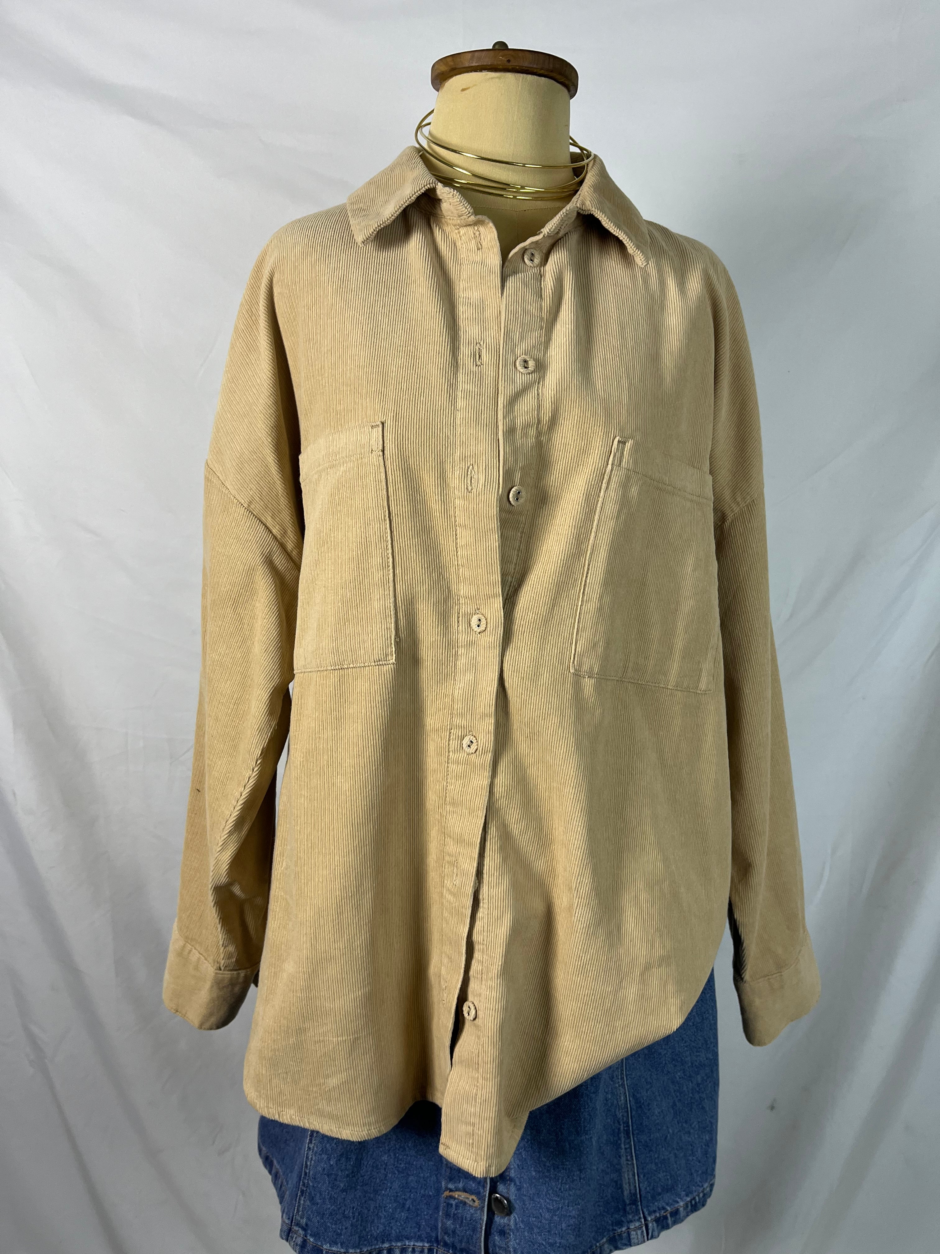 Light camel beige long sleeves collared corduroy buttoned down shirt with two chest pockets.