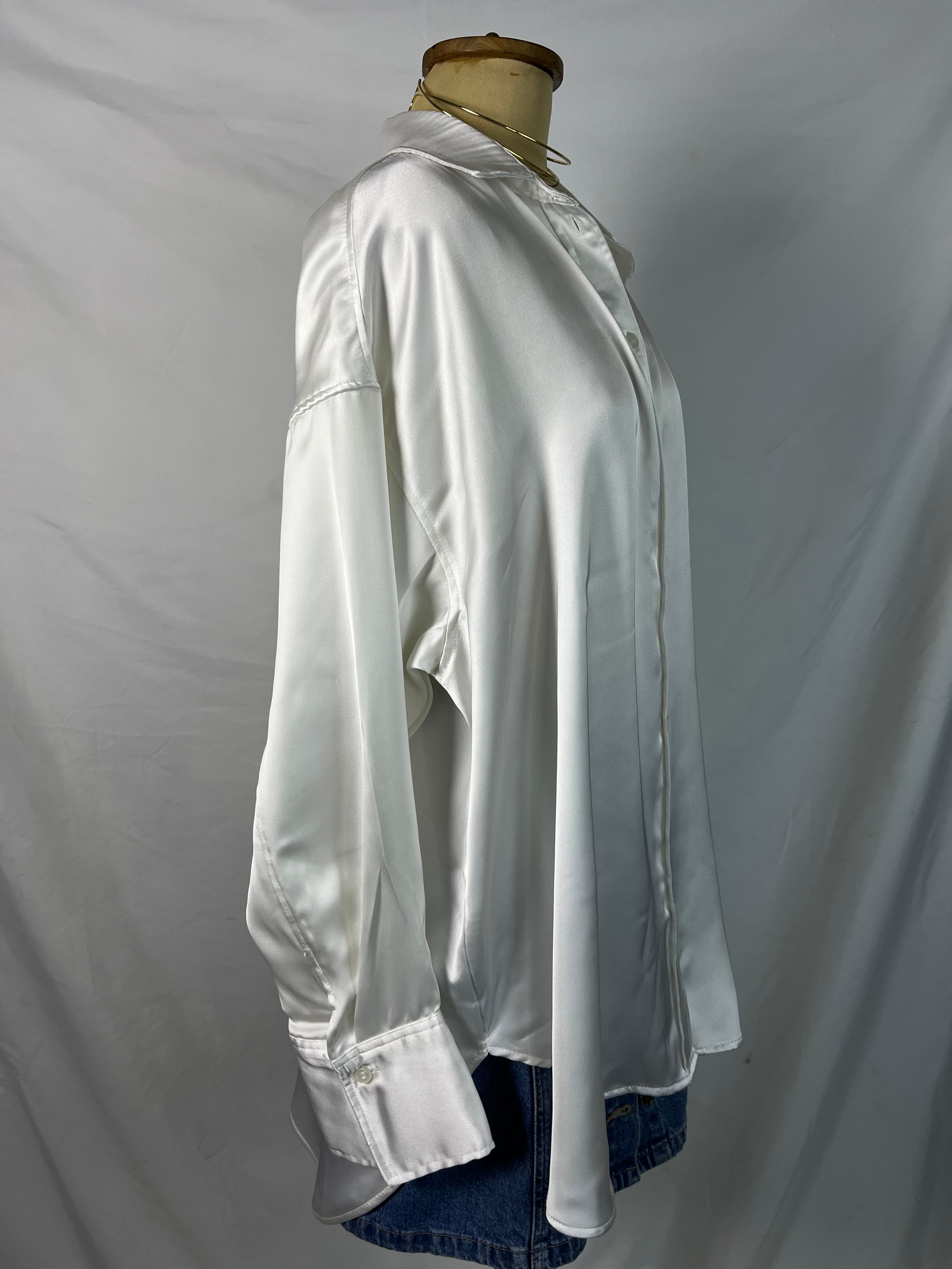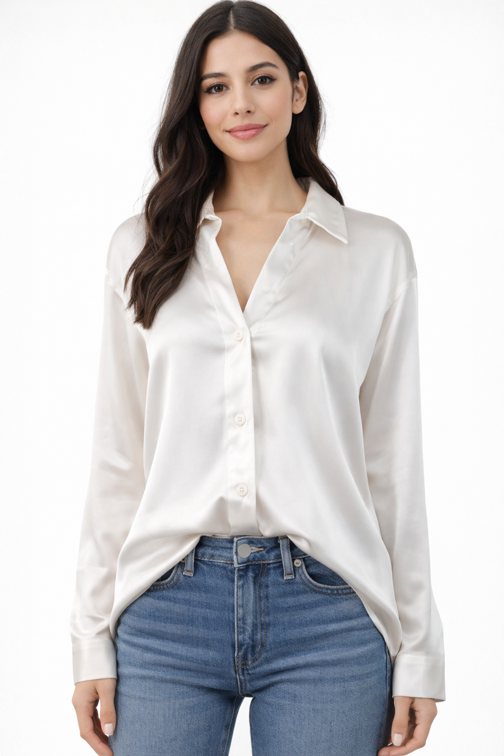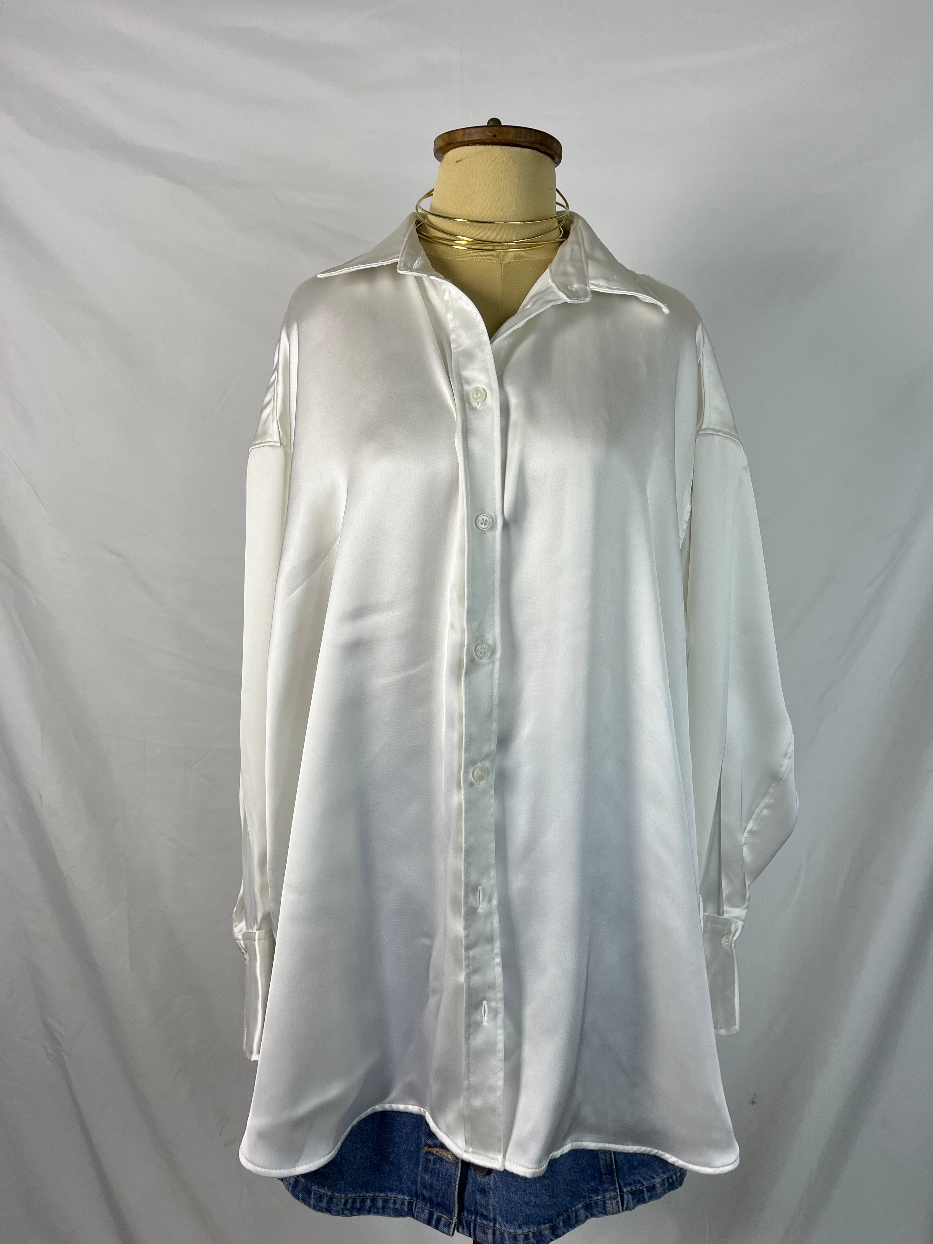 White satin fabric long sleeves with cuffs, collared button down shirt.