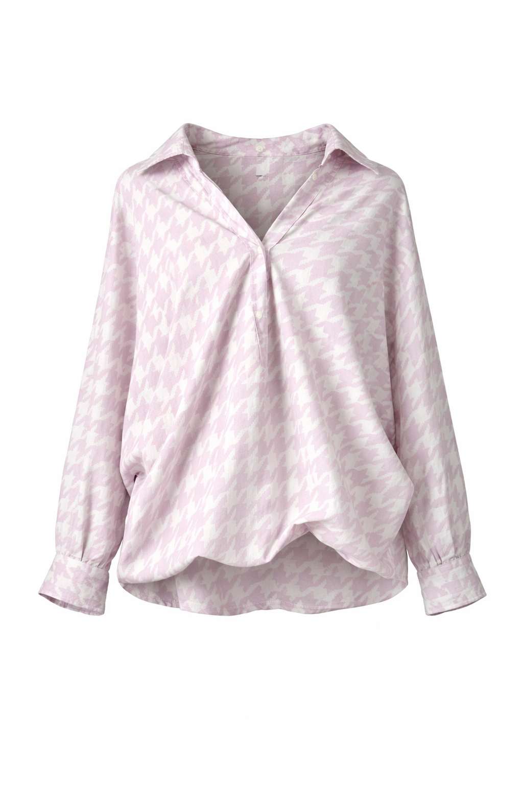 Lavender and white tweed print long sleeves with cuffs, soft collar, loose drape lightweight blouse.