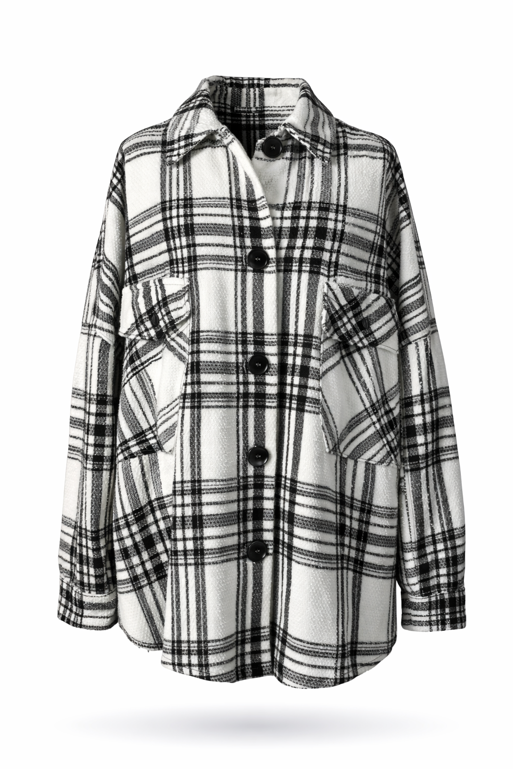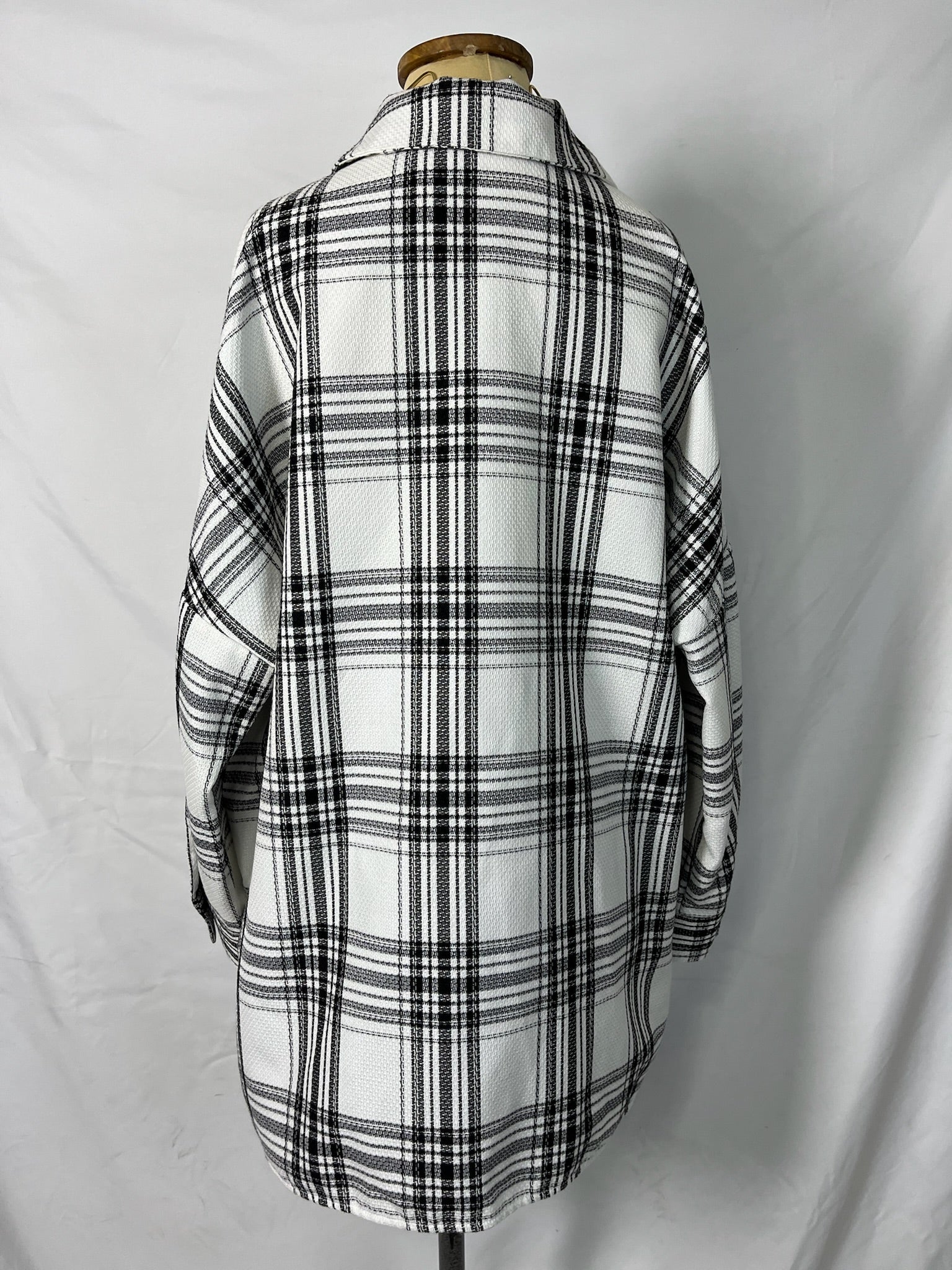 Black & white long sleeves collared front button closure, with roomy patch pockets textured fabric layer jacket.