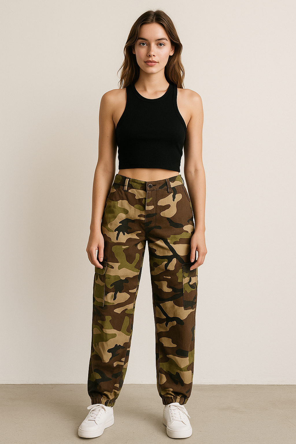 Army print relaxed fit elasticated cuffs with multiple side pockets and button closure classic camouflage cargo pants.