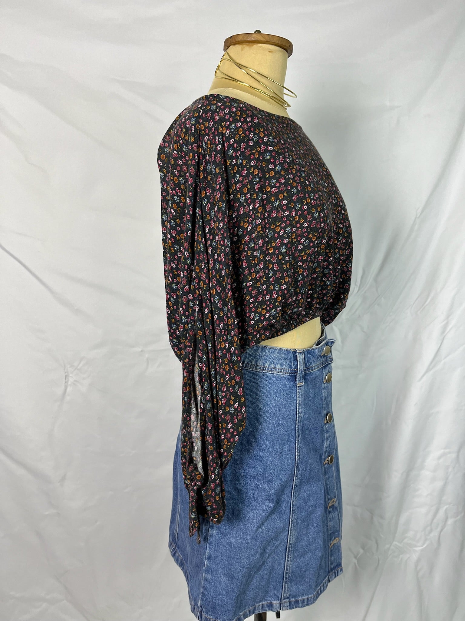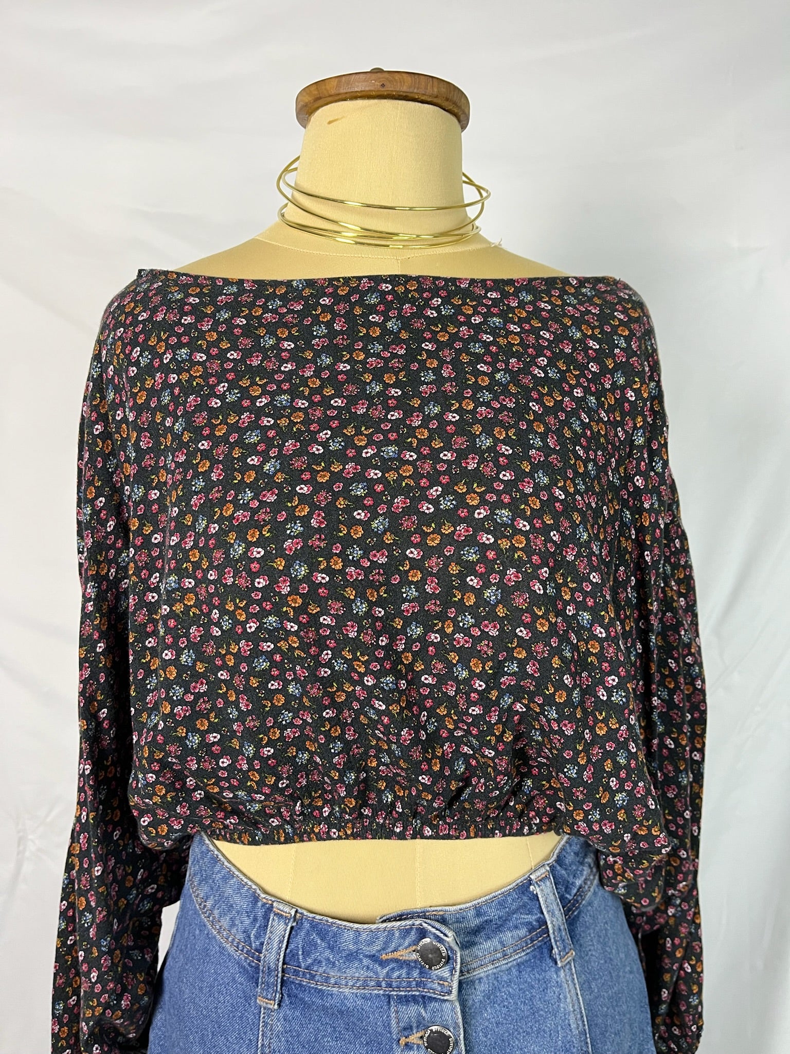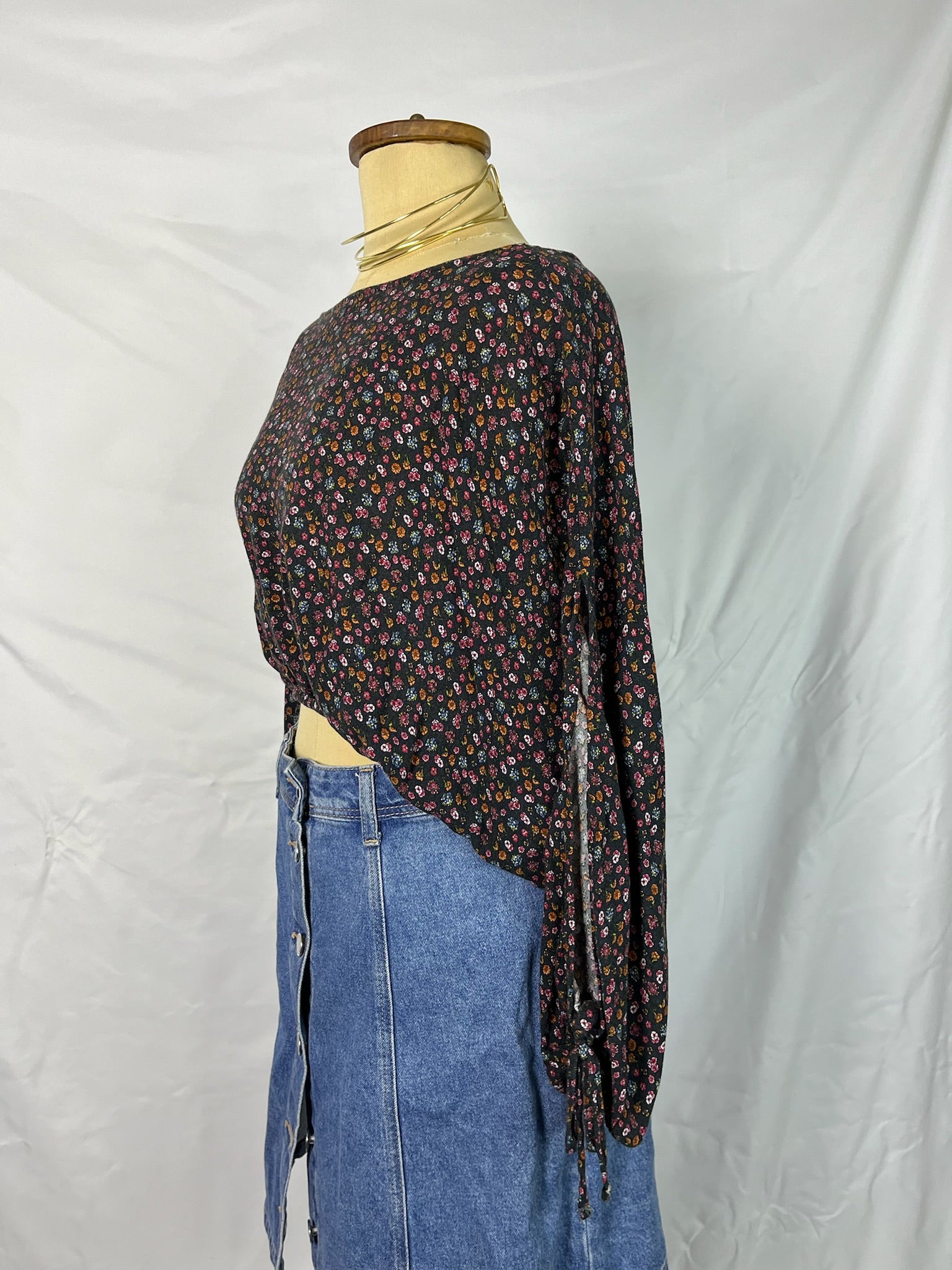 Black base with mini floral print Long sleeves lightly cropped lightweight blouse.