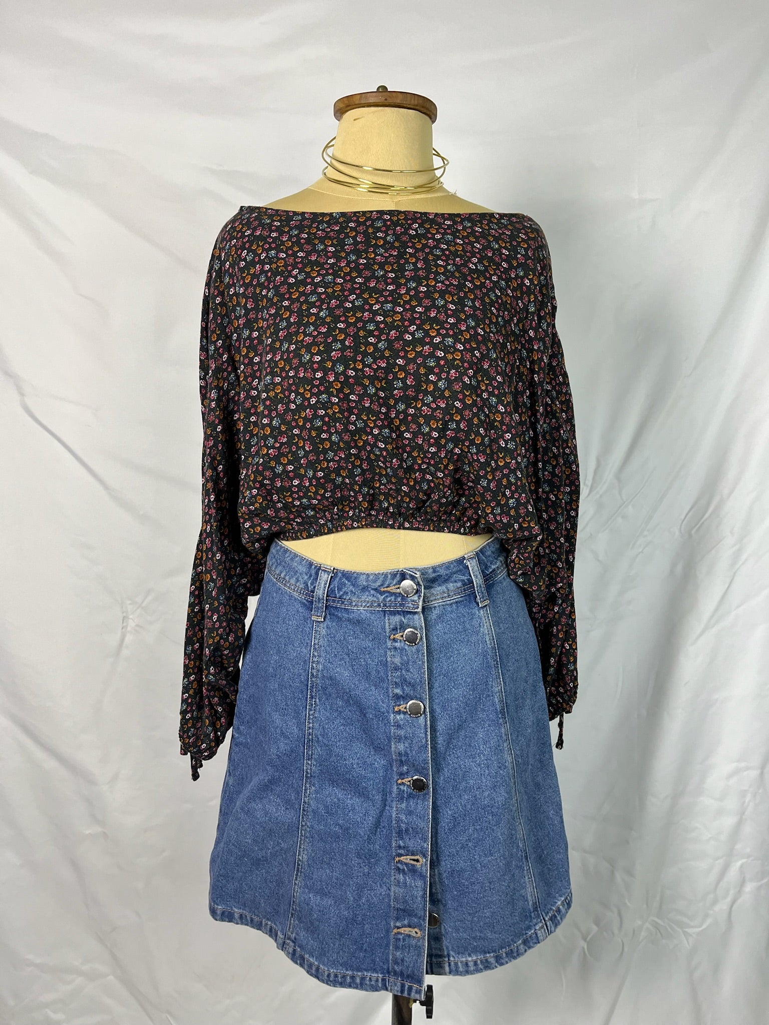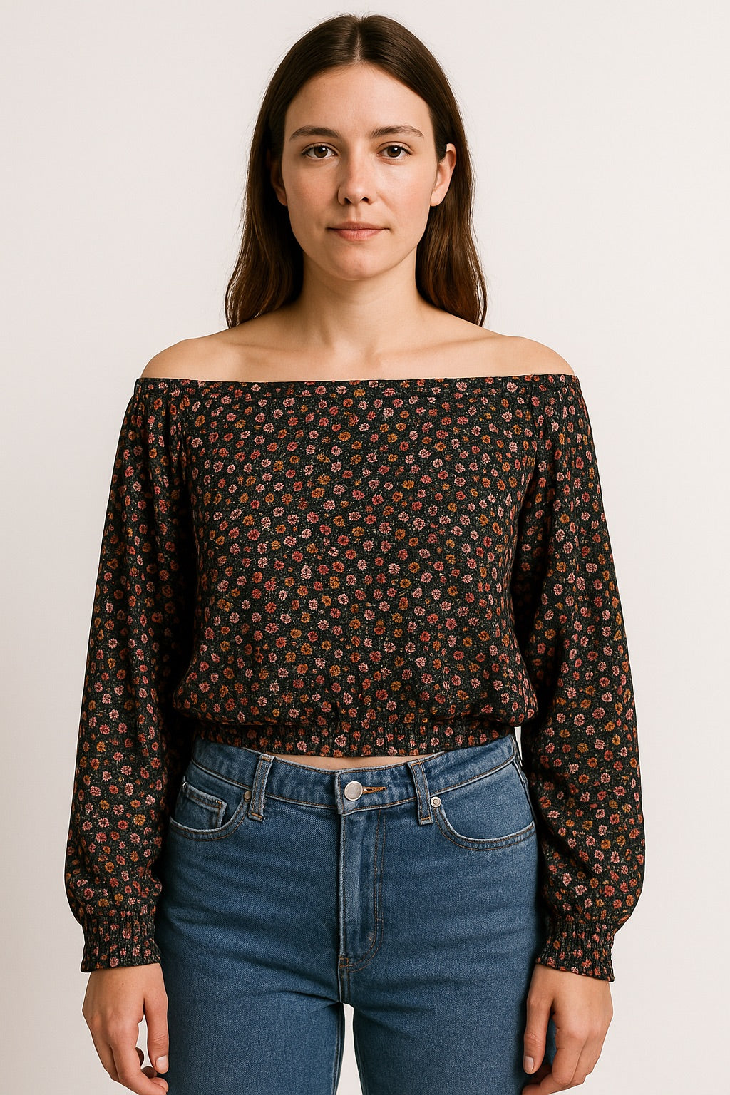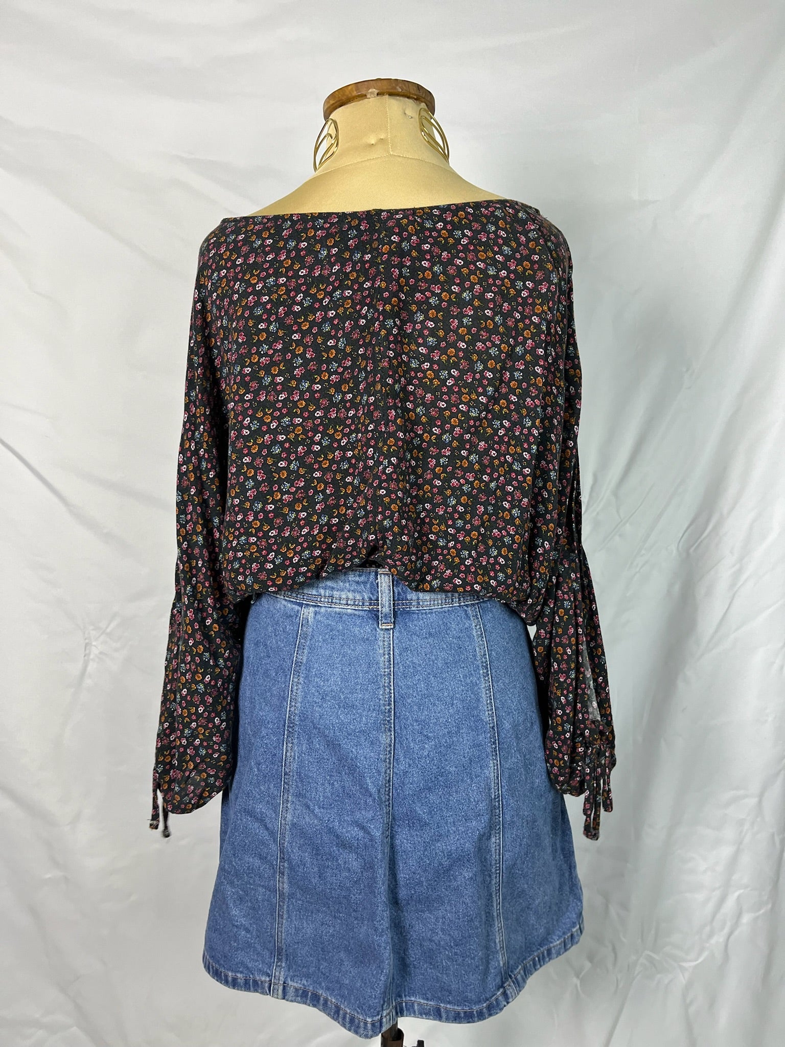 Black base with mini floral print Long sleeves lightly cropped lightweight blouse.