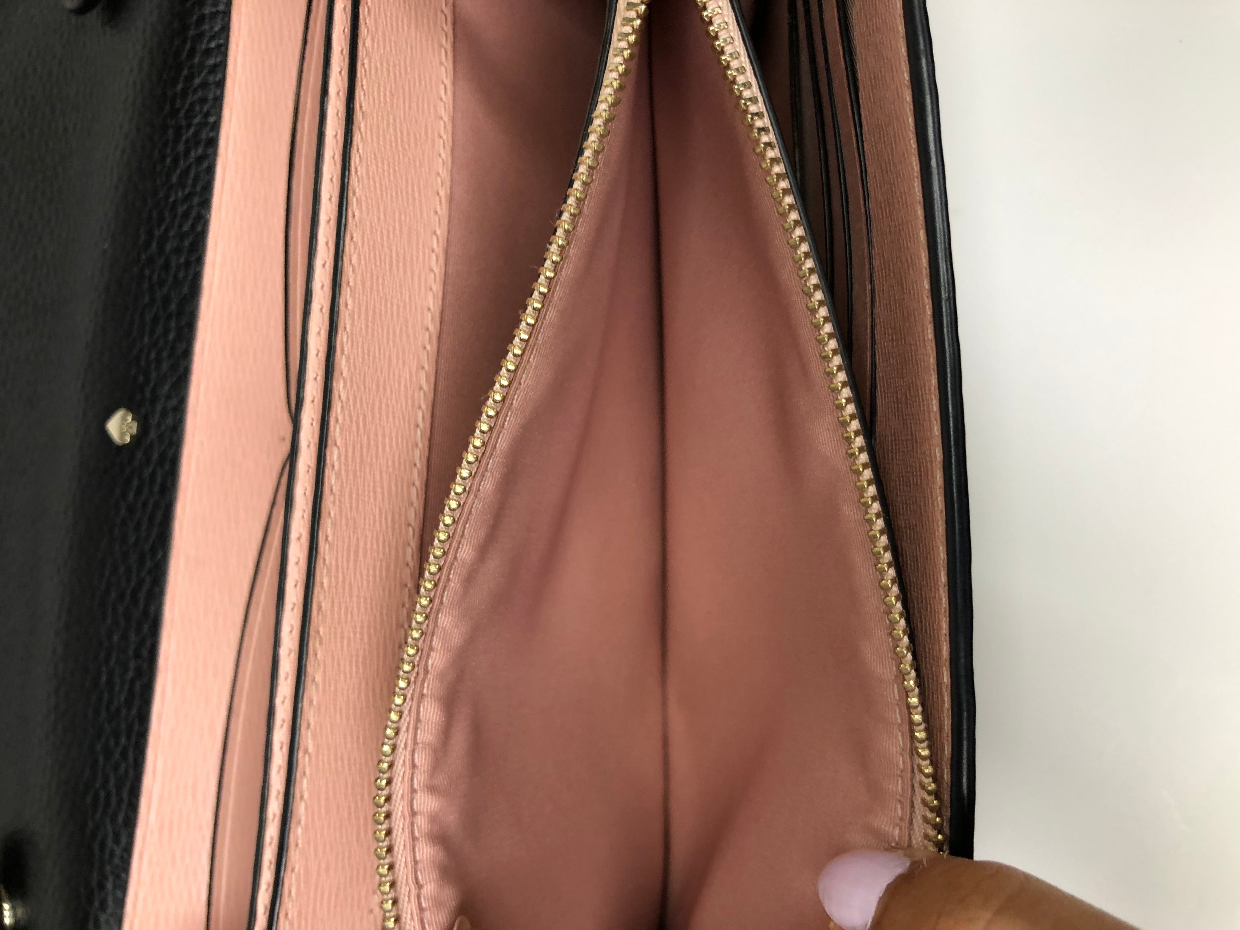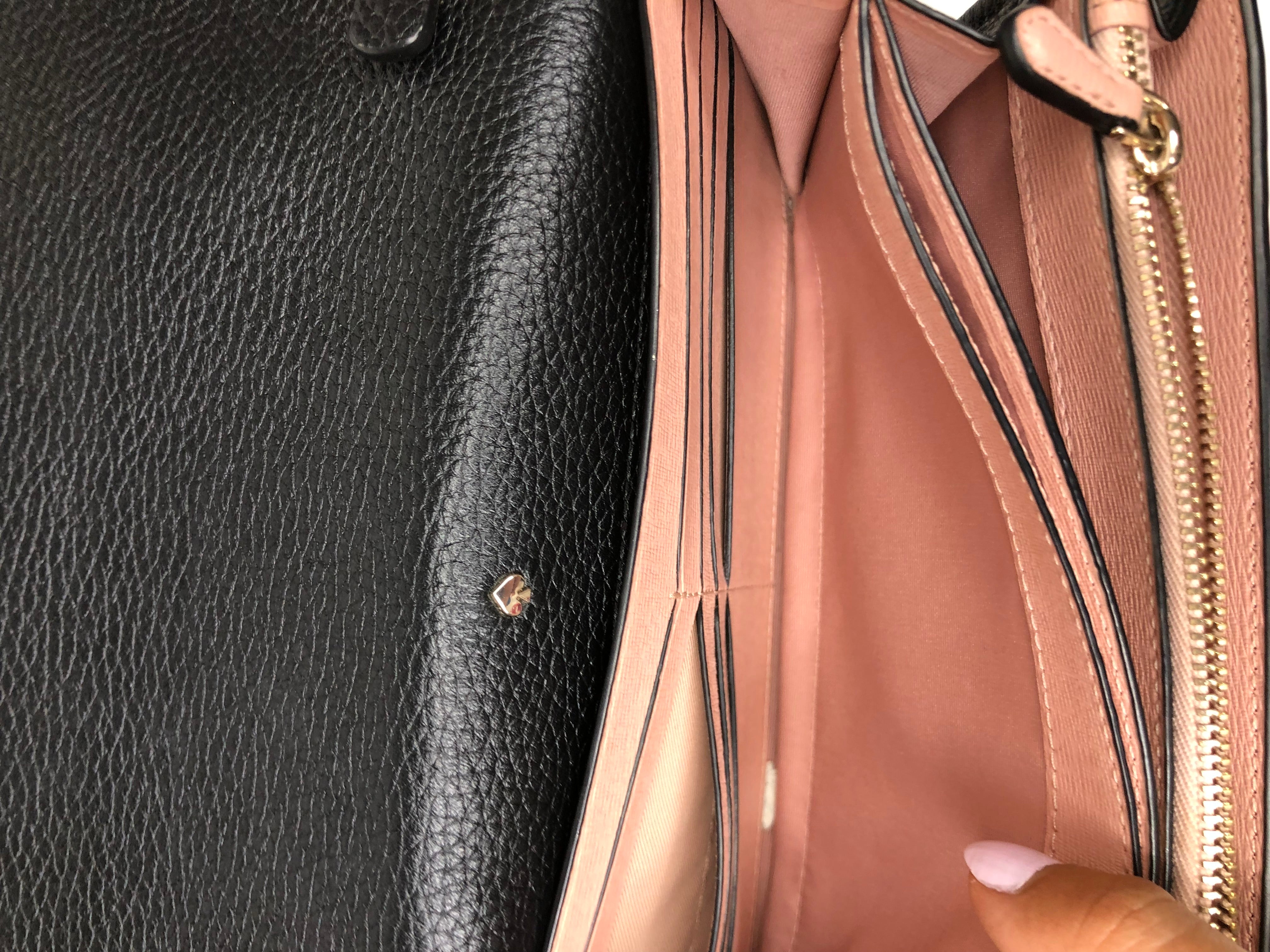 Black faux leather Kate Spade cross body bag with gold hardware. The interiors of the bag are baby pink it’s divided into multiple sections with a middle zipper and a place to place the cards in, also has a back pocket.