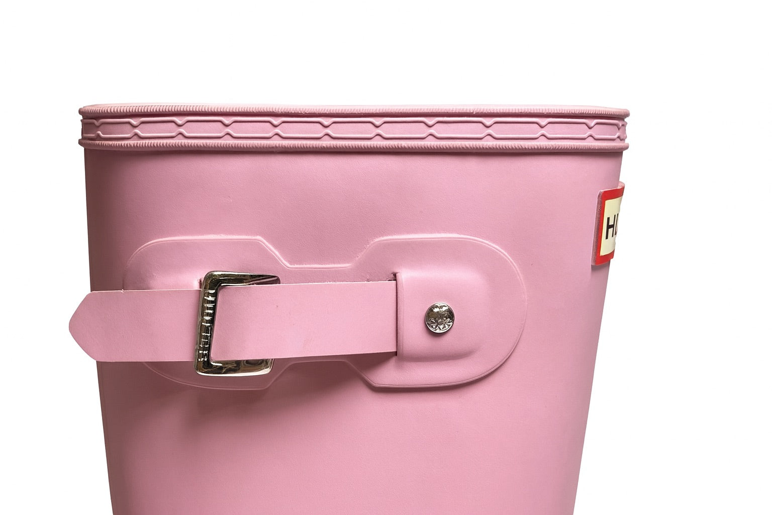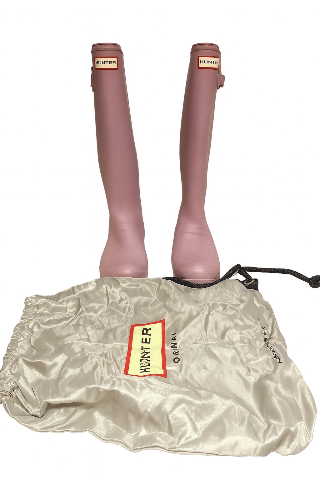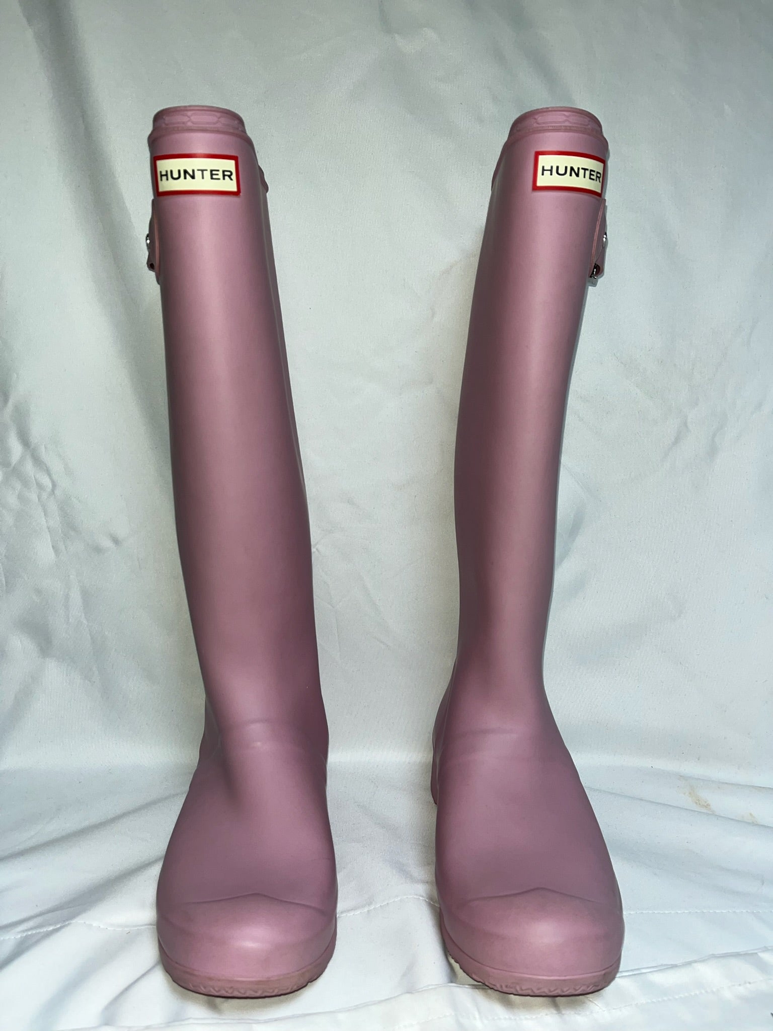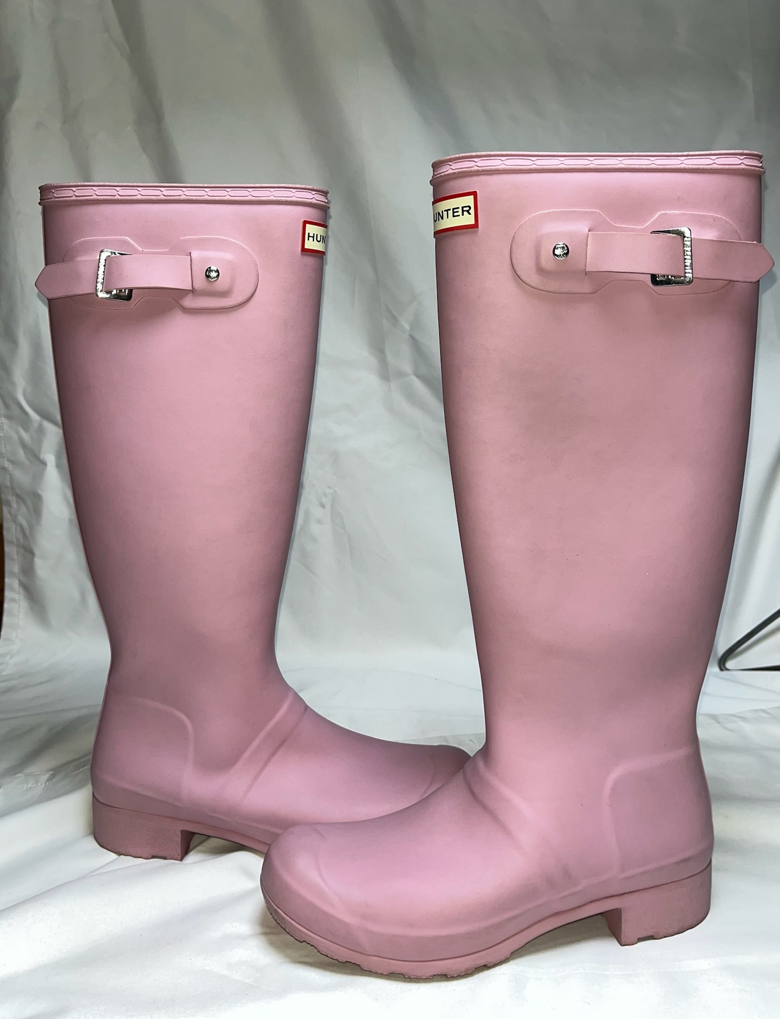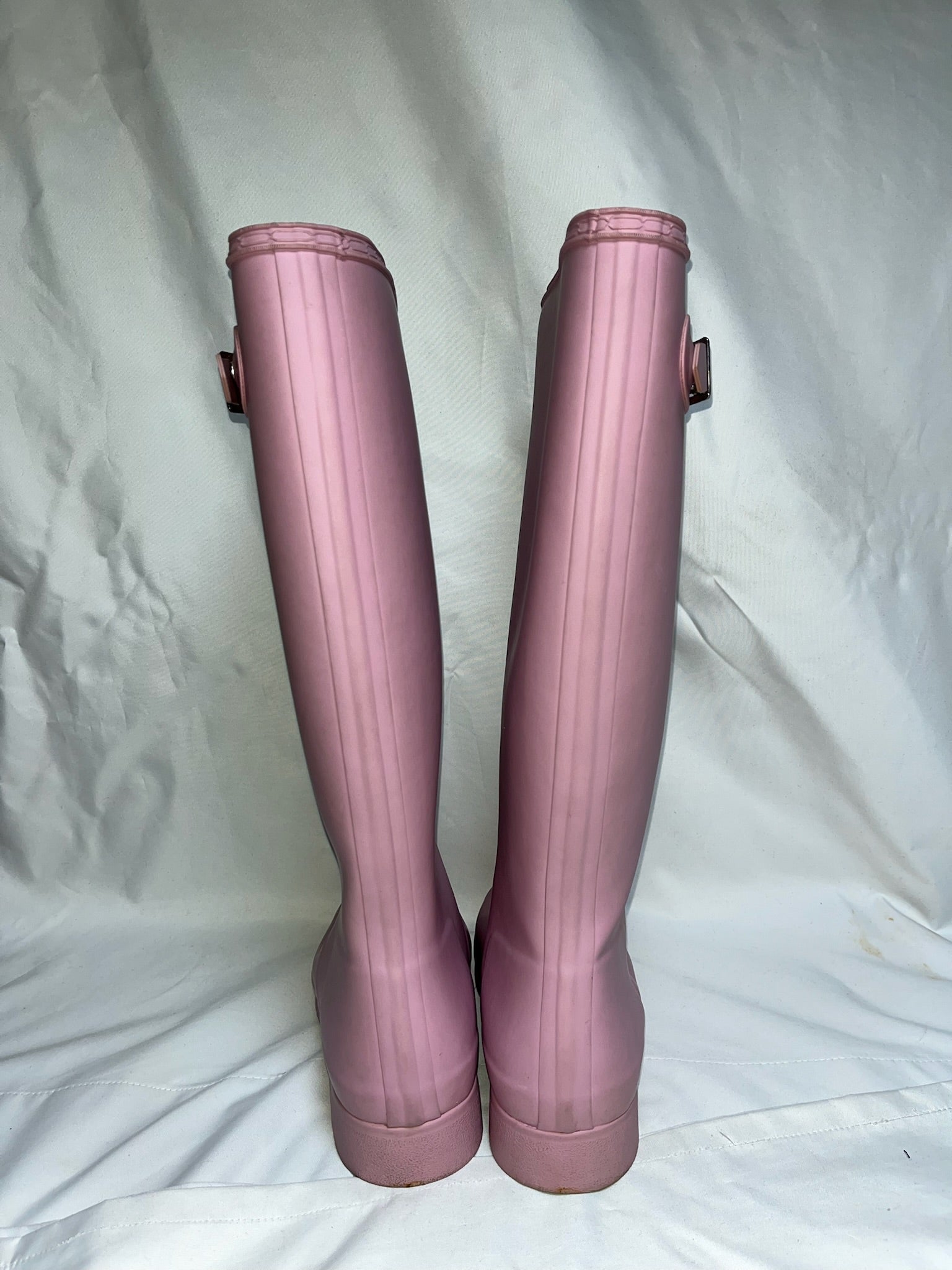 Baby pink size 39euro almost under the knee length rubbery rainboots with silver hardware.