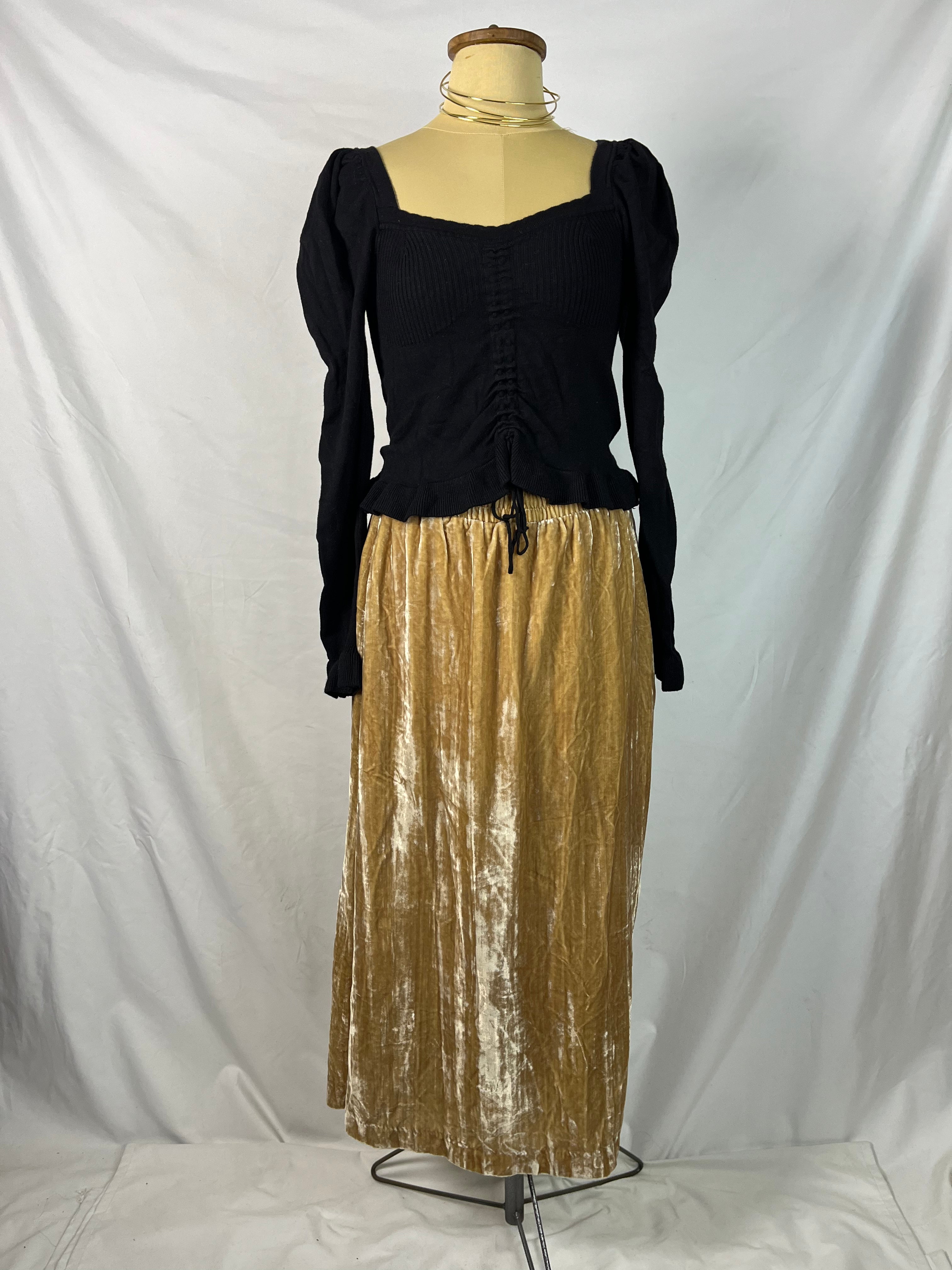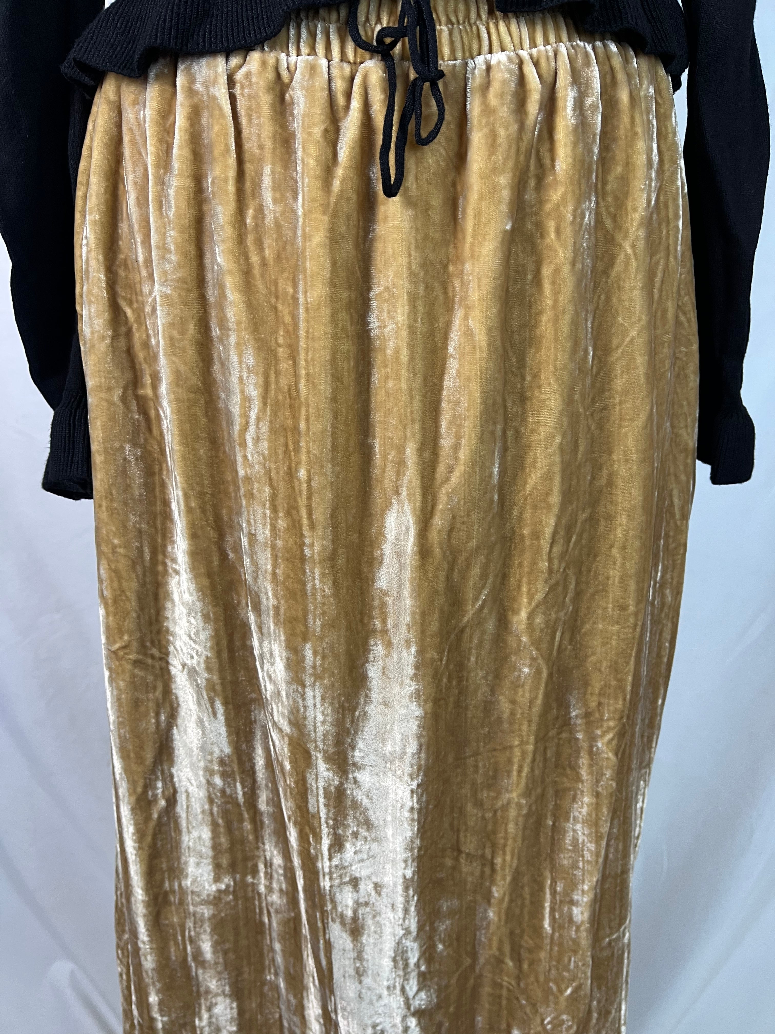 camel beige soft velvet calf length elastic waistband pocketless skirt.