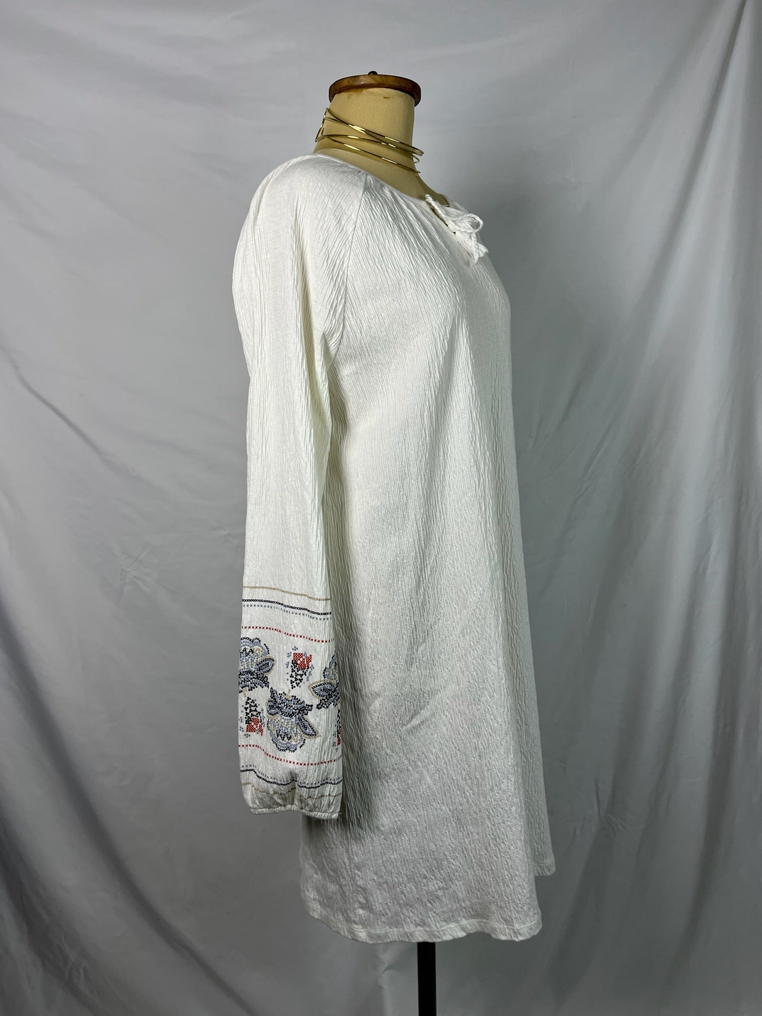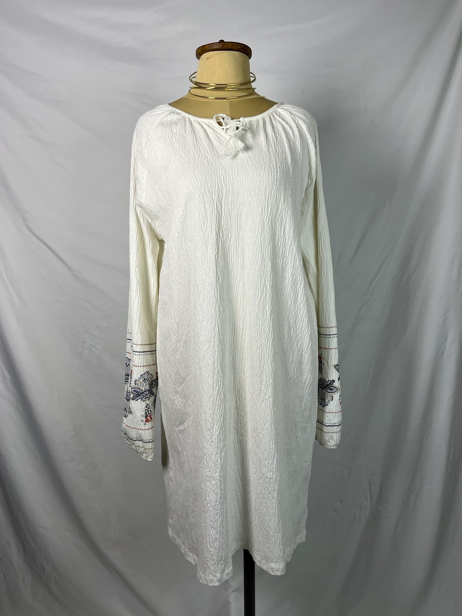 White boho embroidered long sleeves midi lightweight crinkle dress.