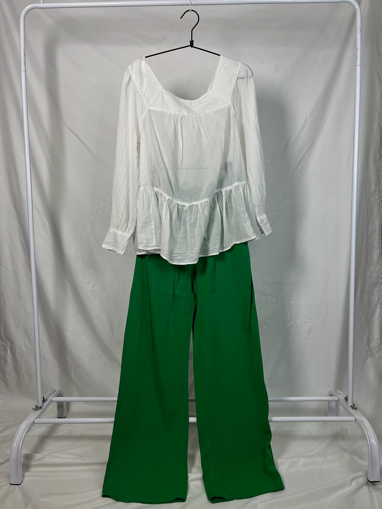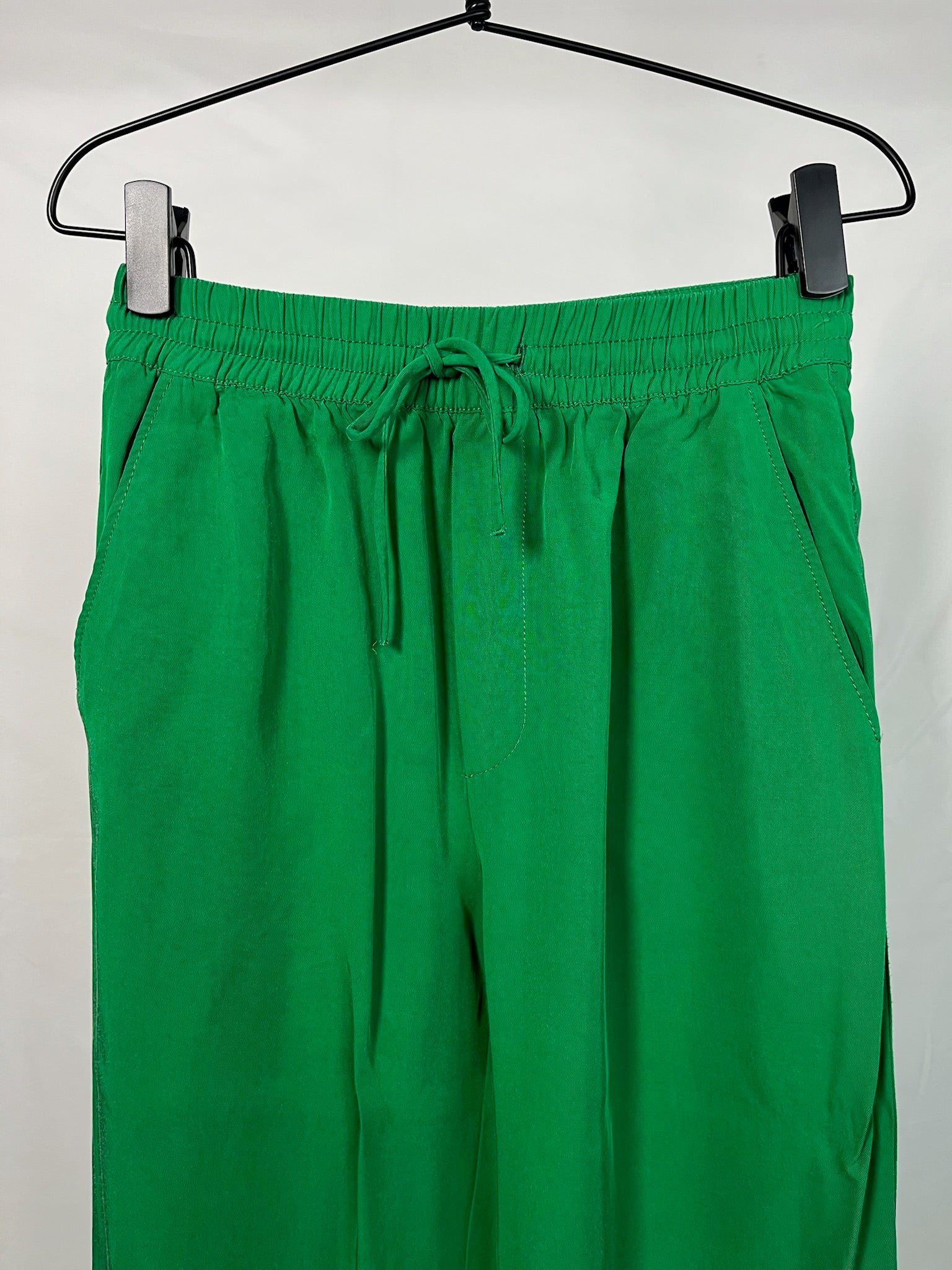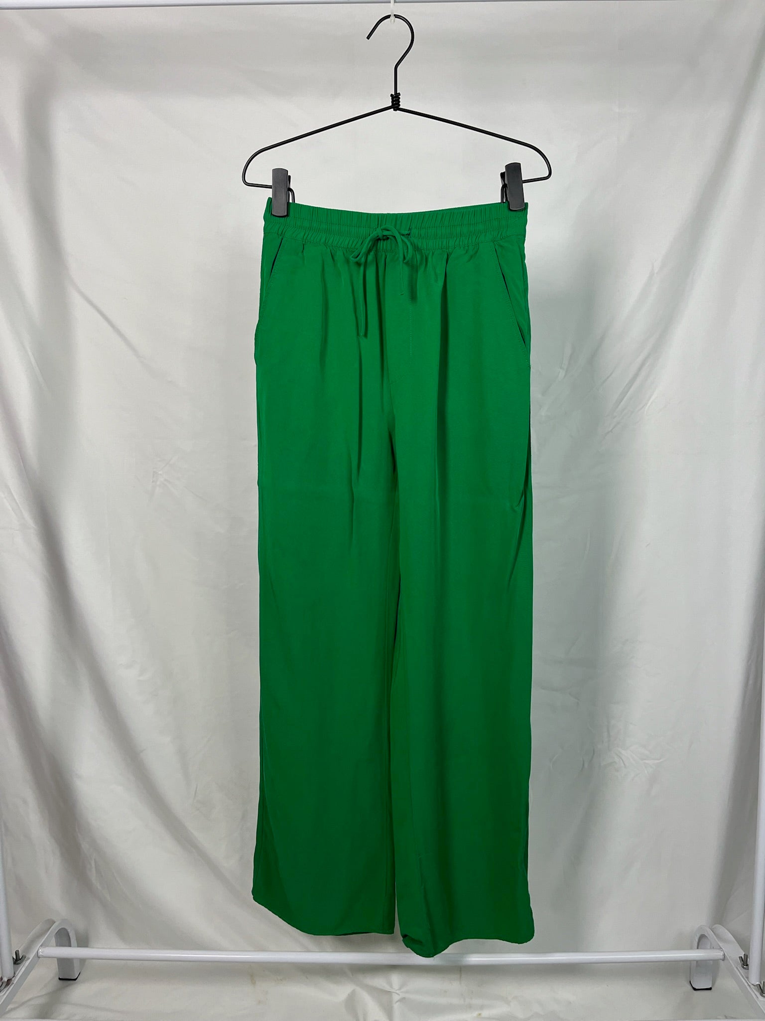 Leafy green relaxed fit wide leg cut drawstring waist full length pants with front and back pockets.