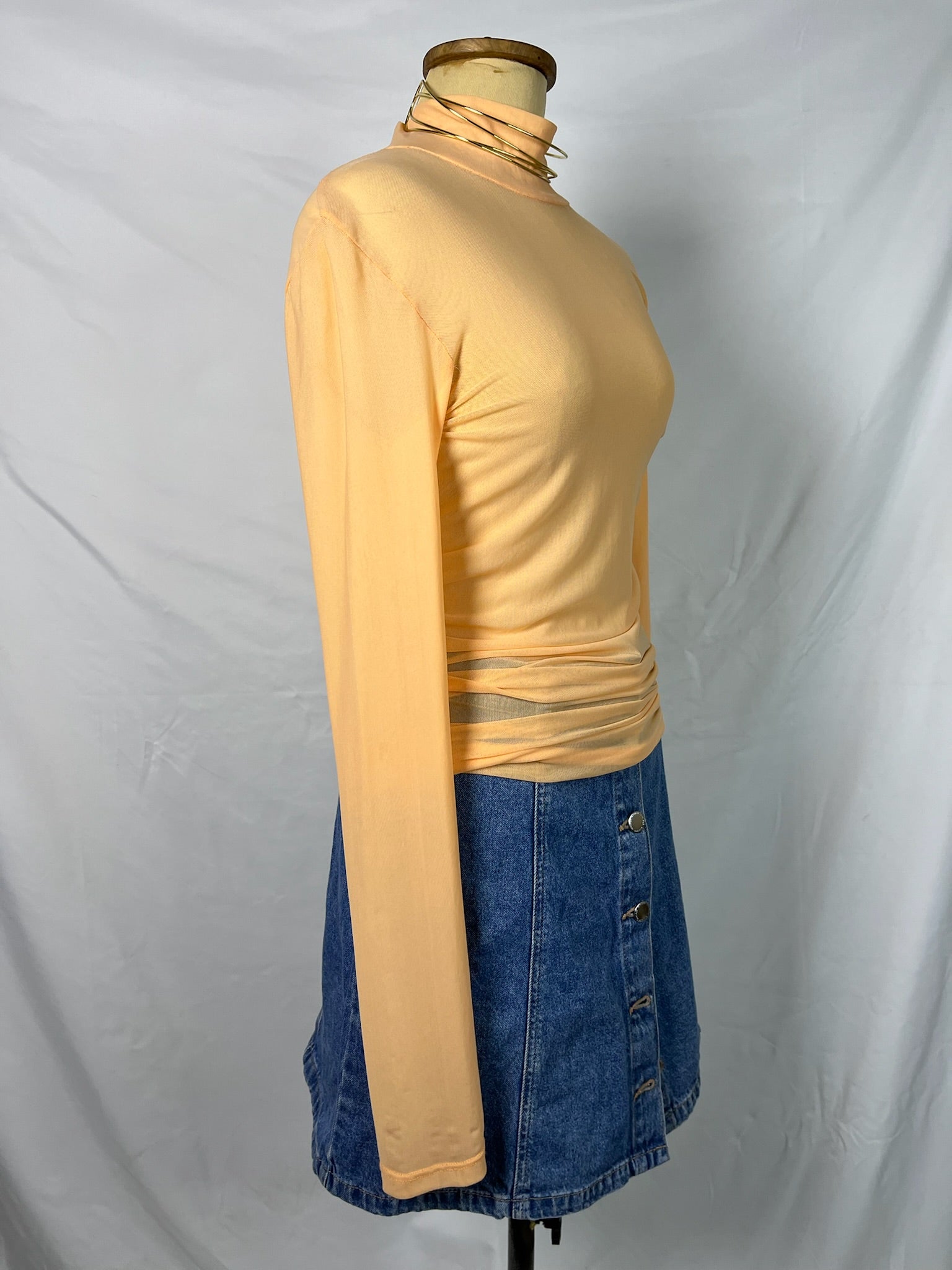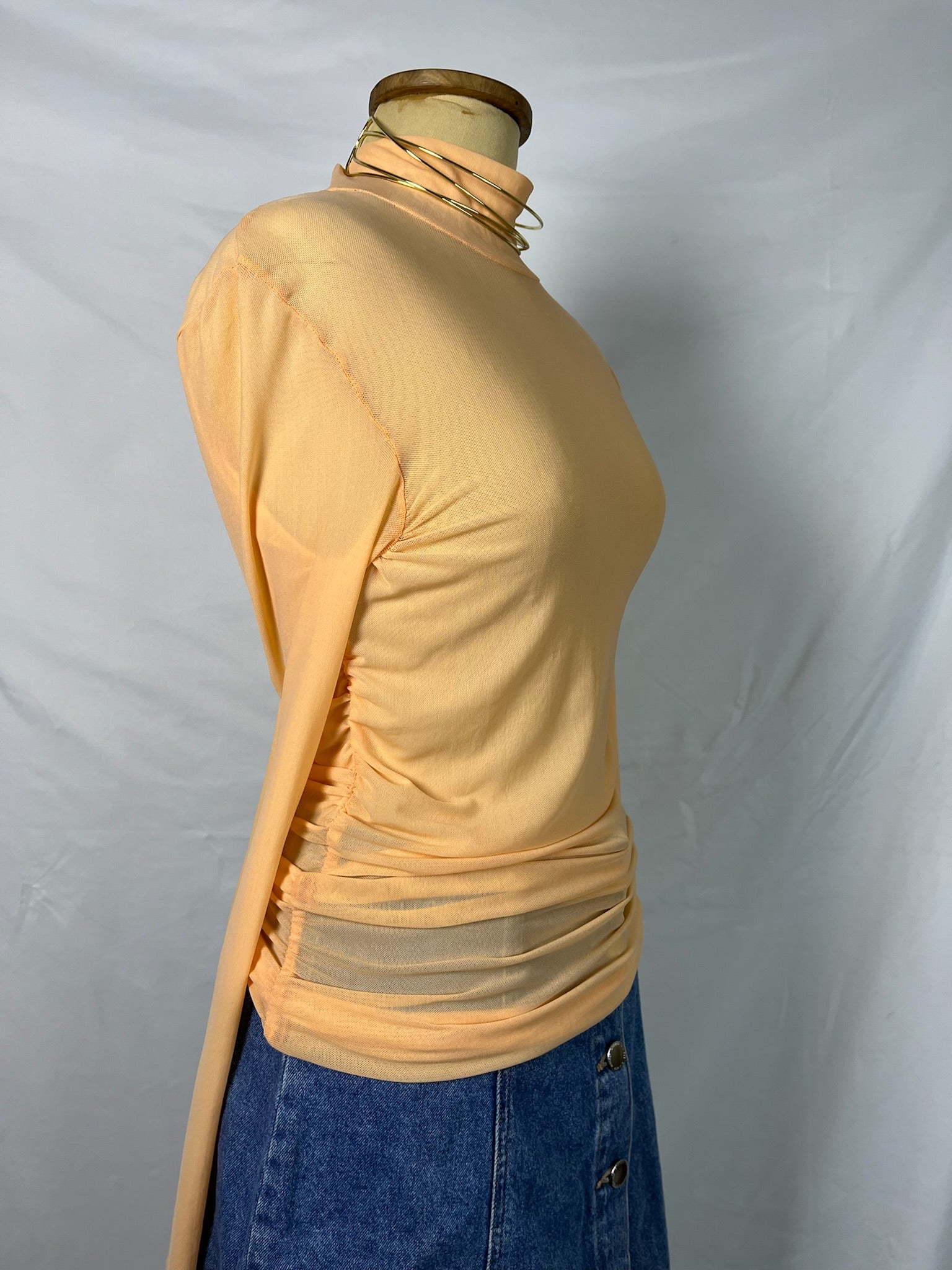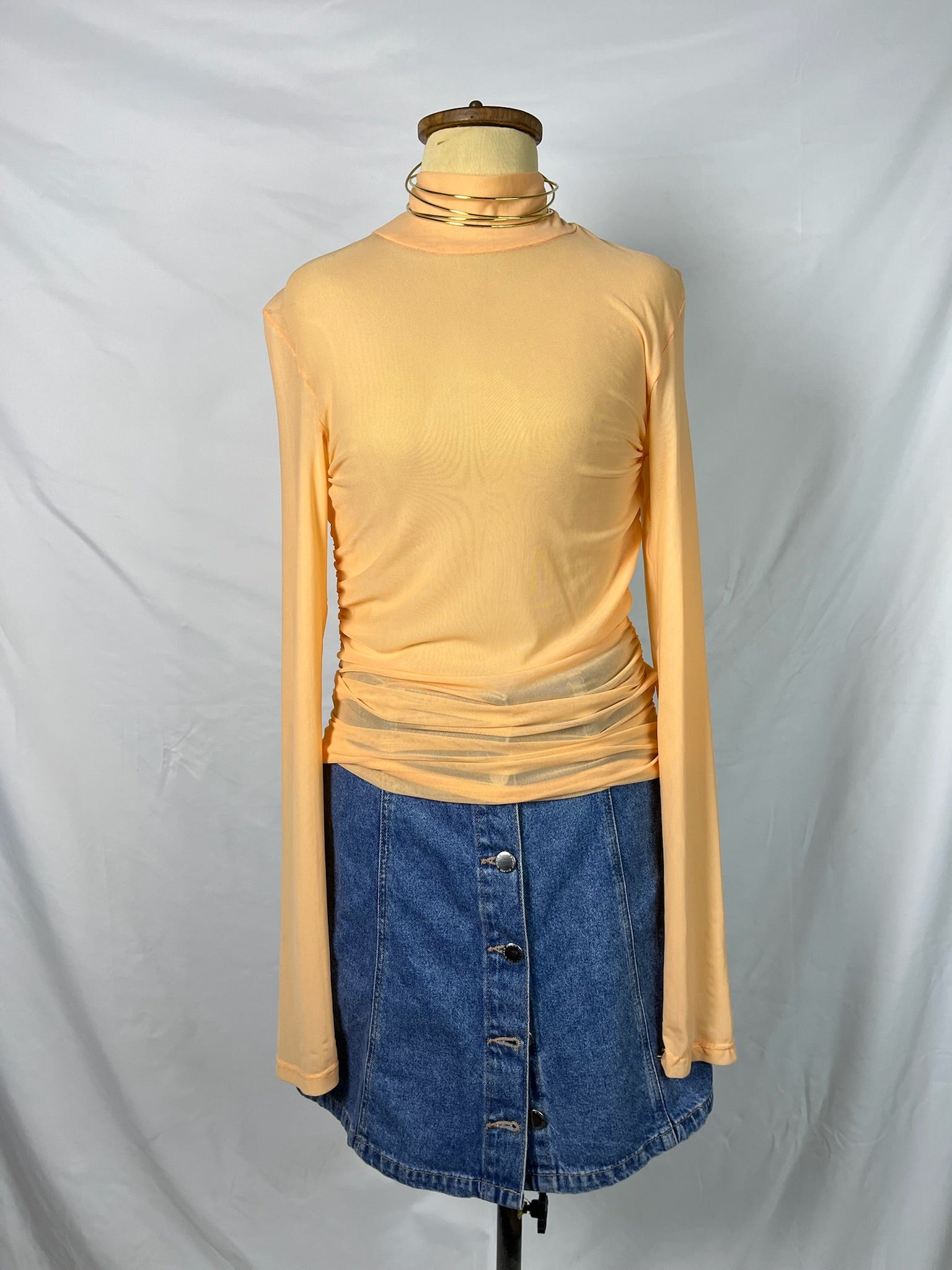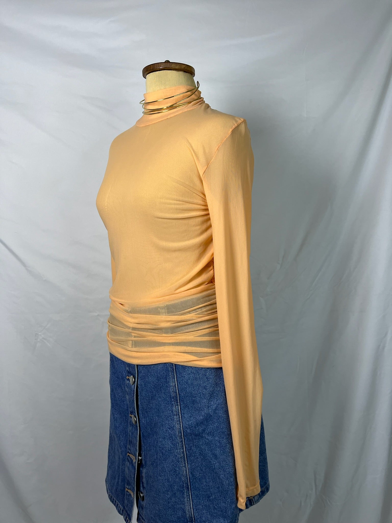 Peach orange long sleeves runched high neckline sheer top.