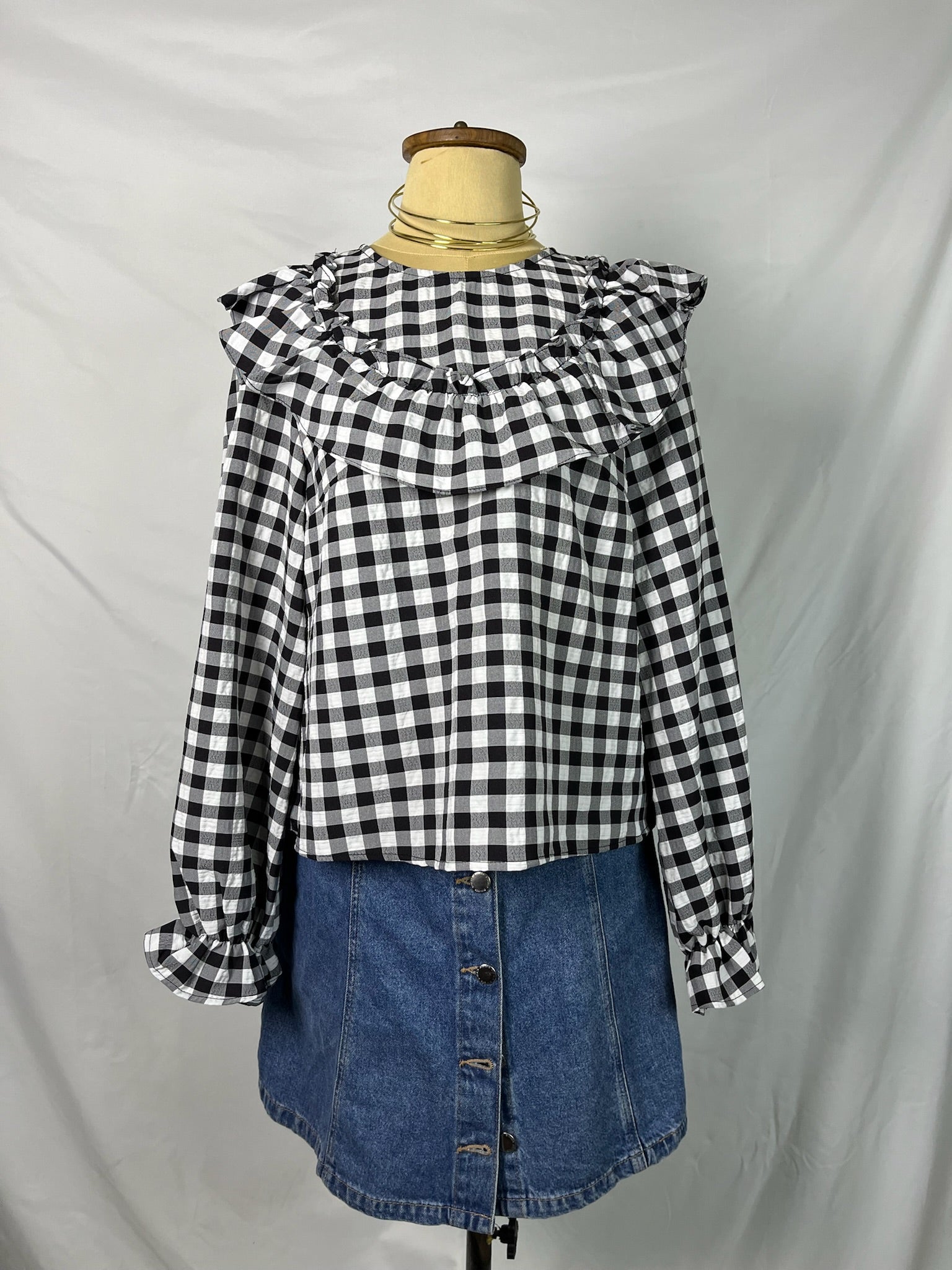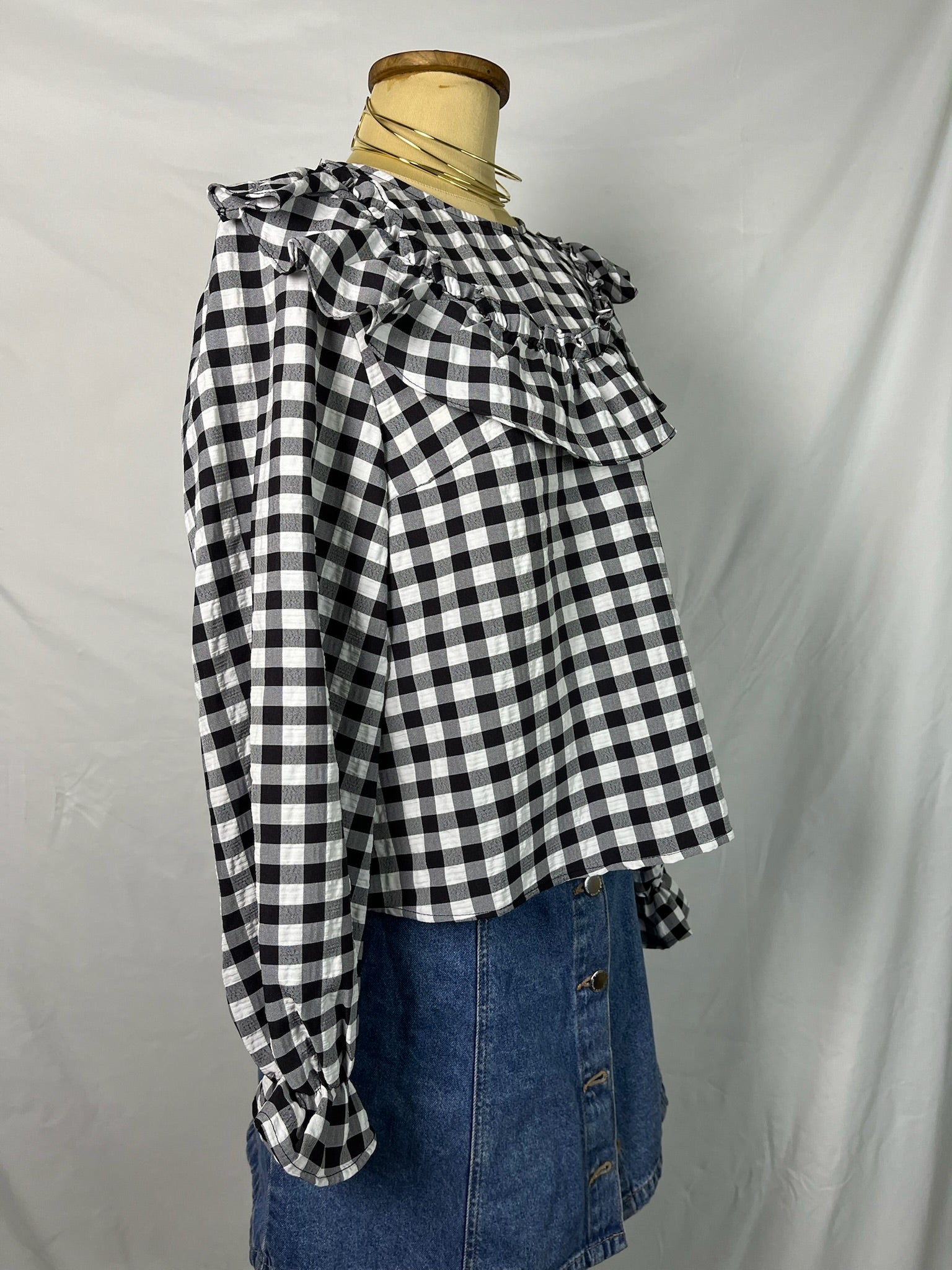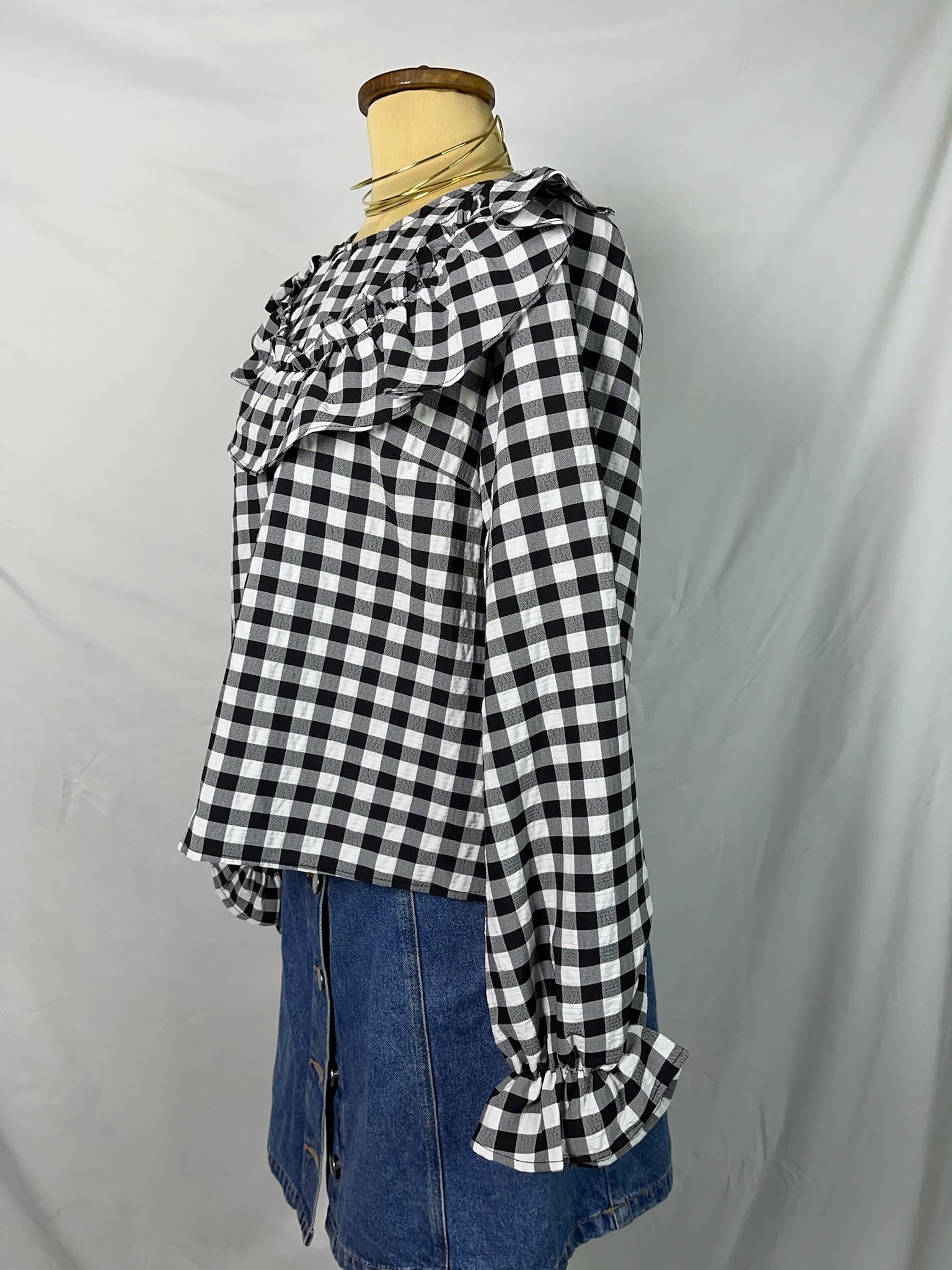 New black and white gingham ruffle neckline long puffed sleeves blouse.