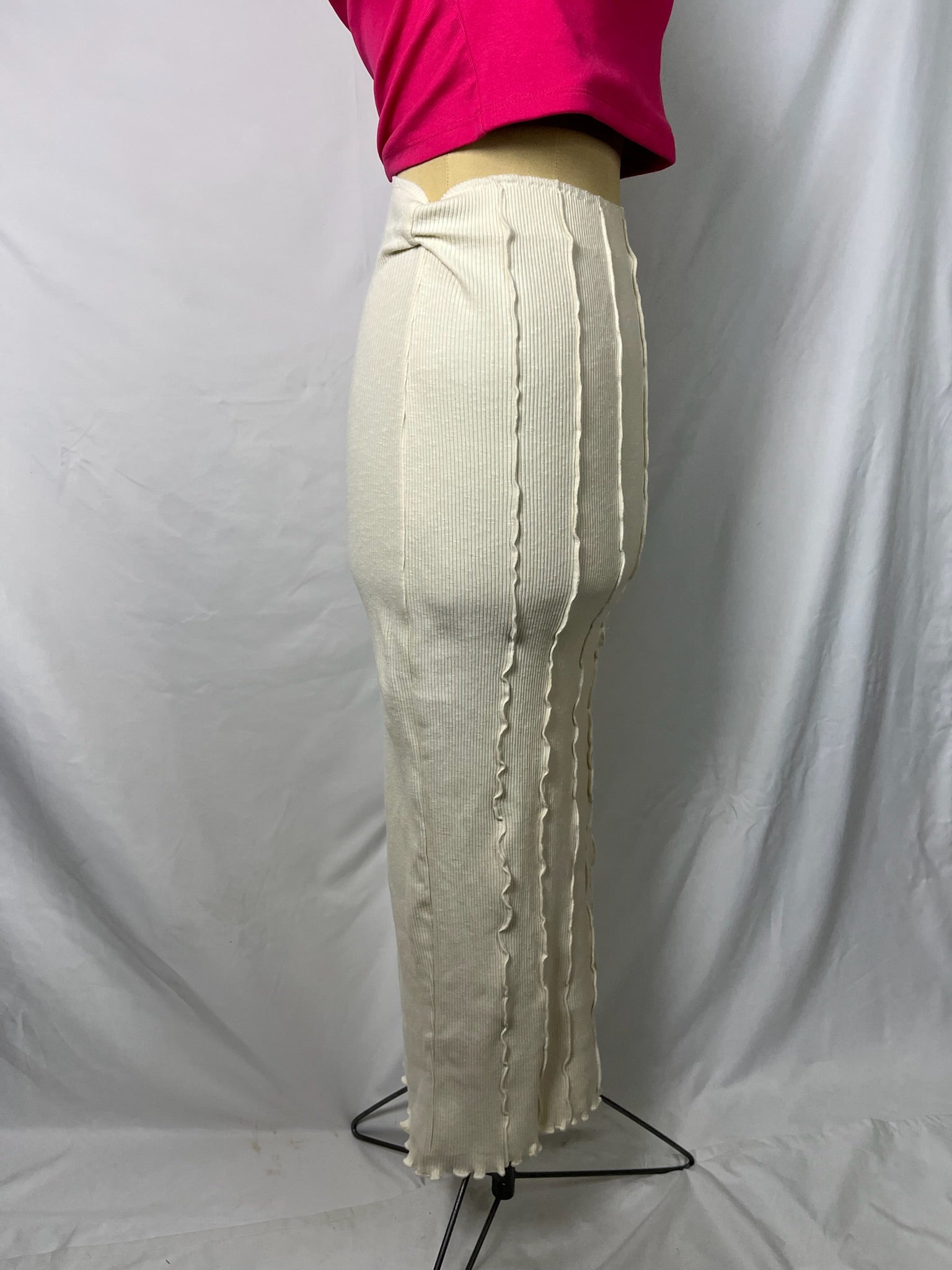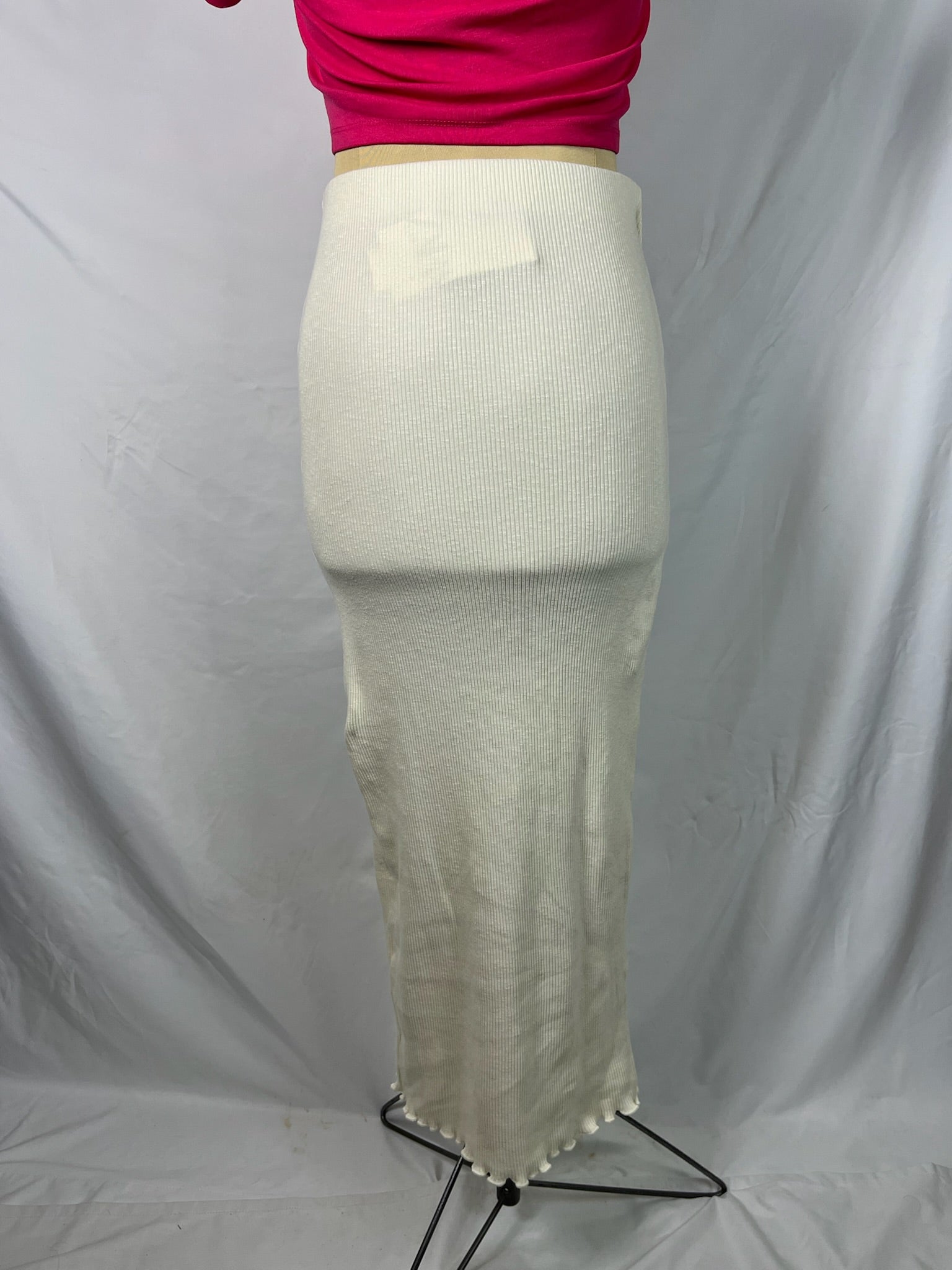 New cream ribbed fabric elastic waistband lettuce hem calf length skirt.