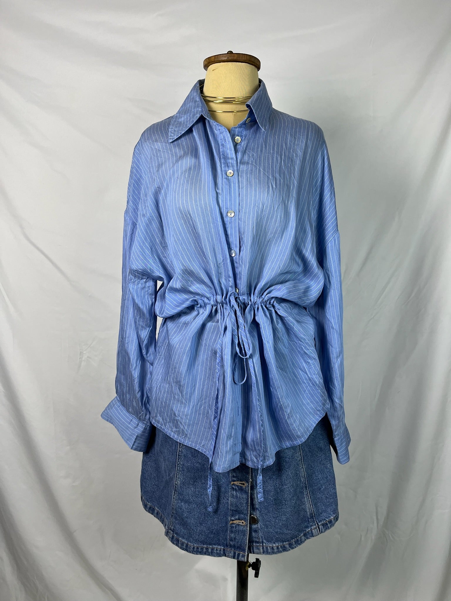 Blue and white striped long sleeves collared cinched drawstring waist to adjust from flowy to fitted button up blouse.