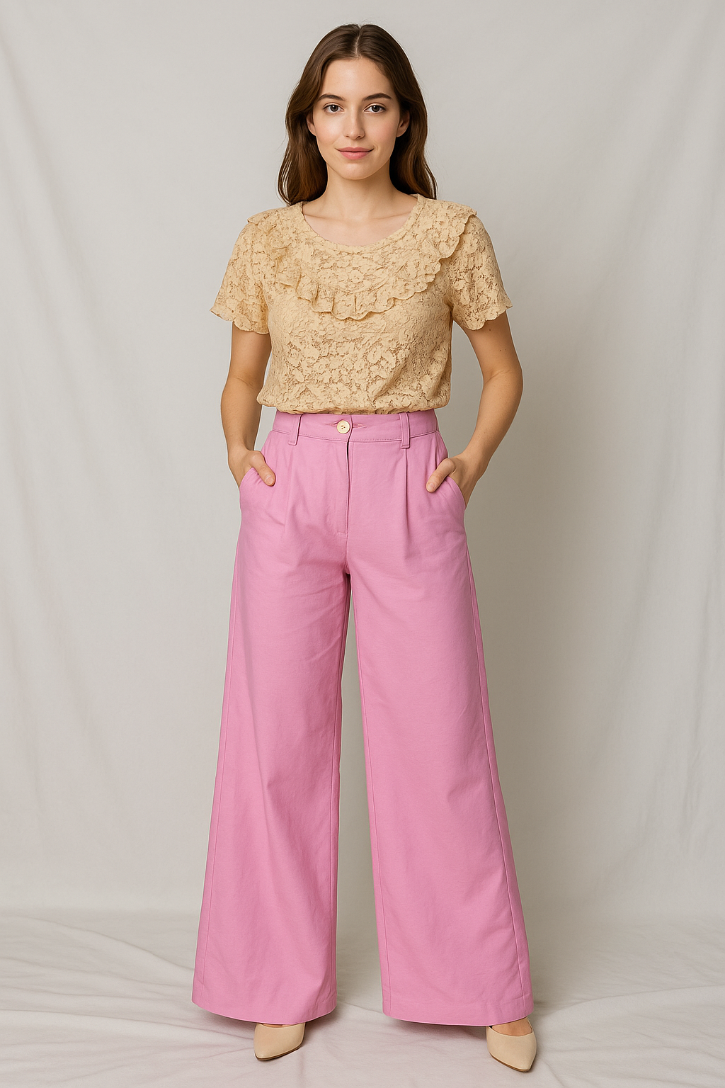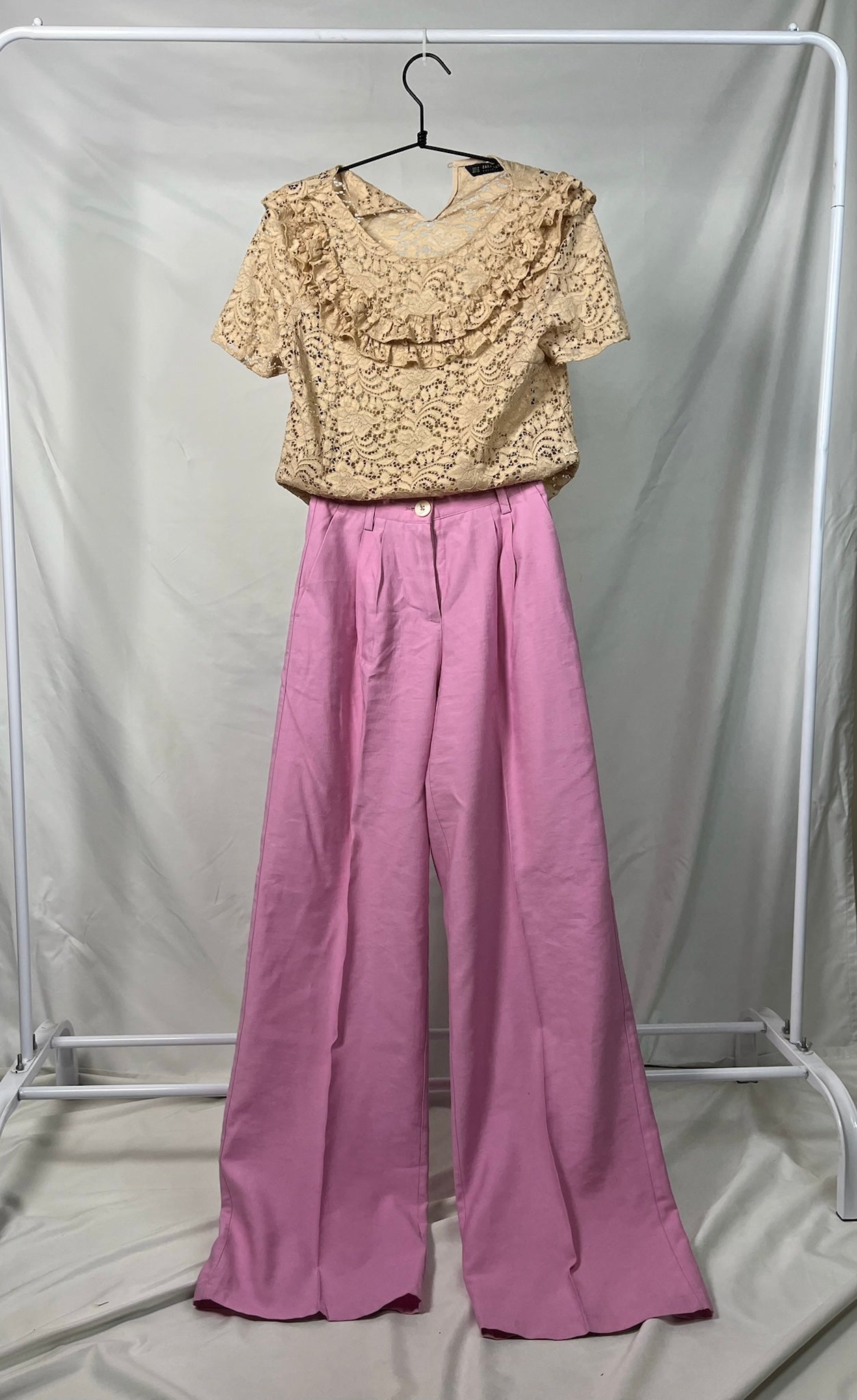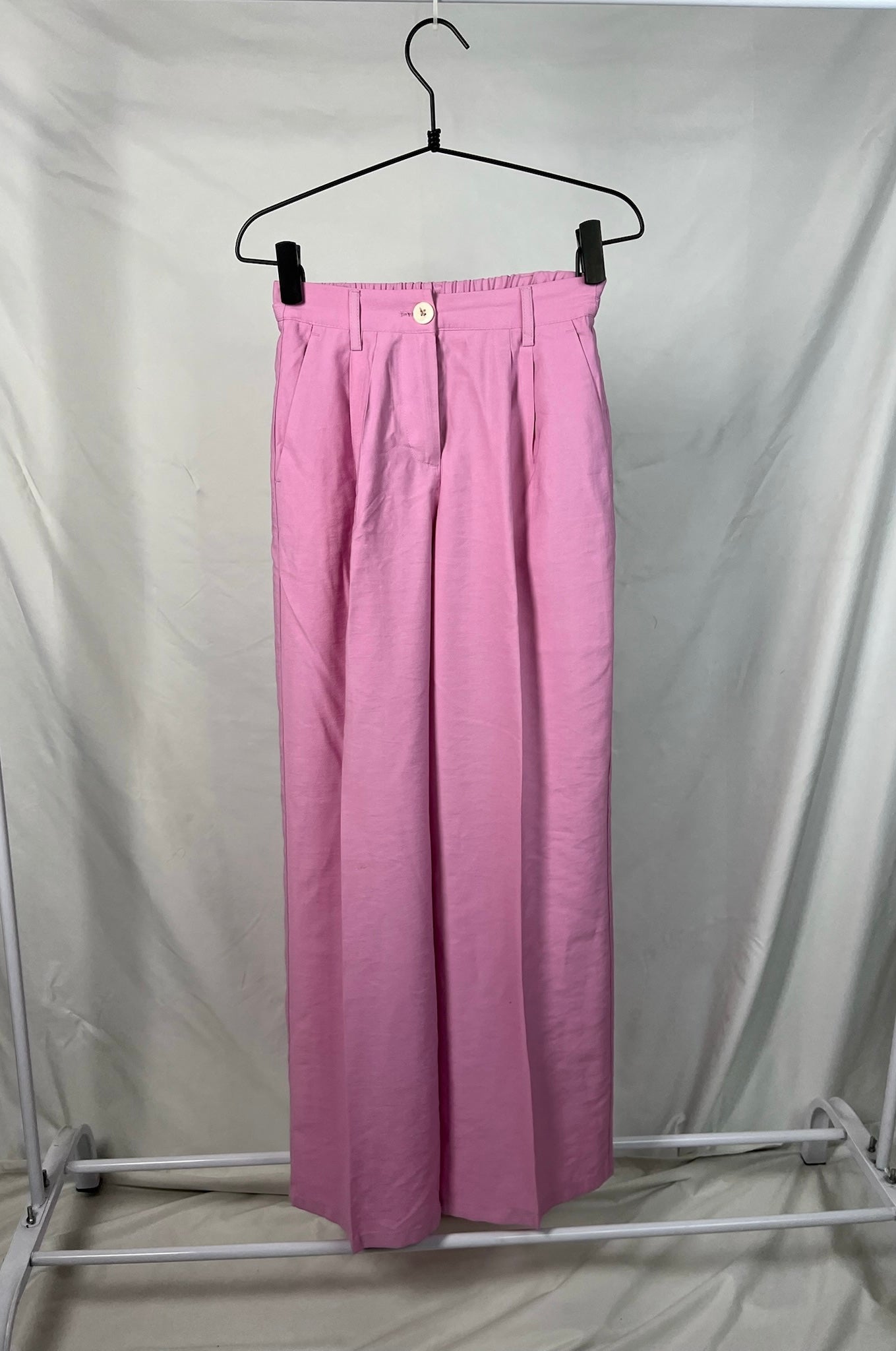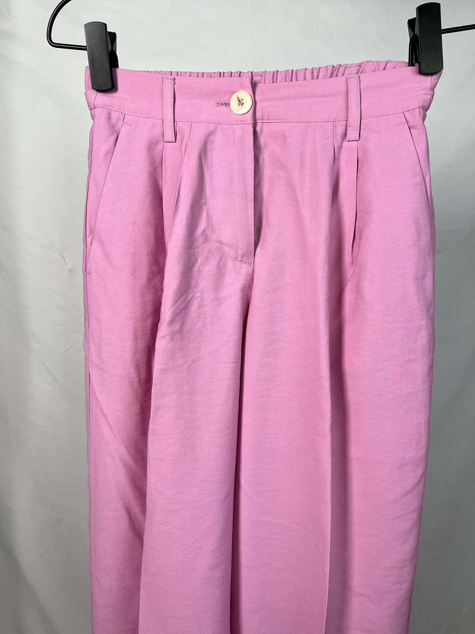 Bubblegum pink high waisted with with front pleats a button closure elasticized back wide leg pants.