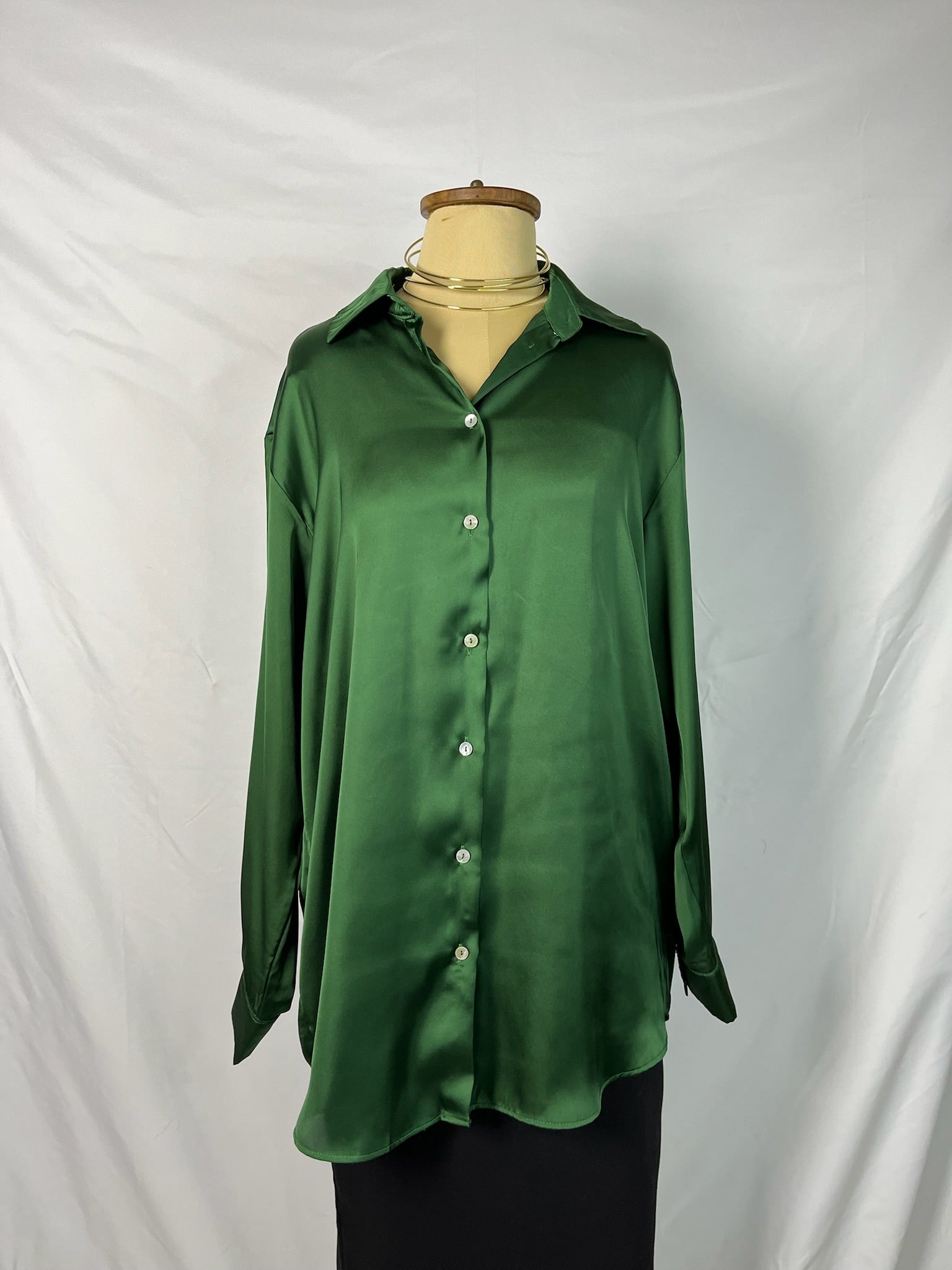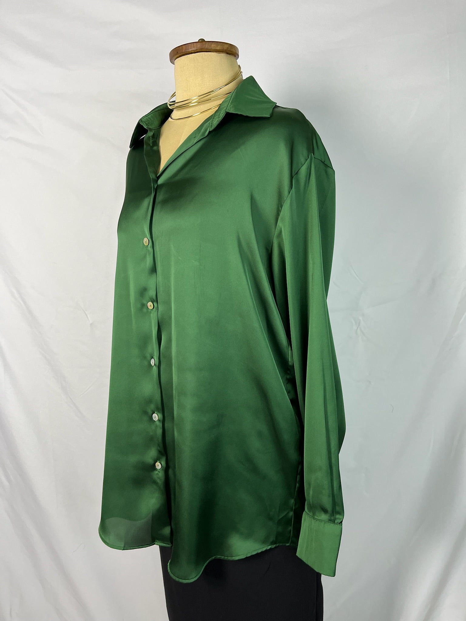 Emerald green long sleeves satin fabric collared button down classical shirt that might be a little oversized that it could fit a petite medium.