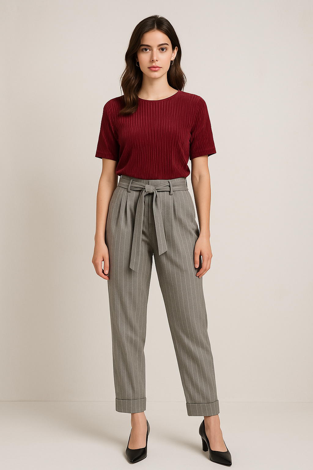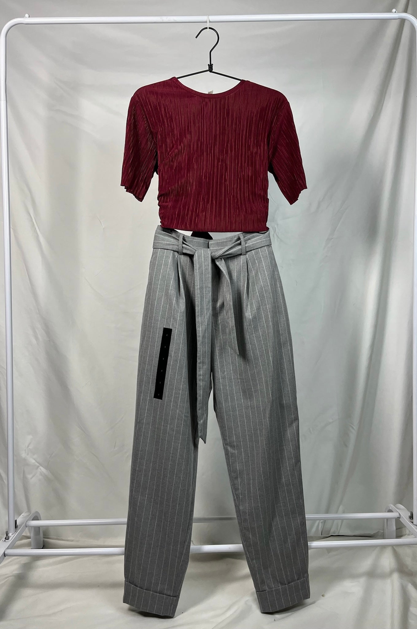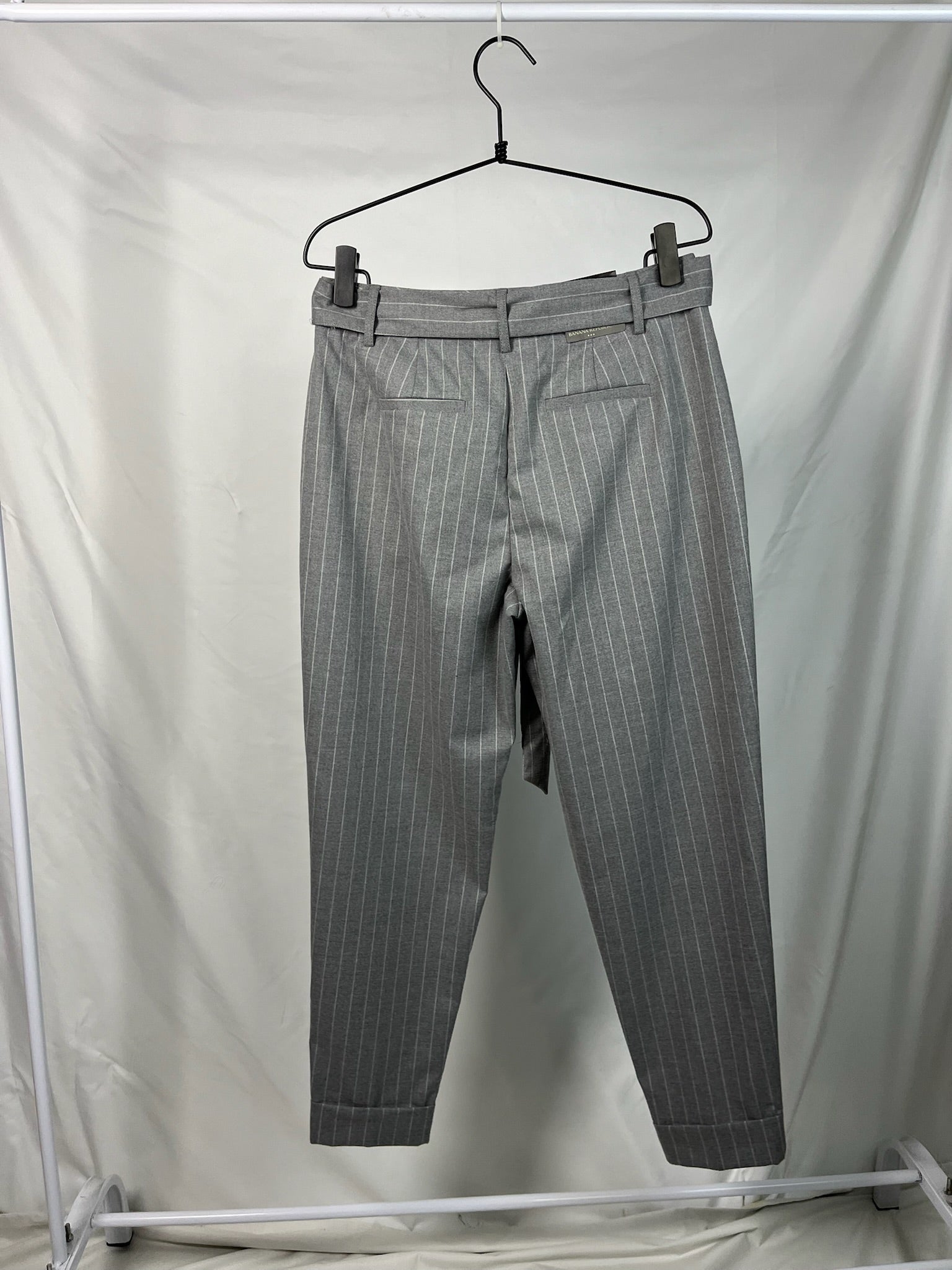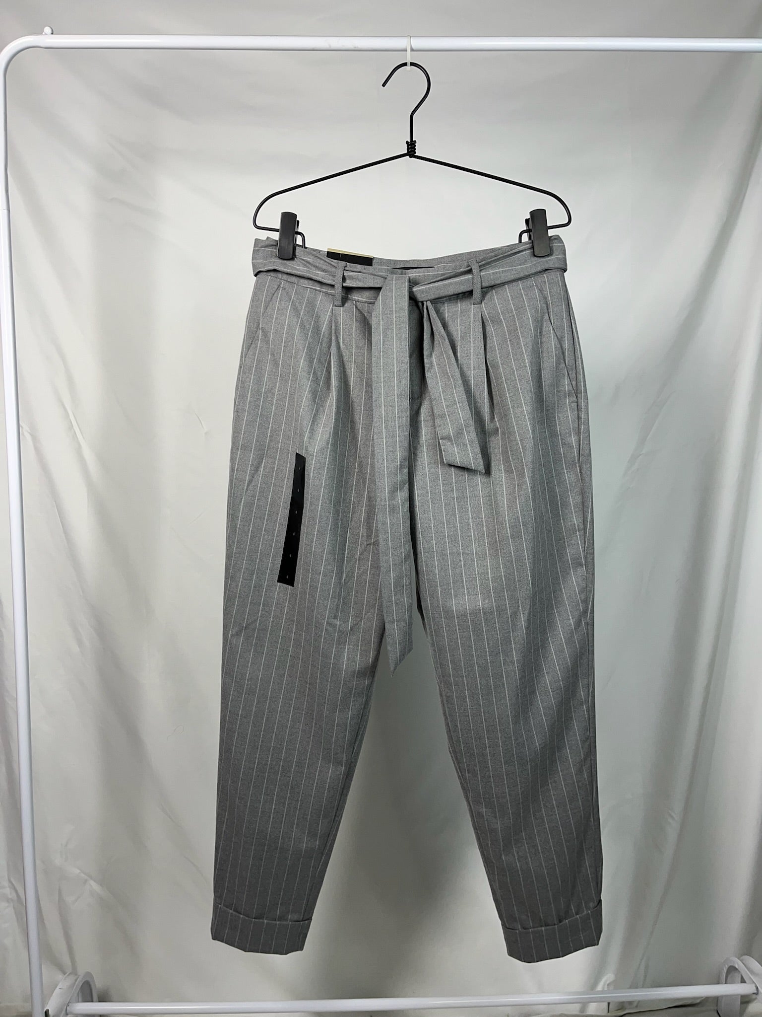 New Light gray with white pinstripes patterns paper bag waist with a self tie belt with cuff hems classic pants.