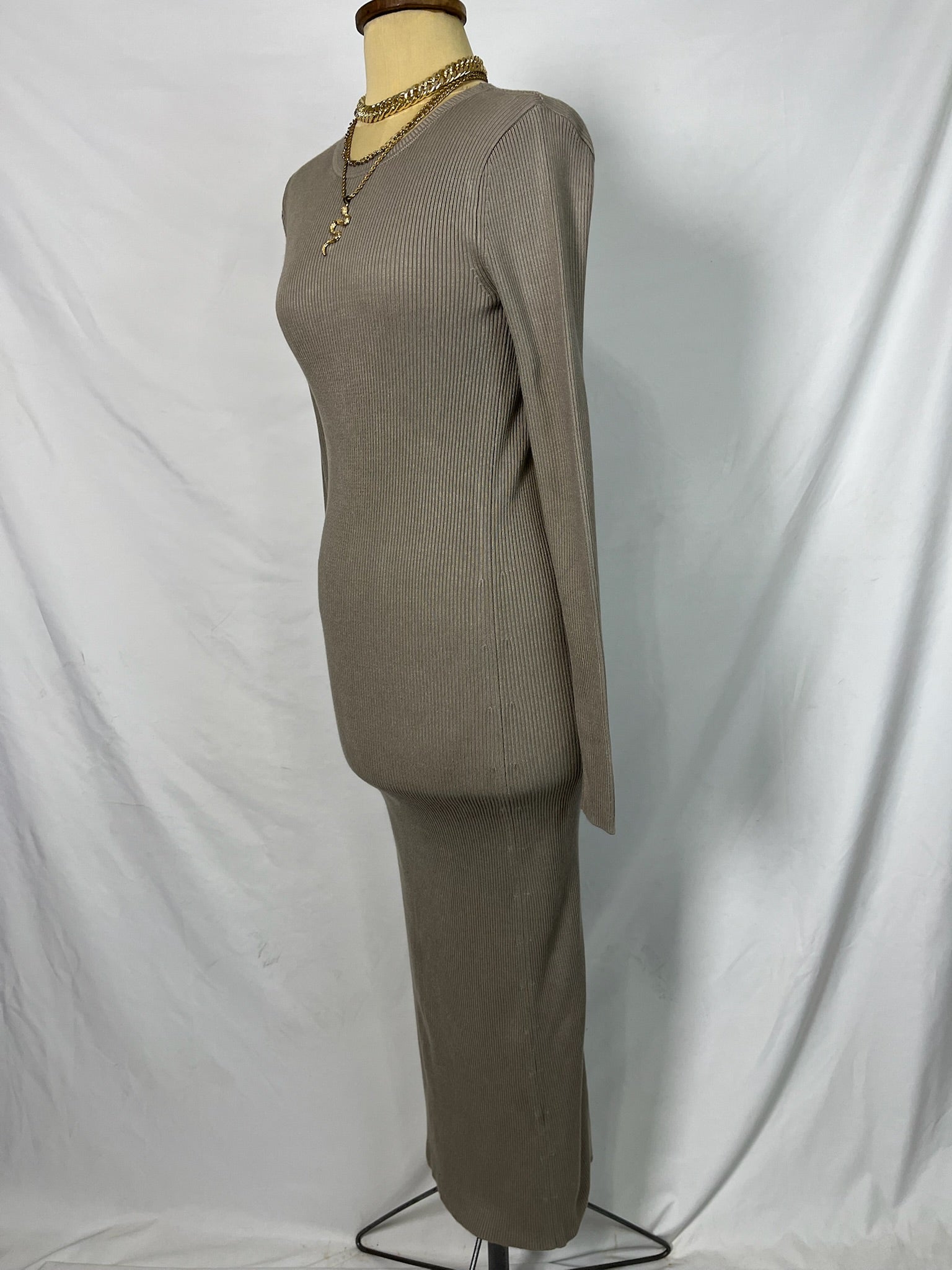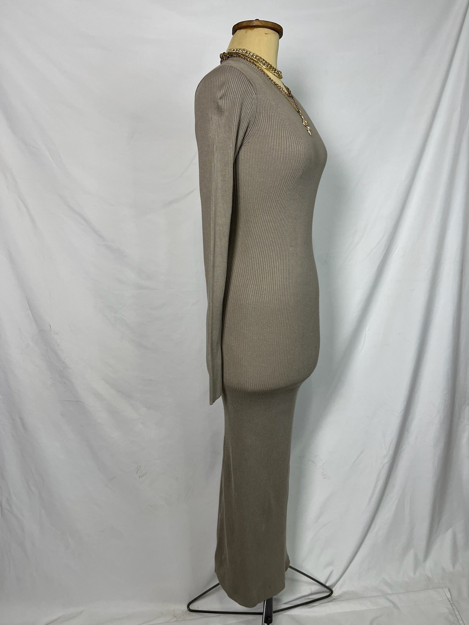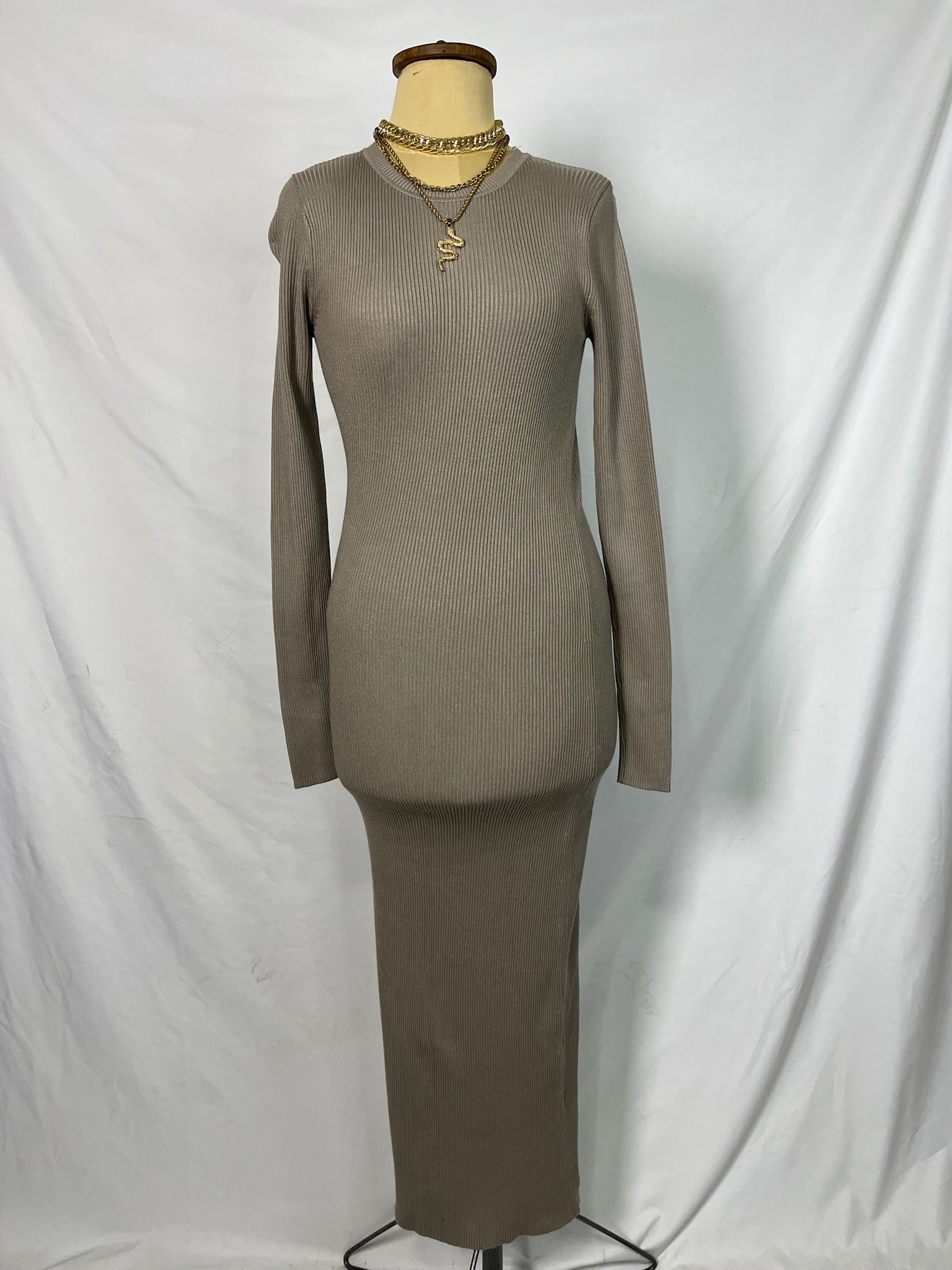 Taupe soft ribbed knit with a stretch yet hugging, crew neckline, long sleeves, maxi length dress.