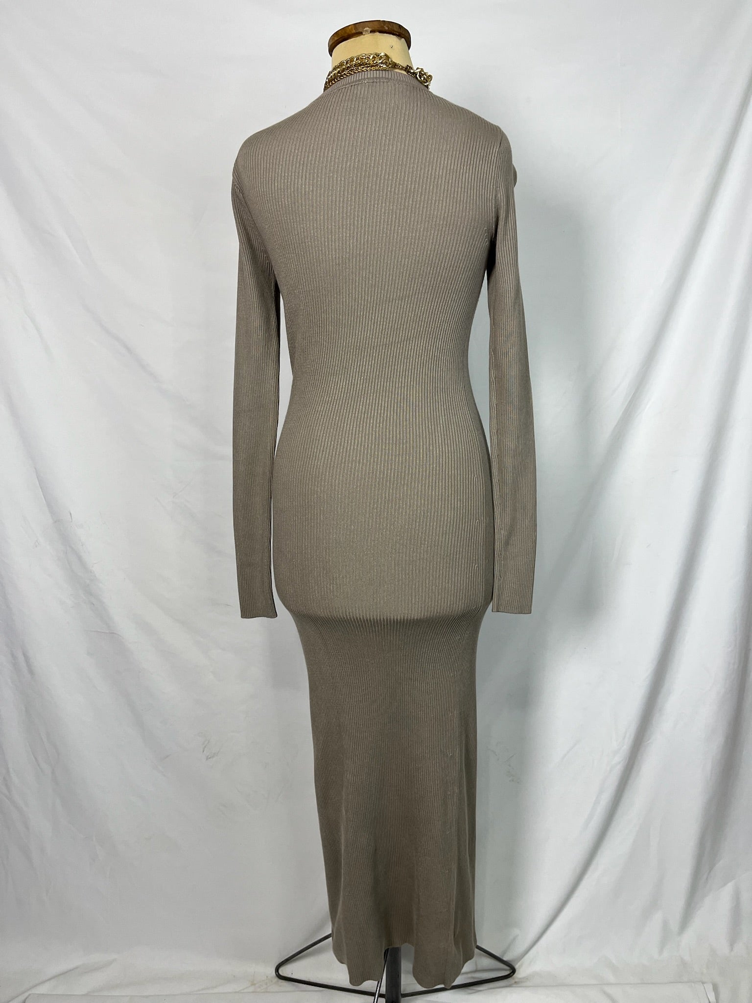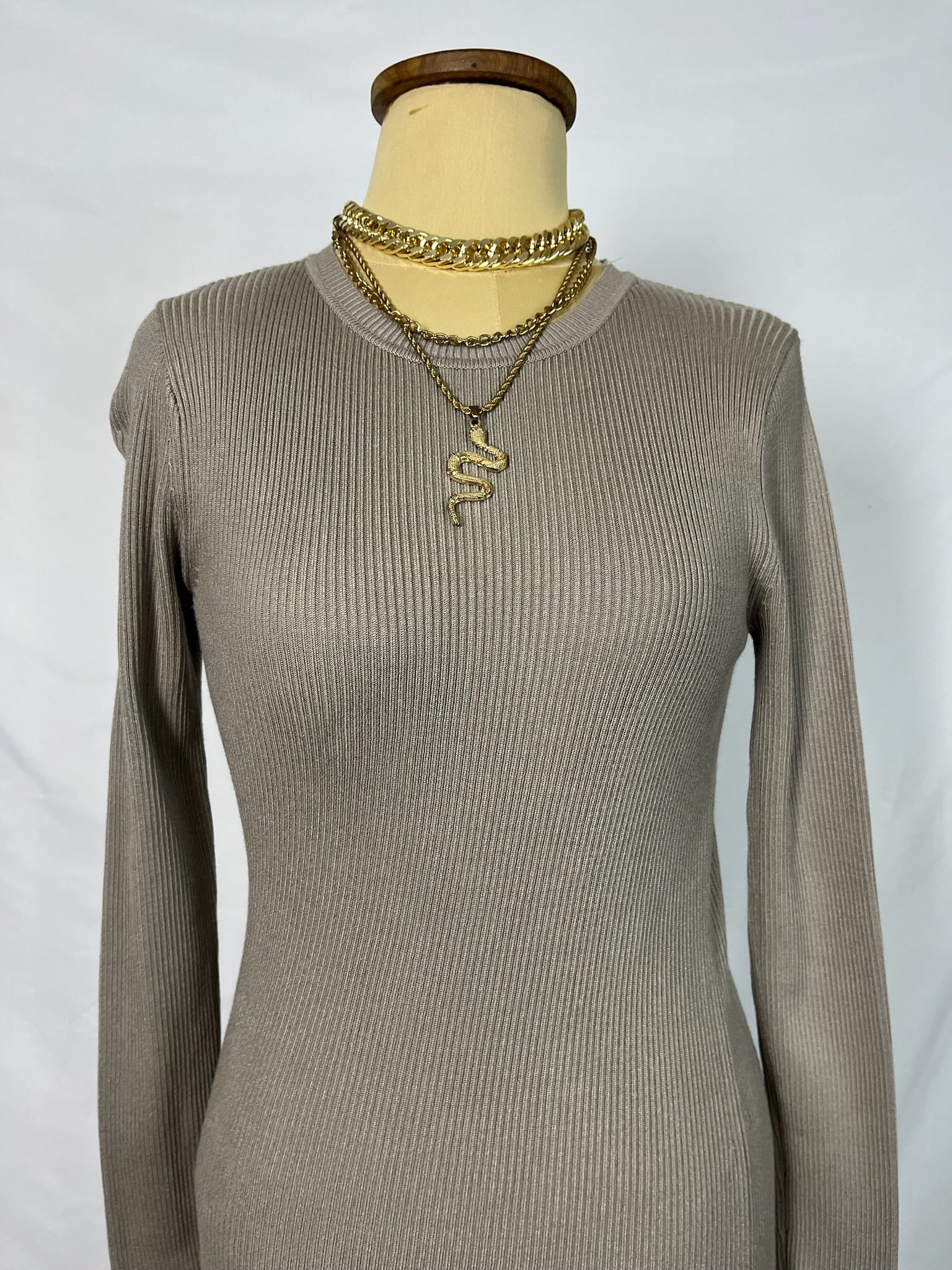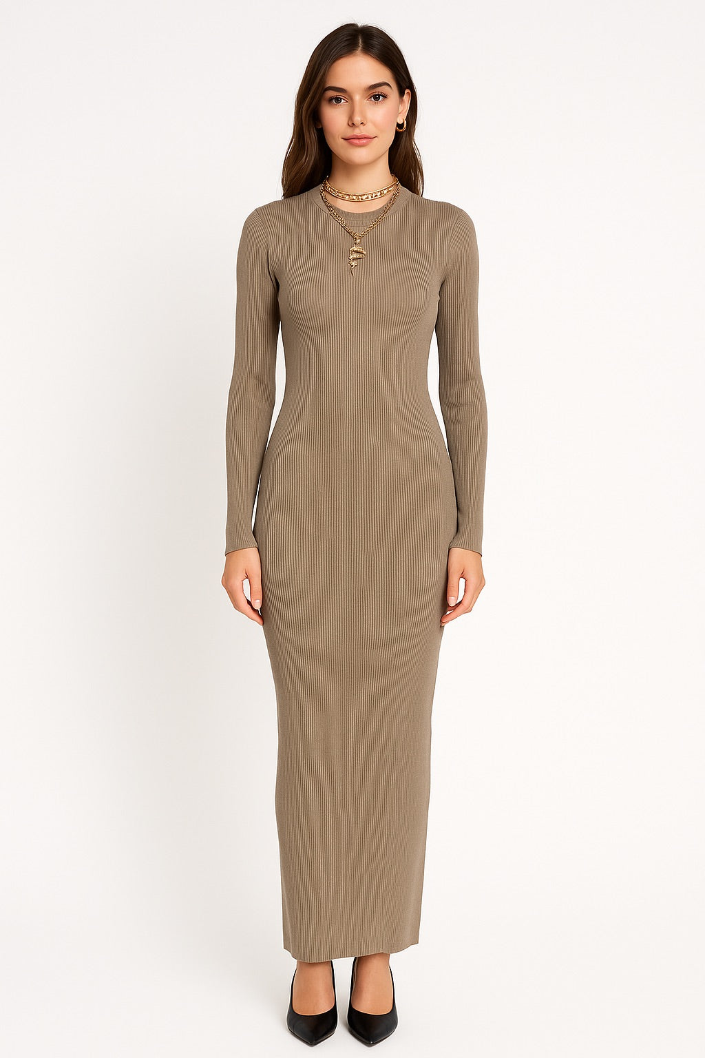 Taupe soft ribbed knit with a stretch yet hugging, crew neckline, long sleeves, maxi length dress.
