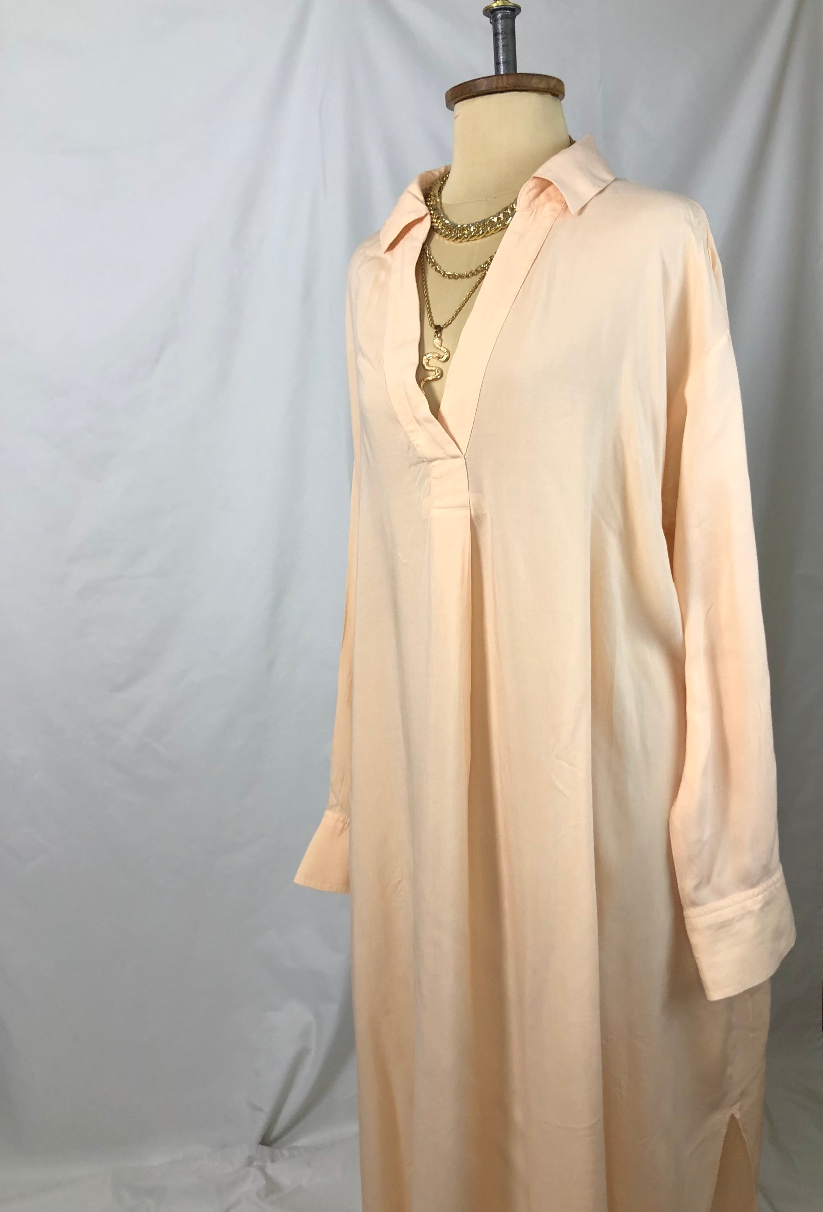 peach full length V-neck long sleeves collared dress with side slits.