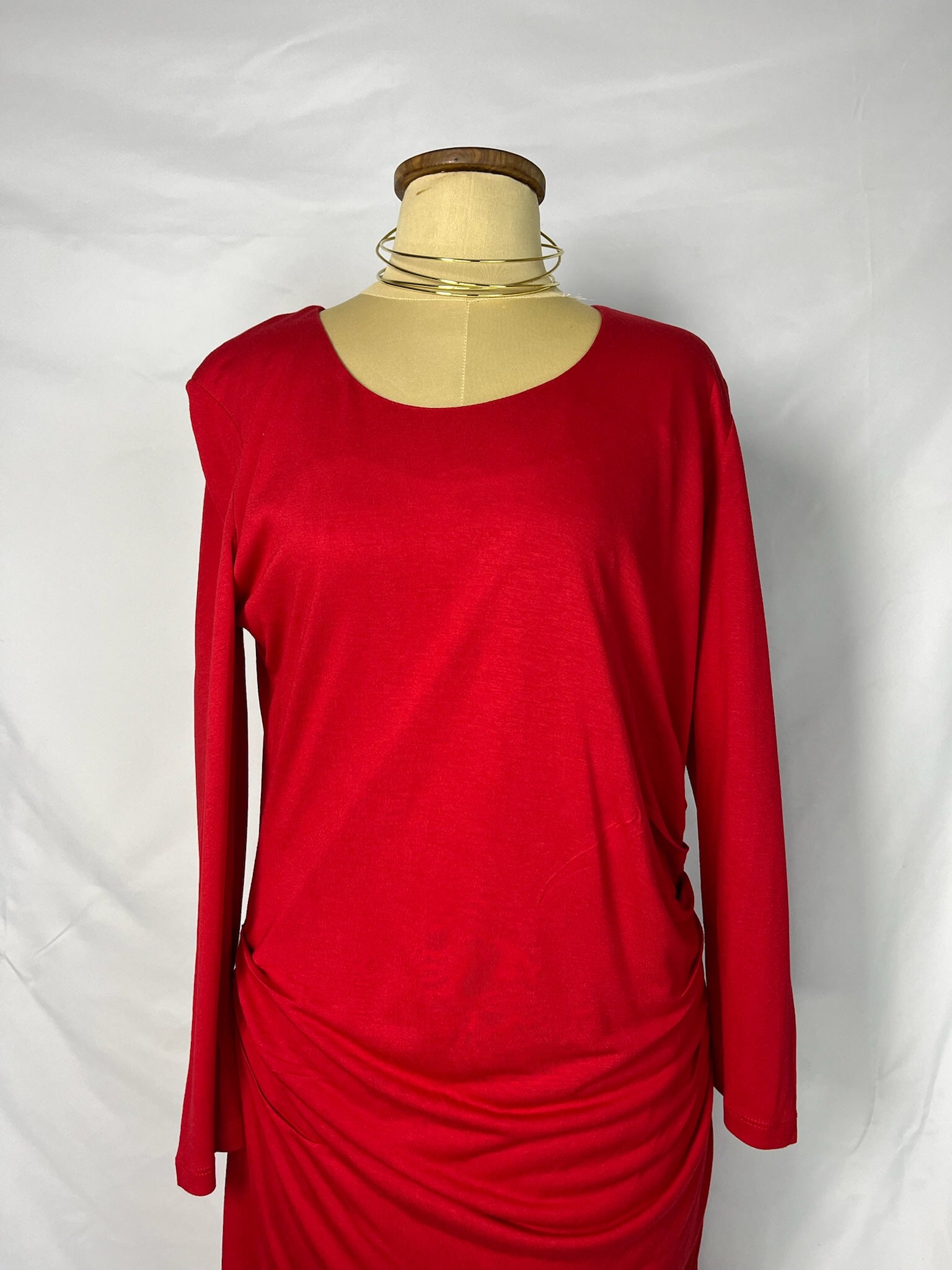 New red classic scoop neckline long sleeves, pleated around the waist dress.