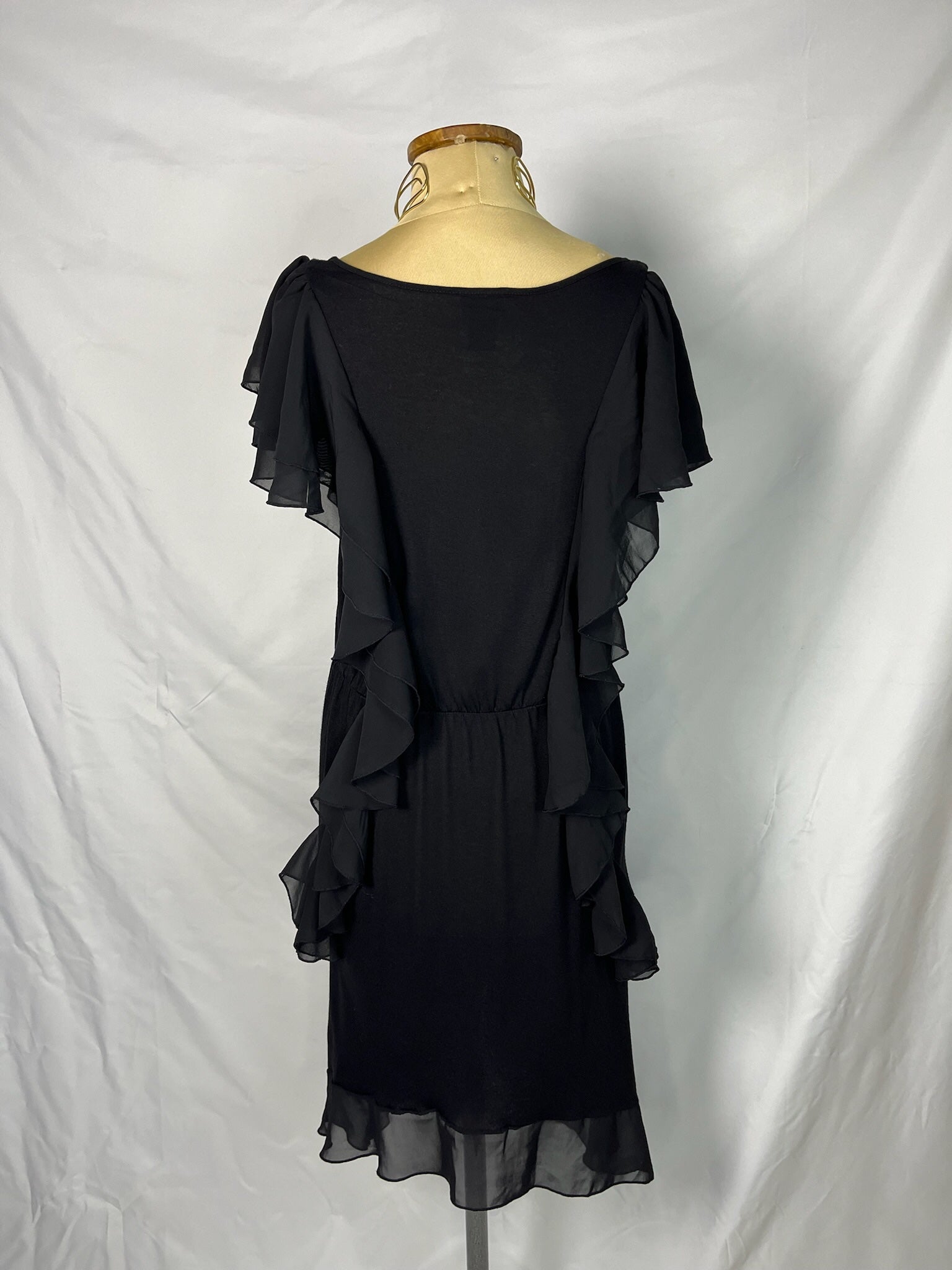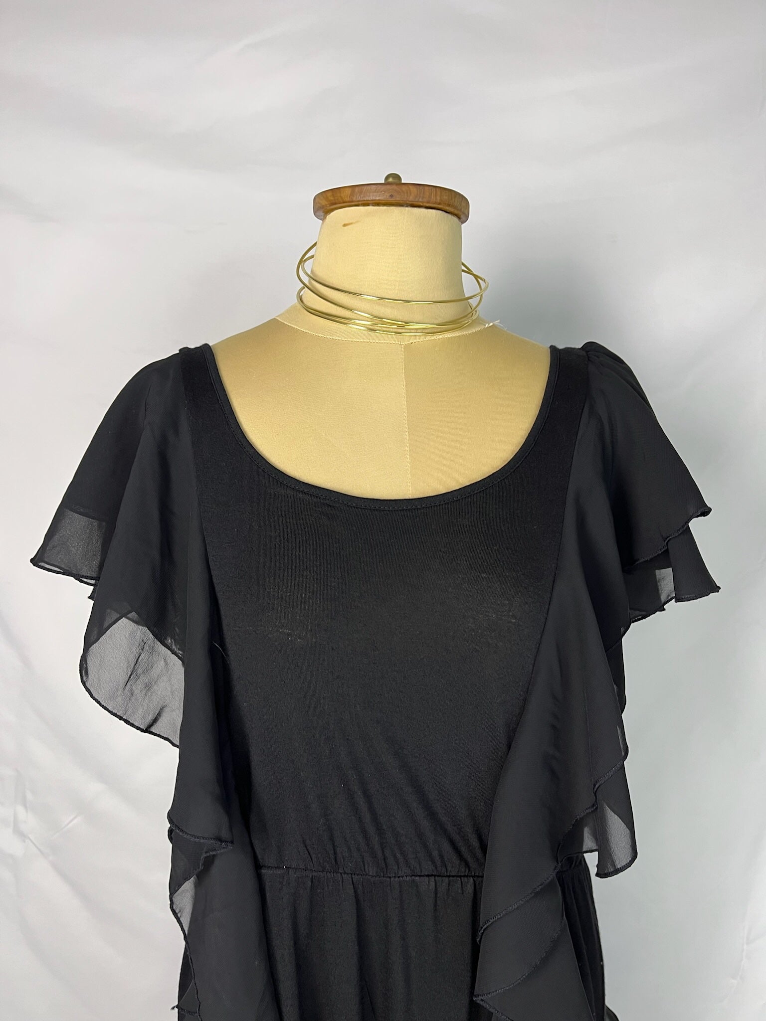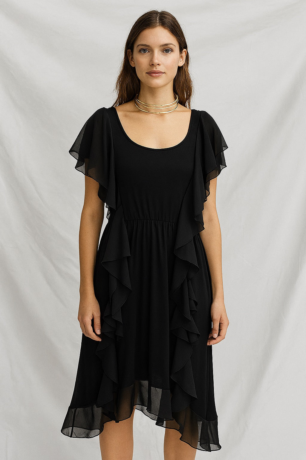 Black ruffle flutter sleeve midi chiffon round neck dress.