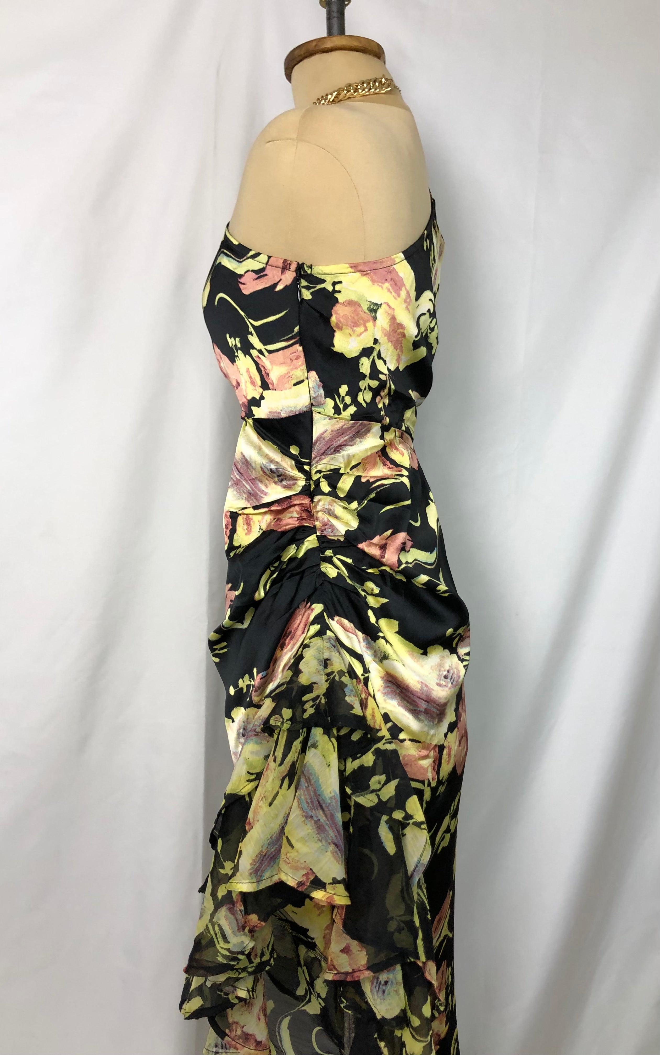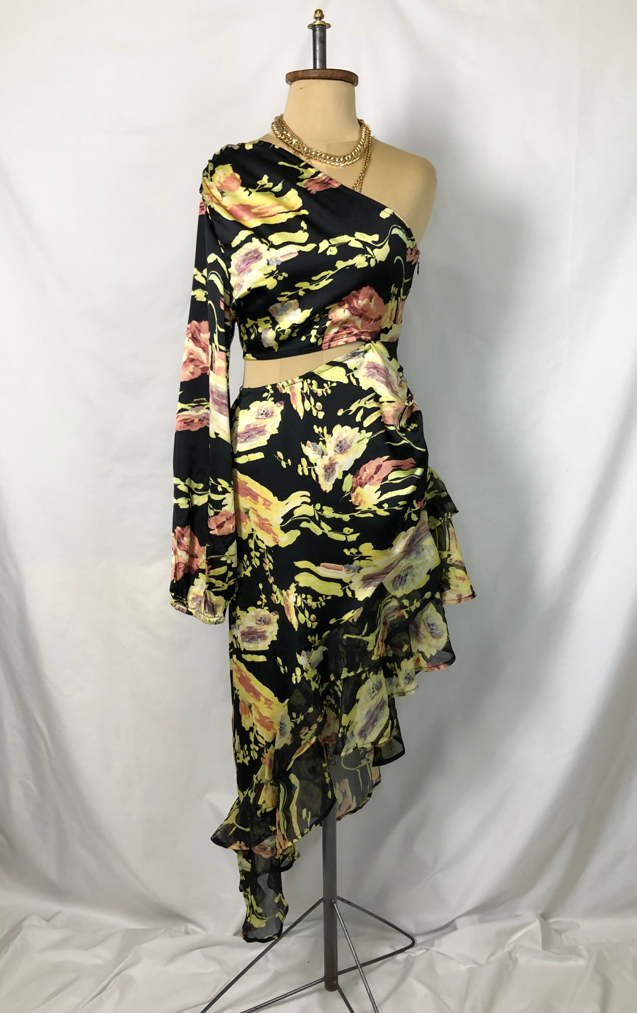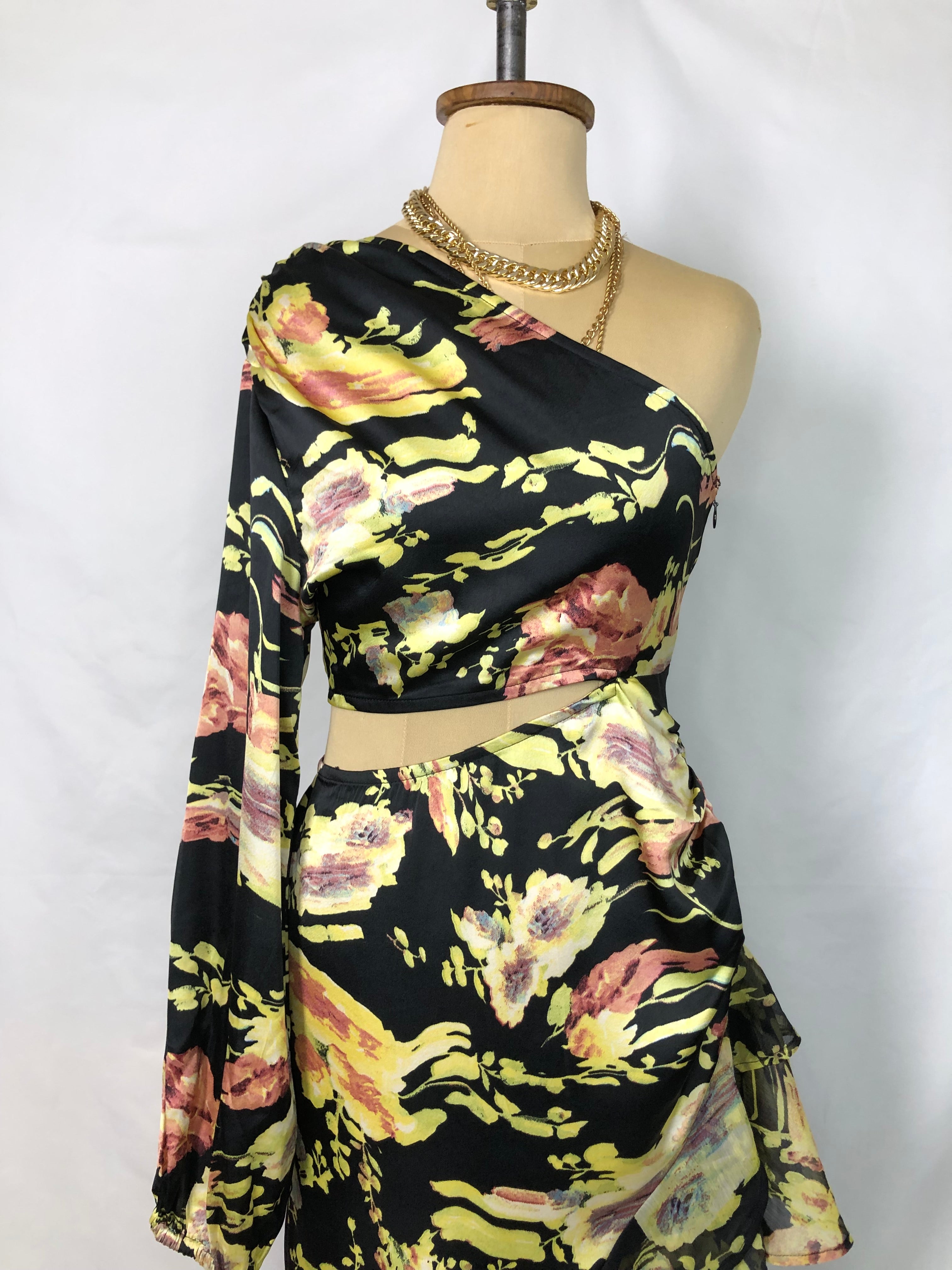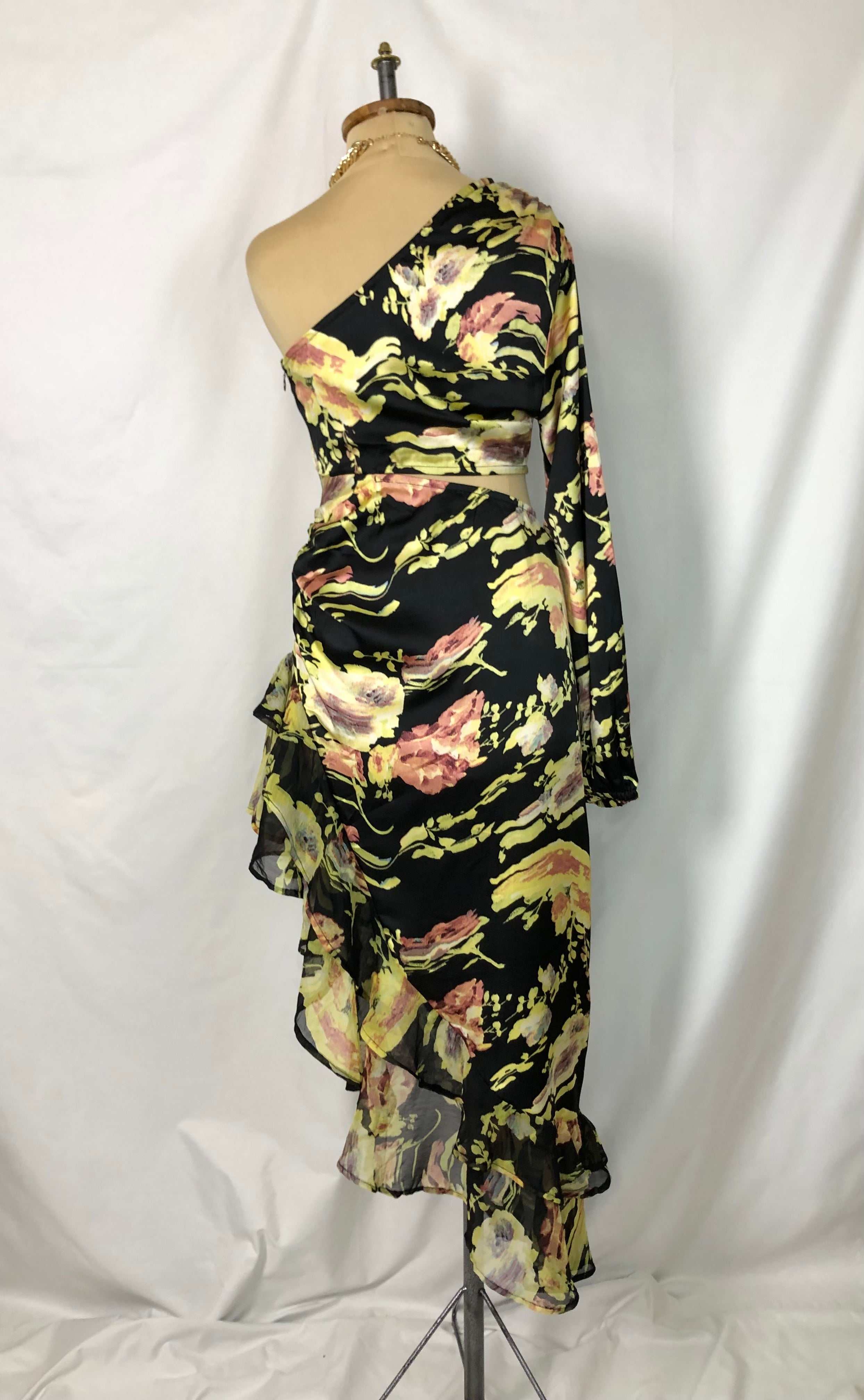 Black with yellow flowers scattered all over with one side cut out, one shoulder asymmetrical ruffle dress.