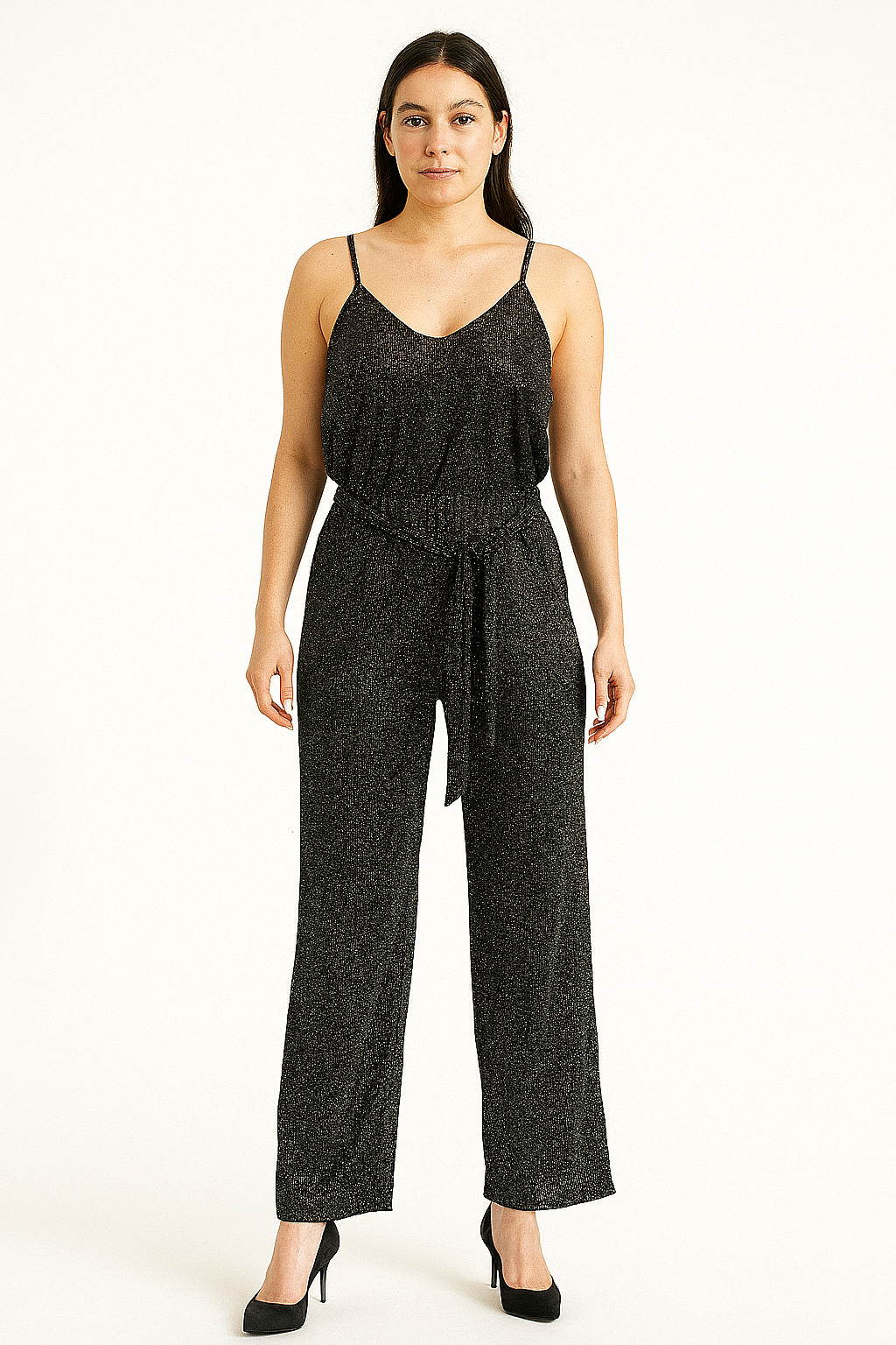 Shimmery black thin strapped pants jumpsuit with a sparkly belt