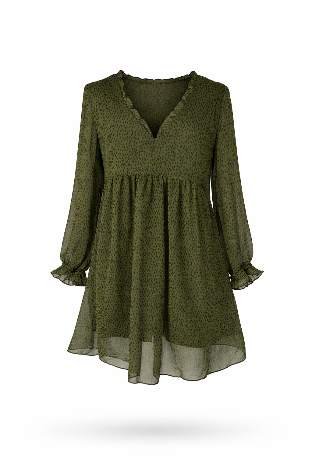 Olive green long sleeves flowy polka dot short length dress.