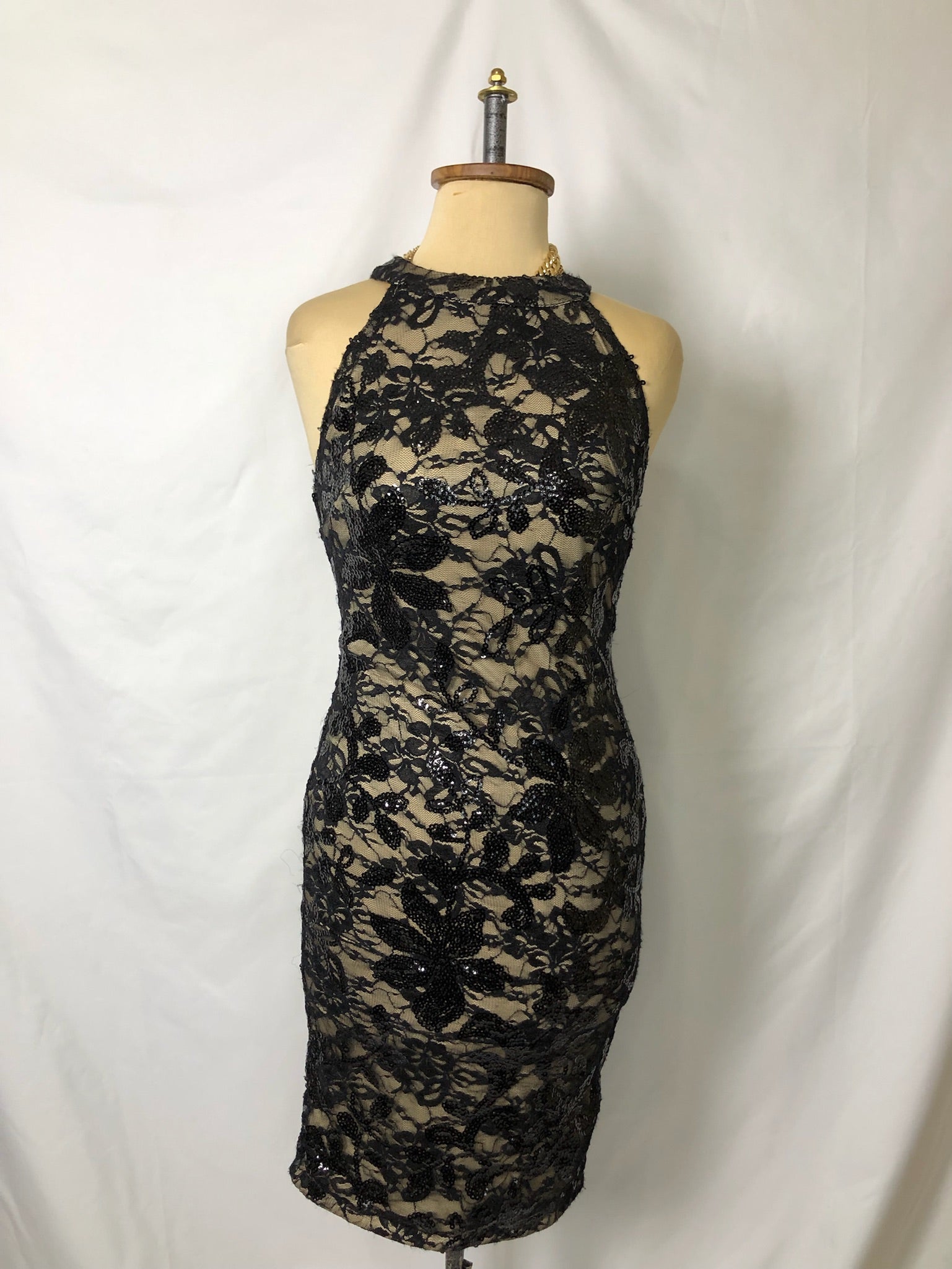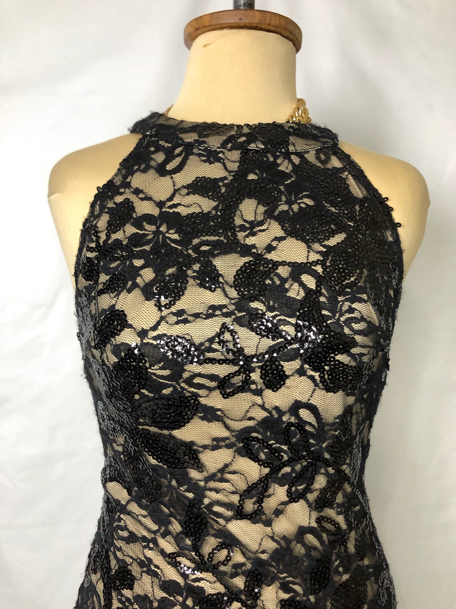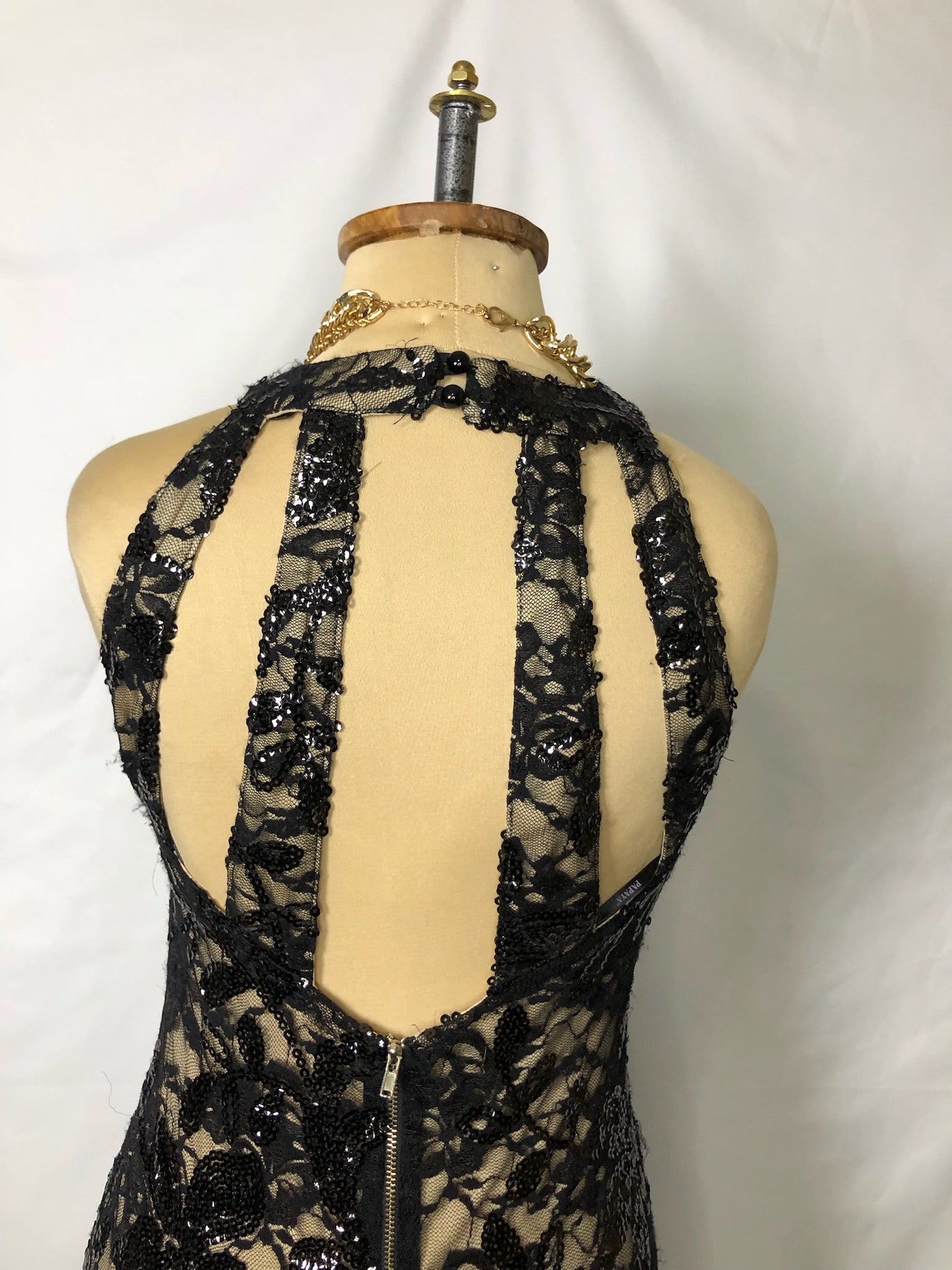 Black floral sequin lace halter neck stripped open back short dress with back slit.