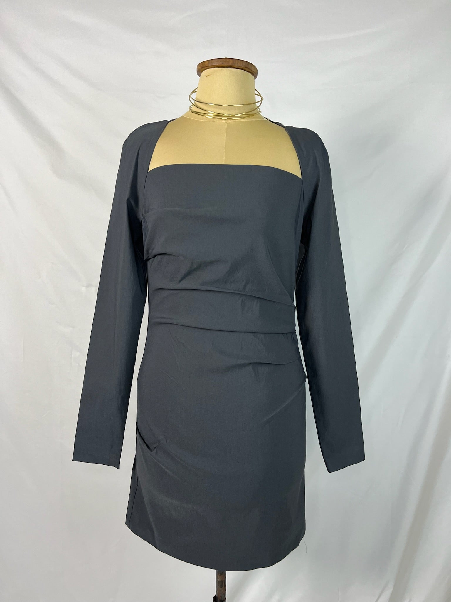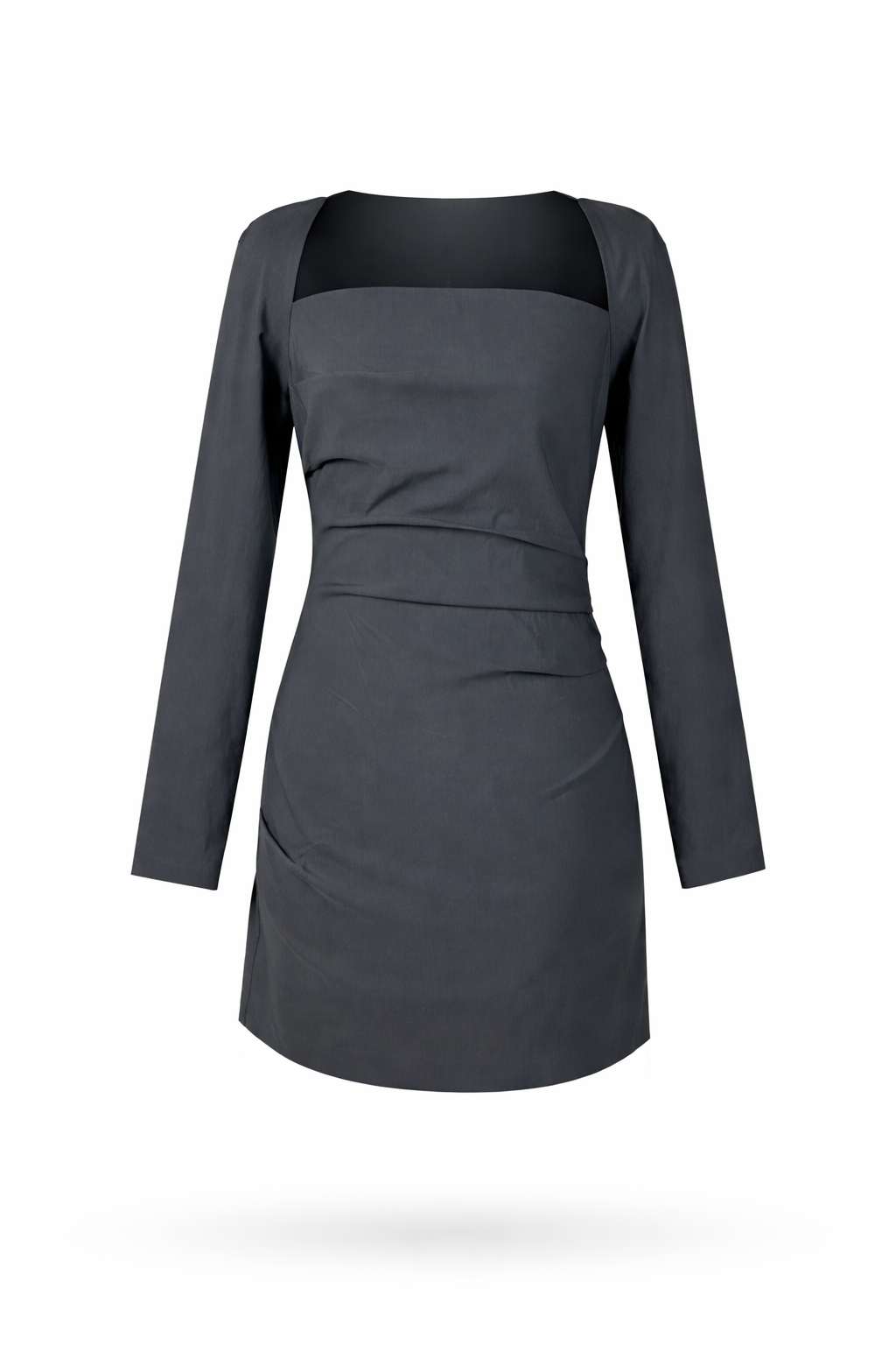Dark grey, square neckline, long sleeves structured slate mini dress.