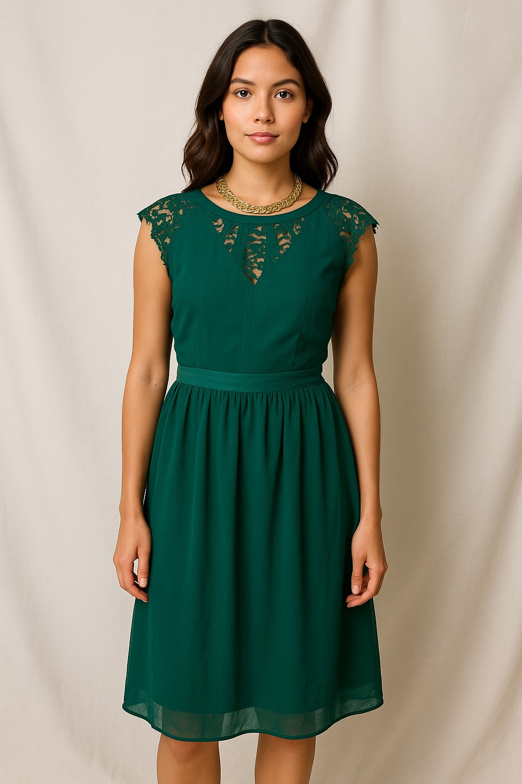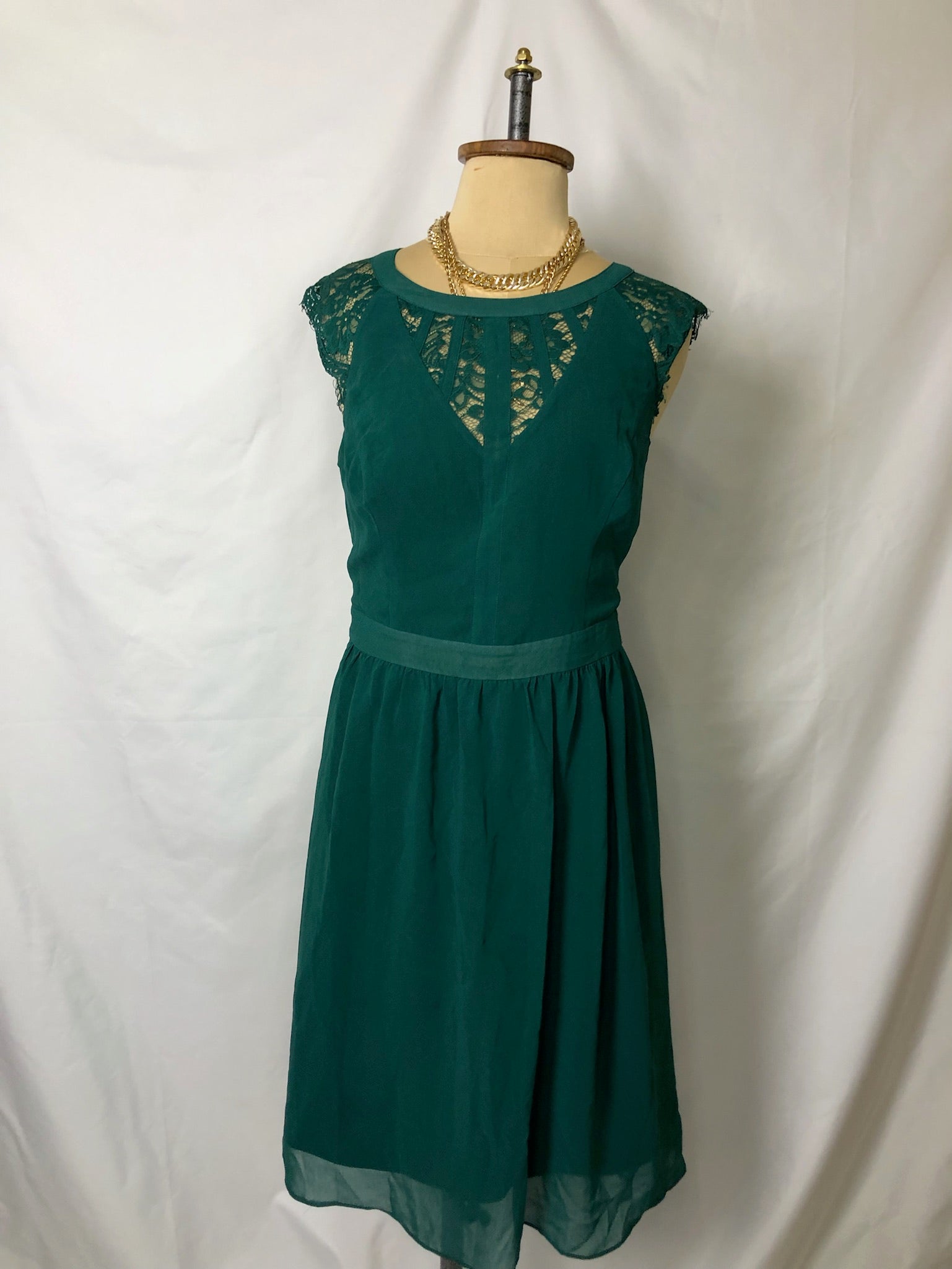Green midi chiffon flowy dress with laced chest & shoulders with a back zipper.