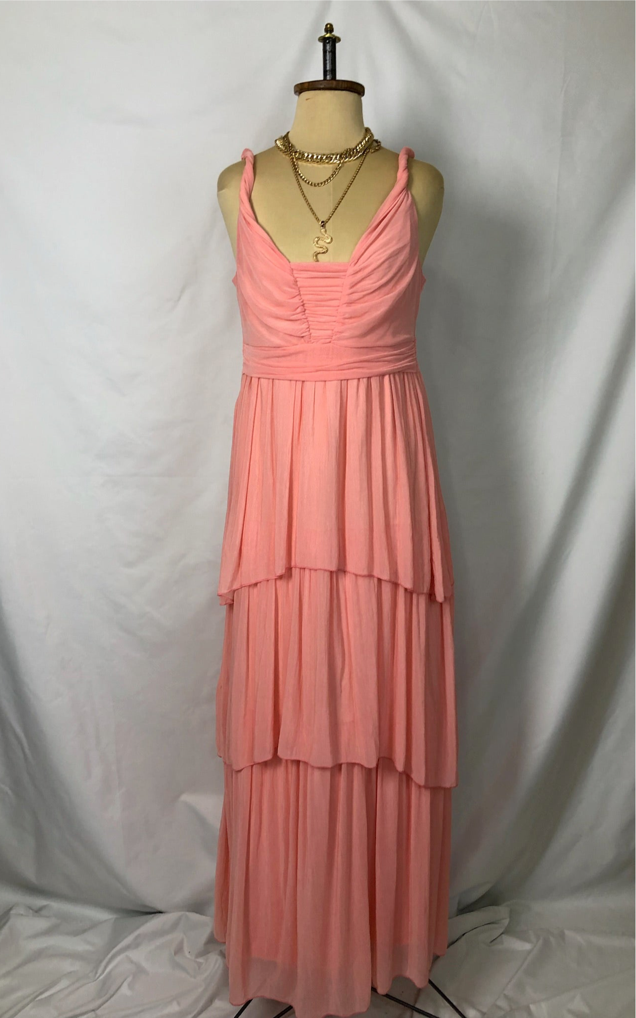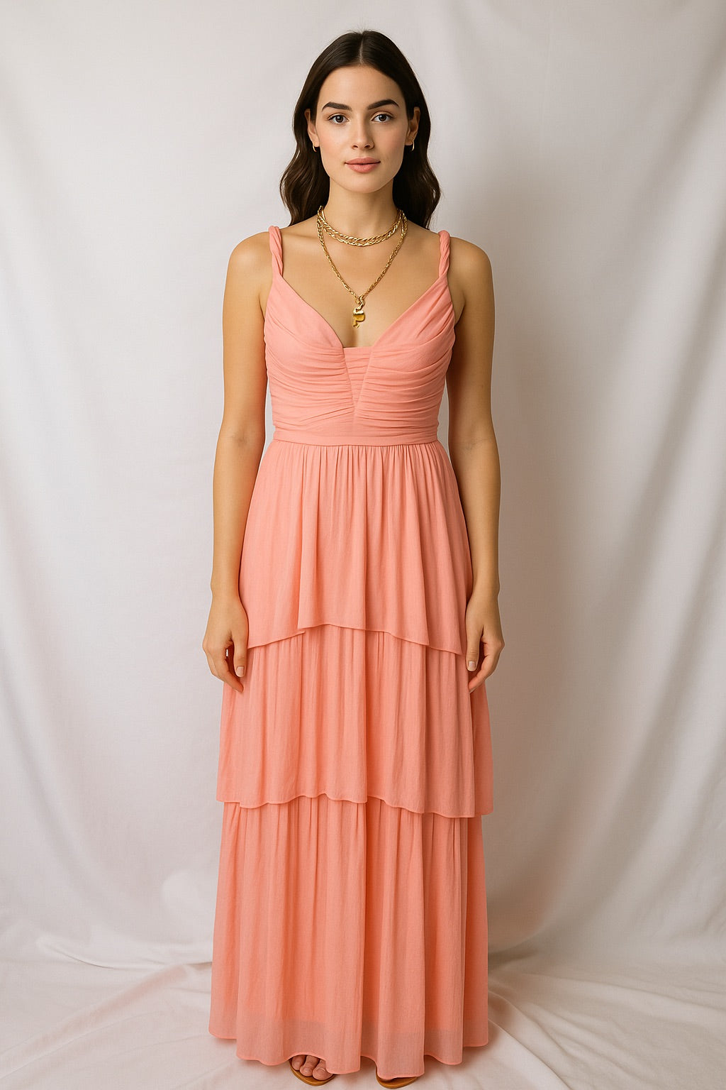 Salmon pink two layer full length ruffle rolled strapped pleated chest dress.