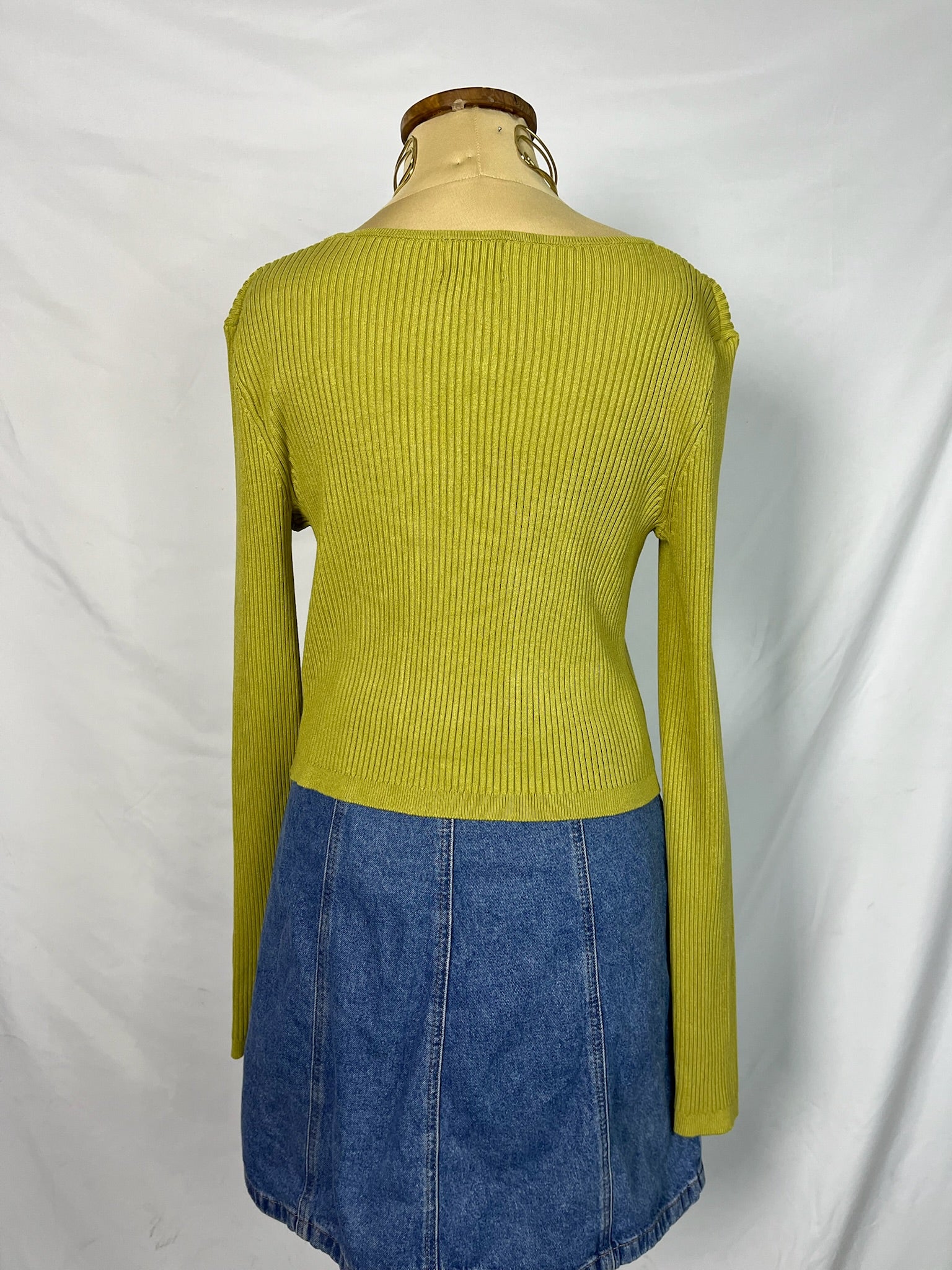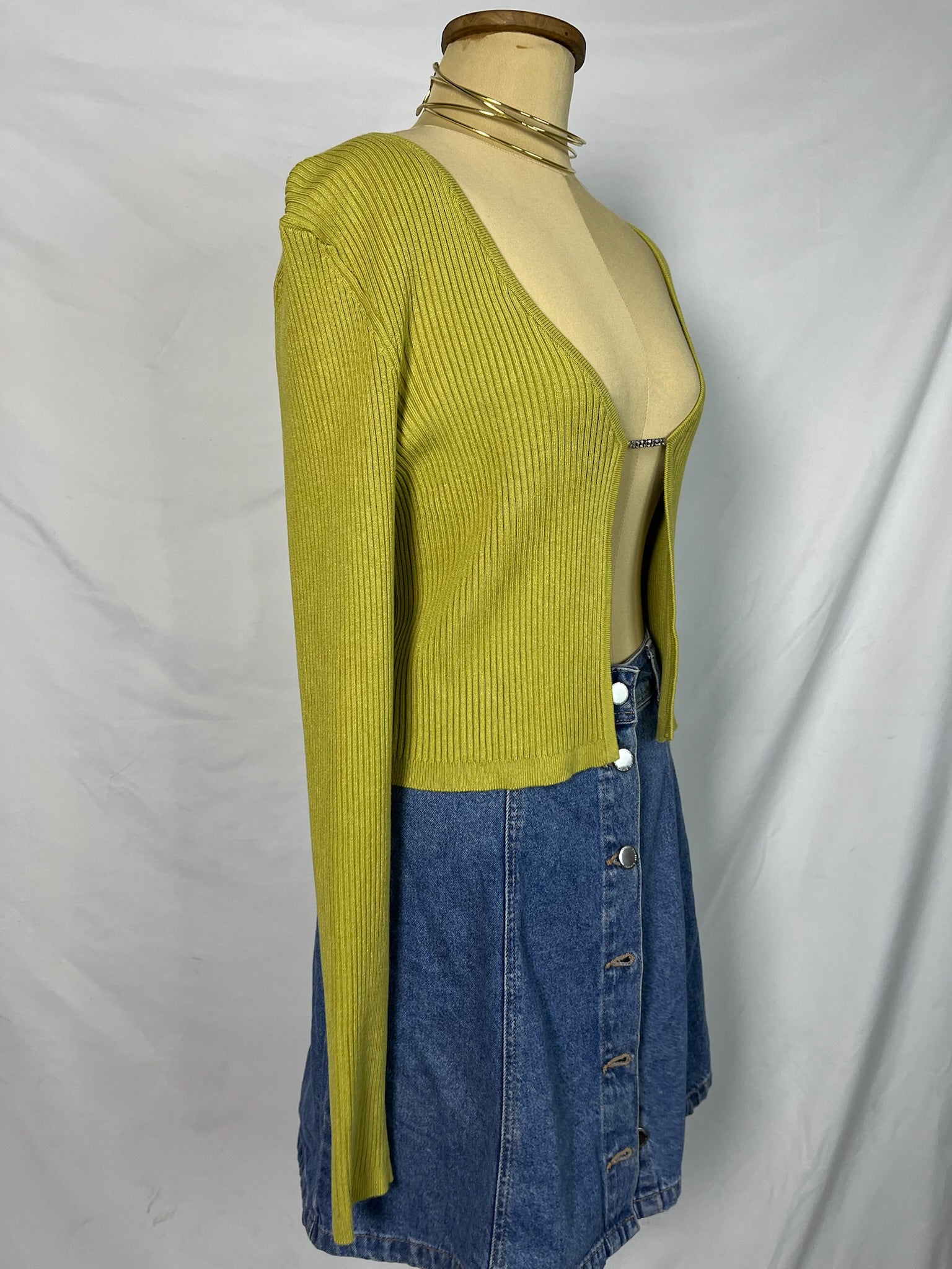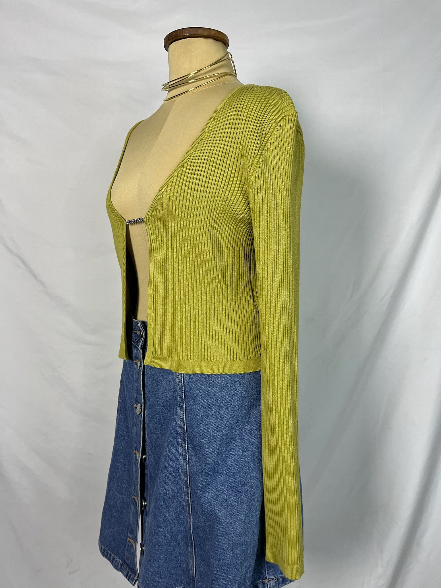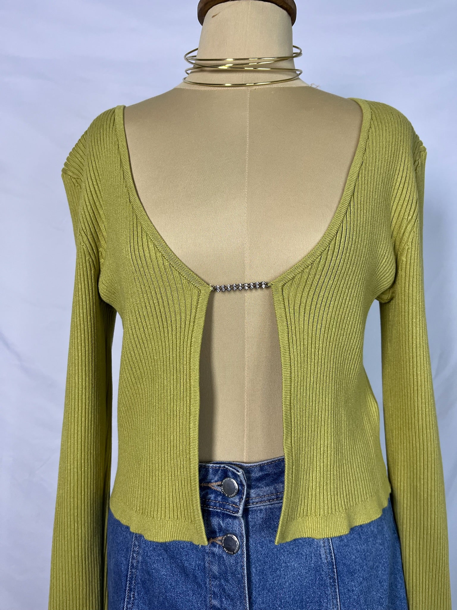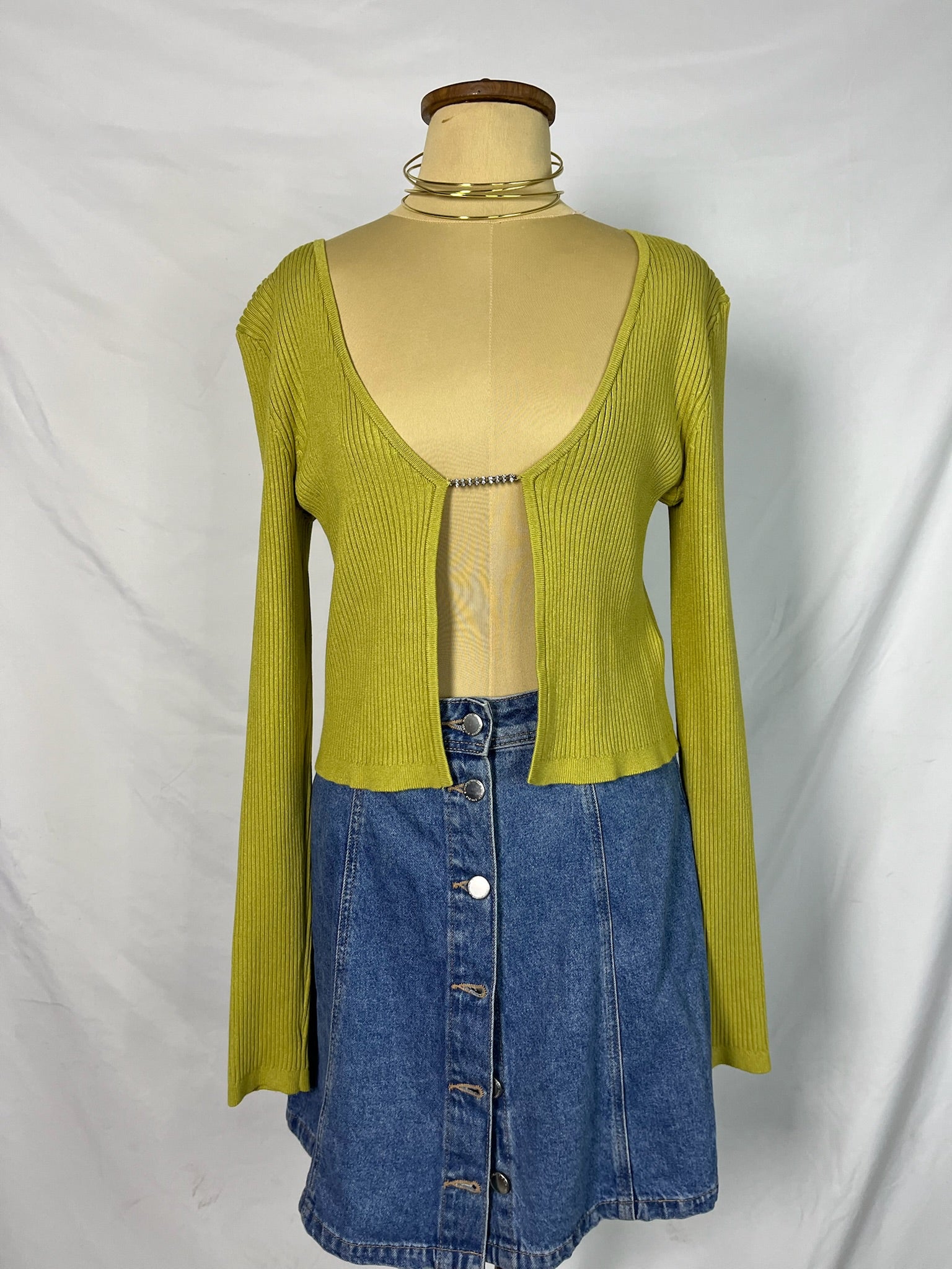 Mustard long sleeves, deep neckline, cropped fit, open front with rhinestone clasp, stretchy ribbed knit top.