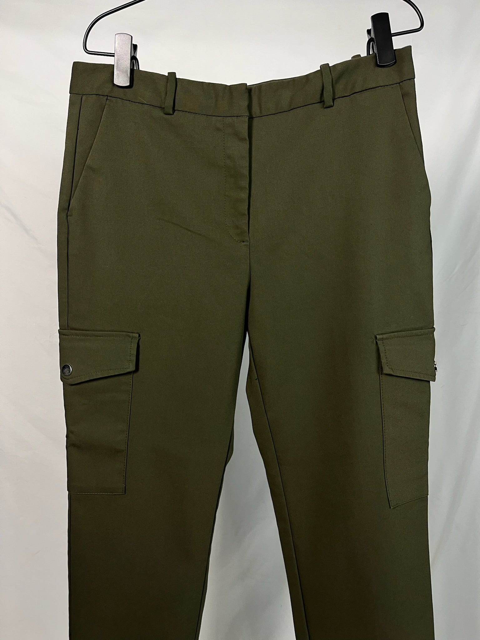 Olive green soft fabric giving tailored fit with buttoned side cargo pockets and side pockets chill but smart cargo pants.