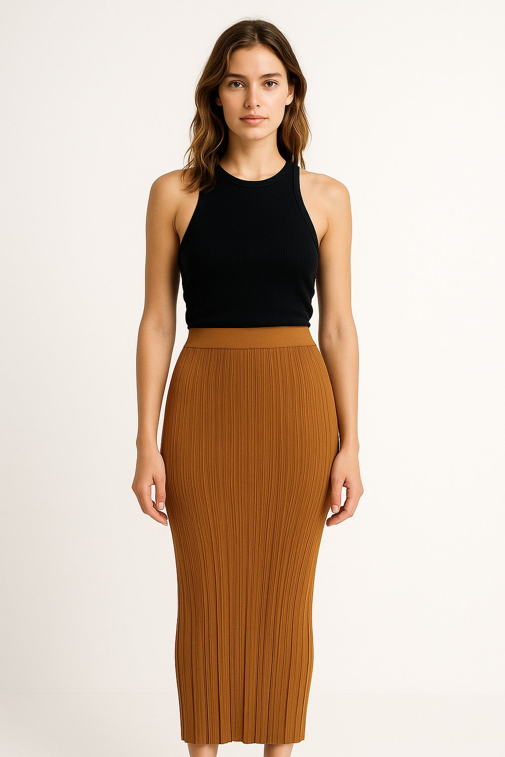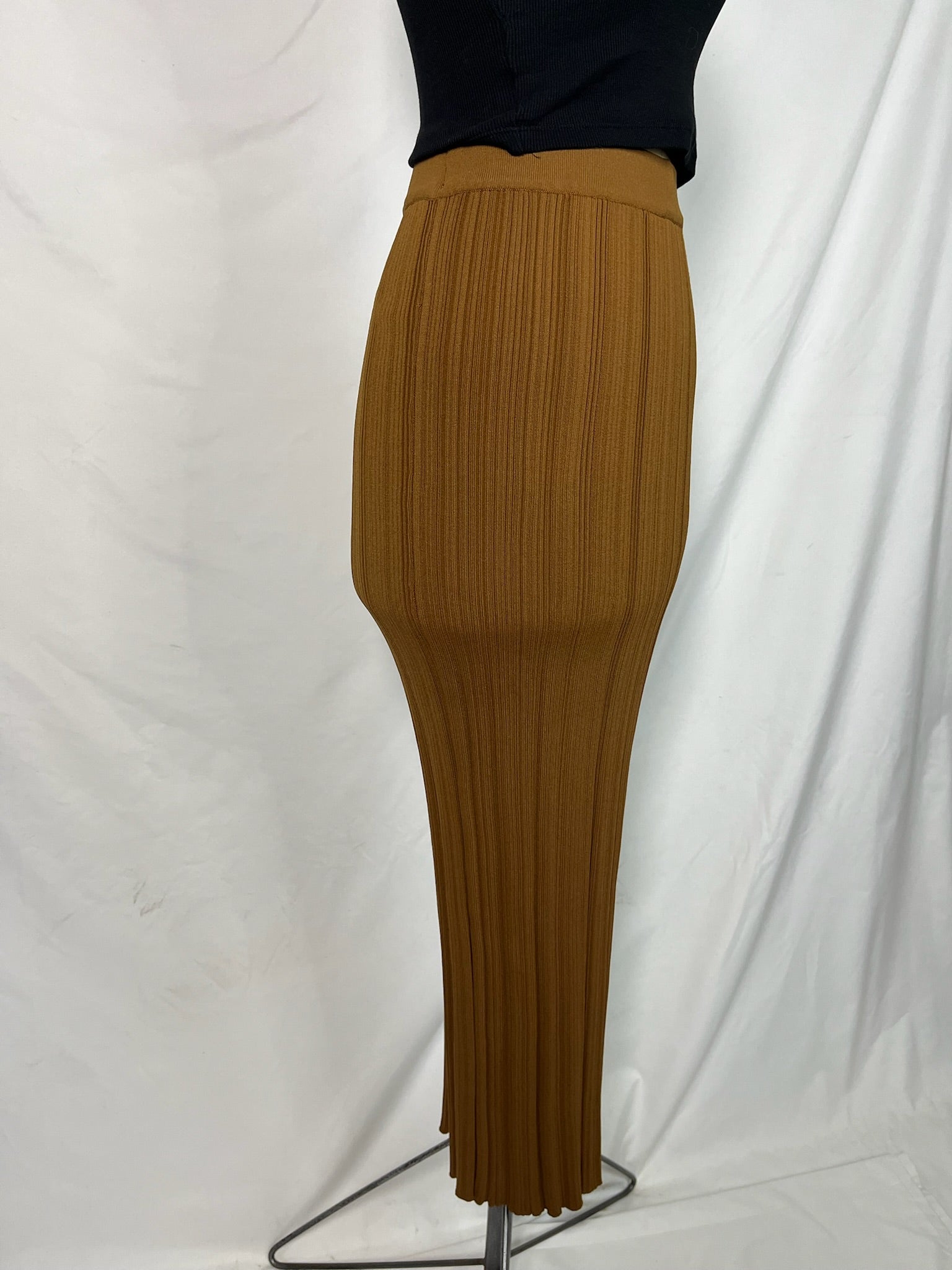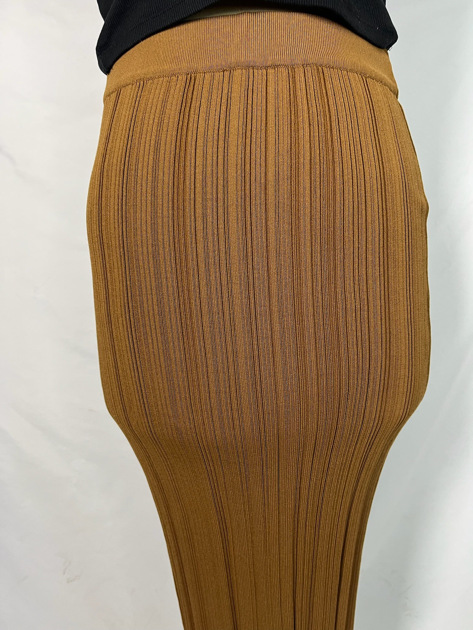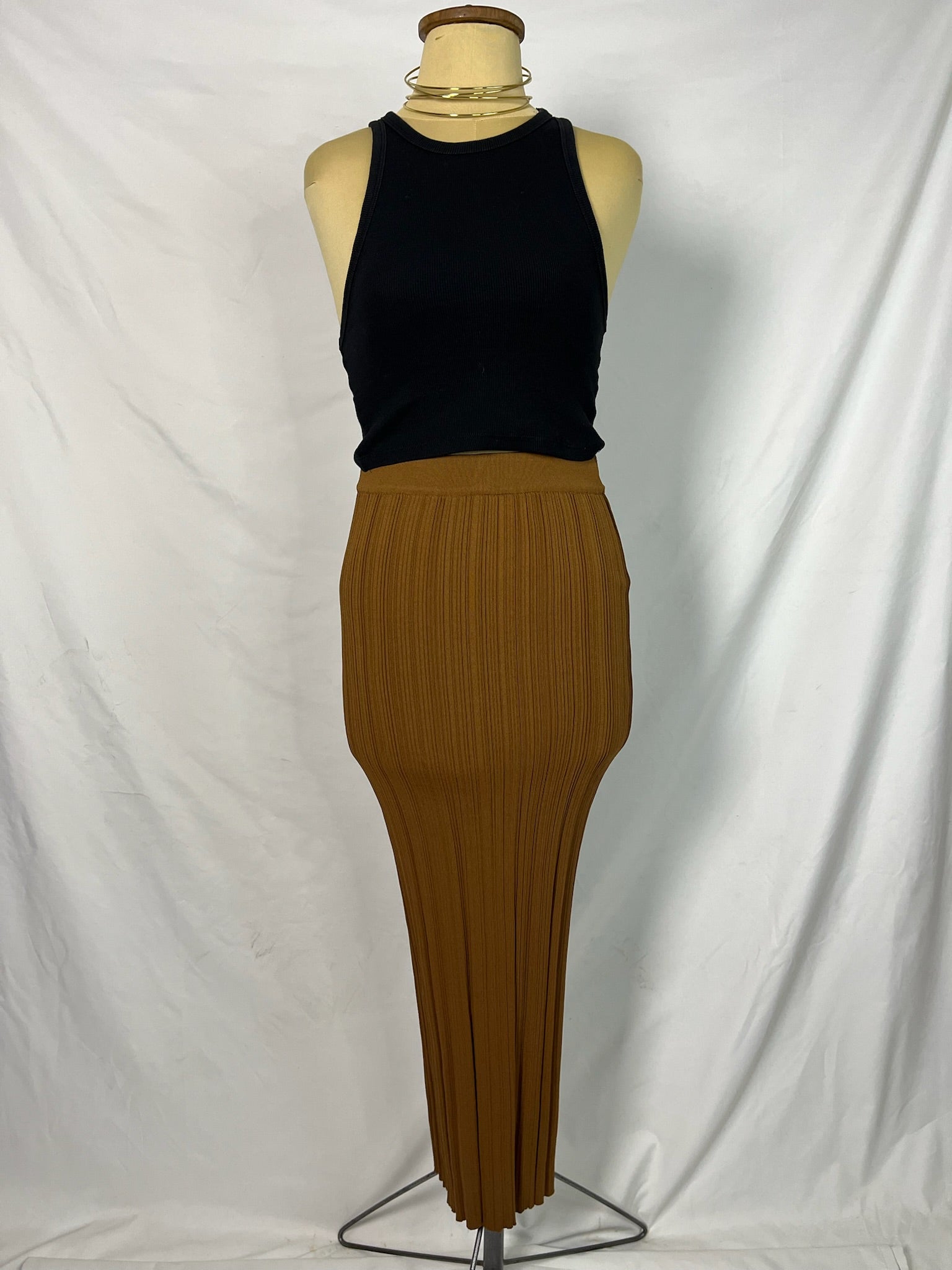 Copper brown ribbed pleated knit fabric high waisted, stretchy waistband, mid to ankle length depending on height skirt.