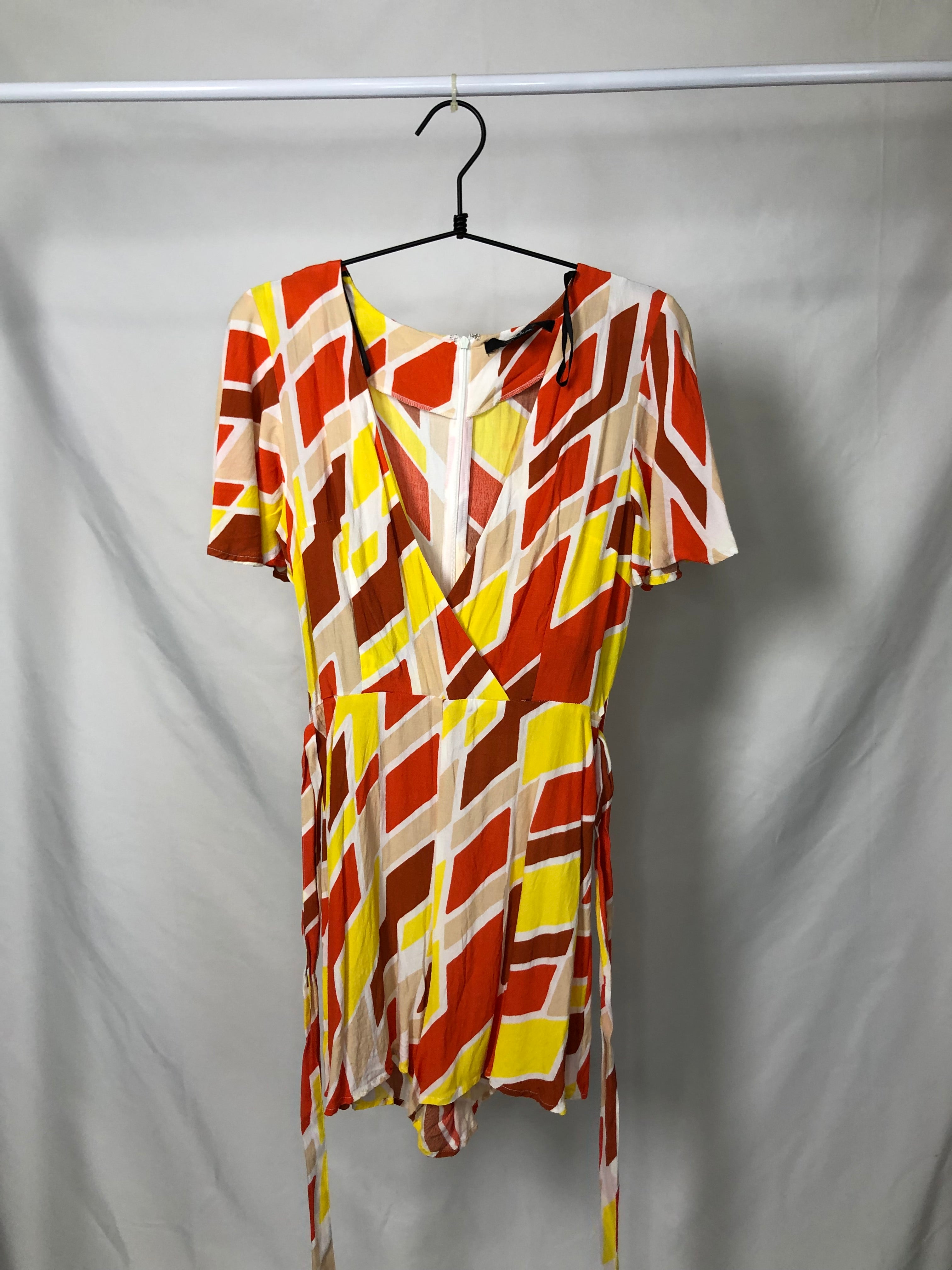playful belted romper pops with geometric sunset hues and a flattering wrap neckline.