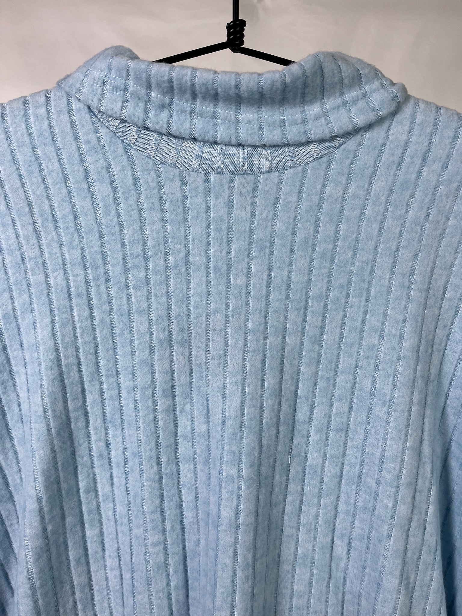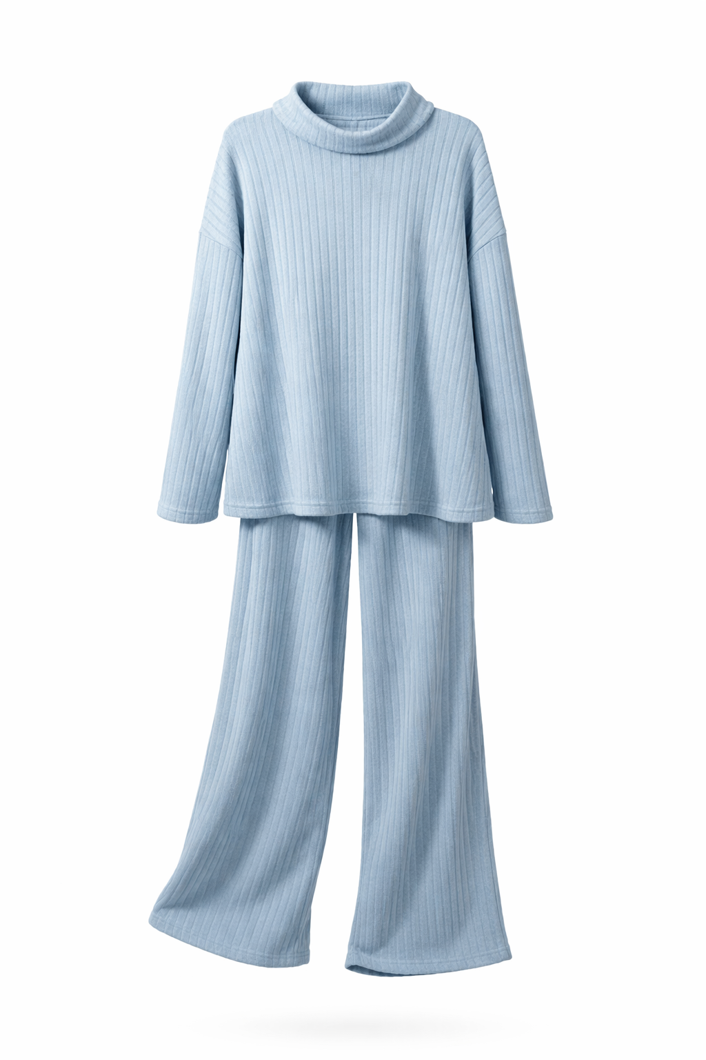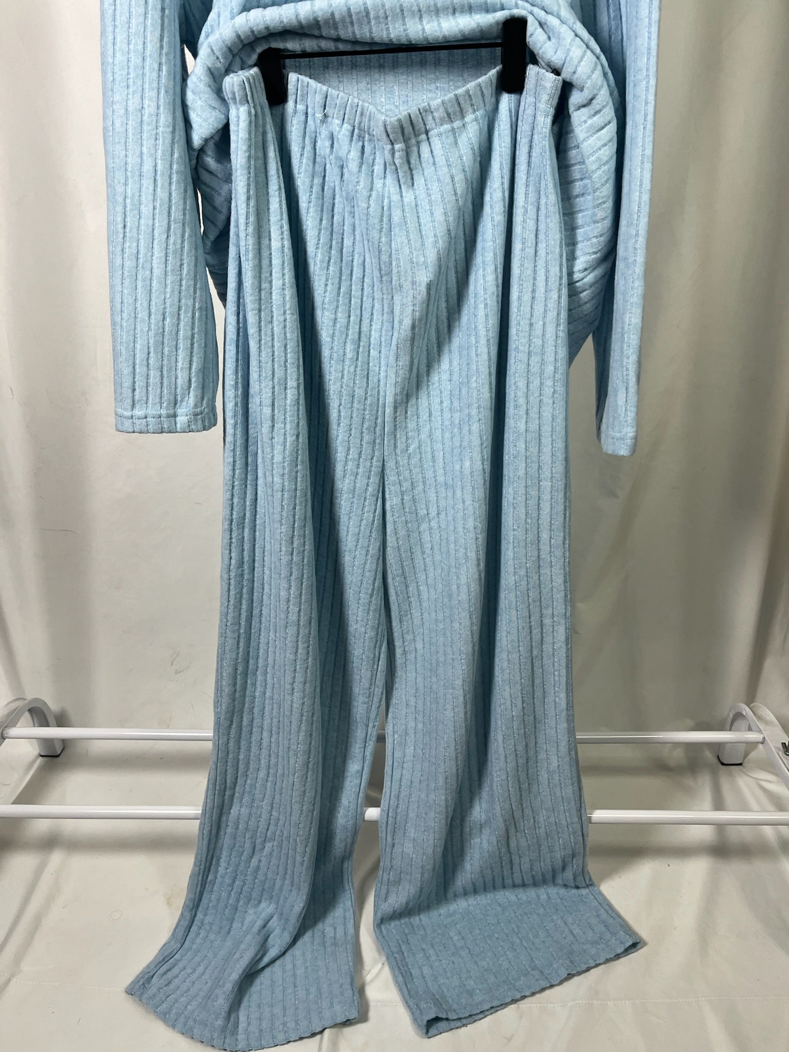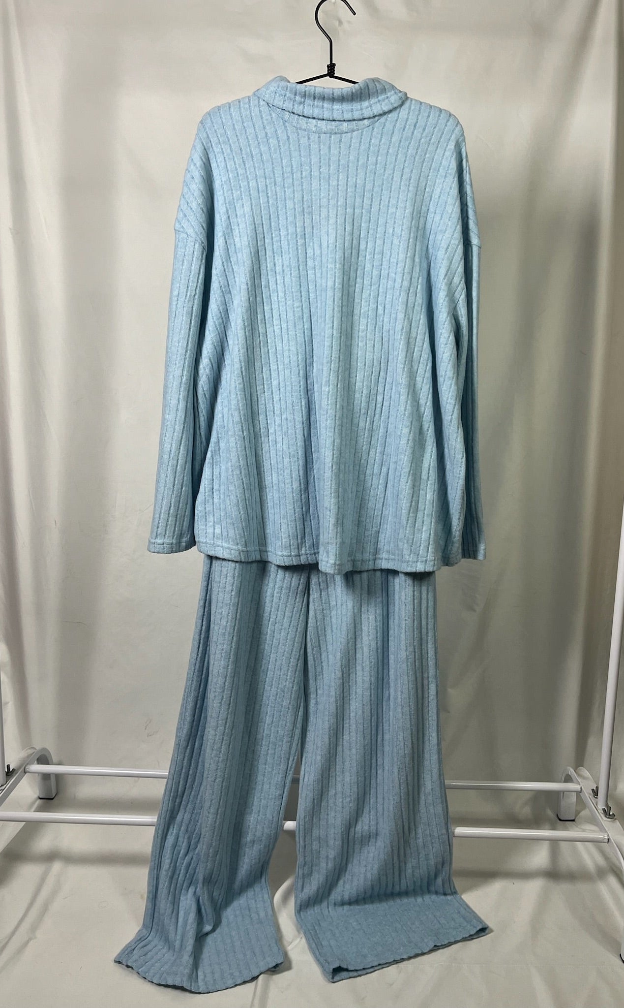 Light blue soft ribbed fabric long sleeves turtle neck top and a matching wide leg pants maternity set. Both top and bottom are the same size.