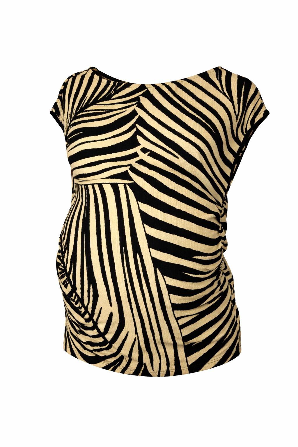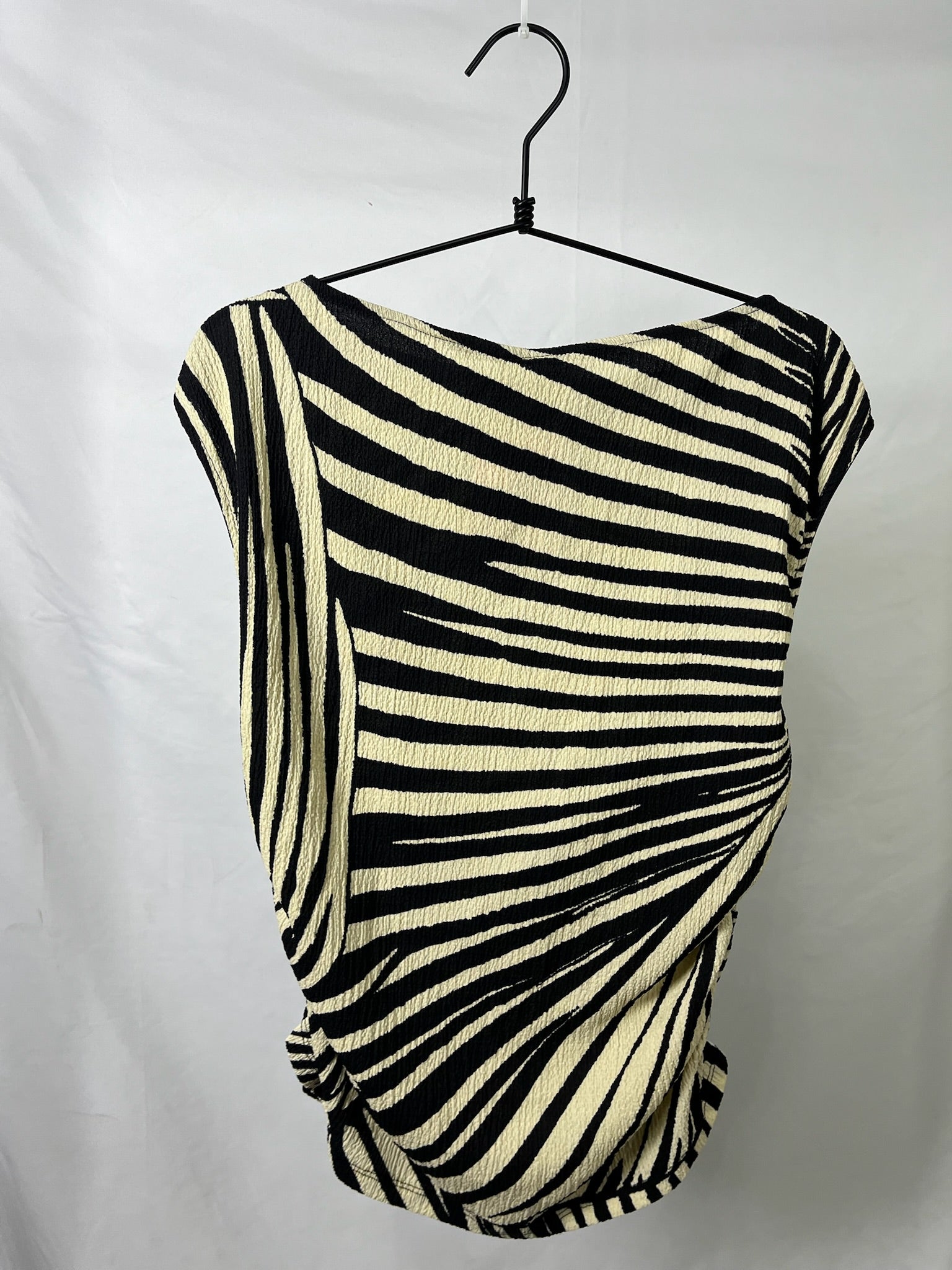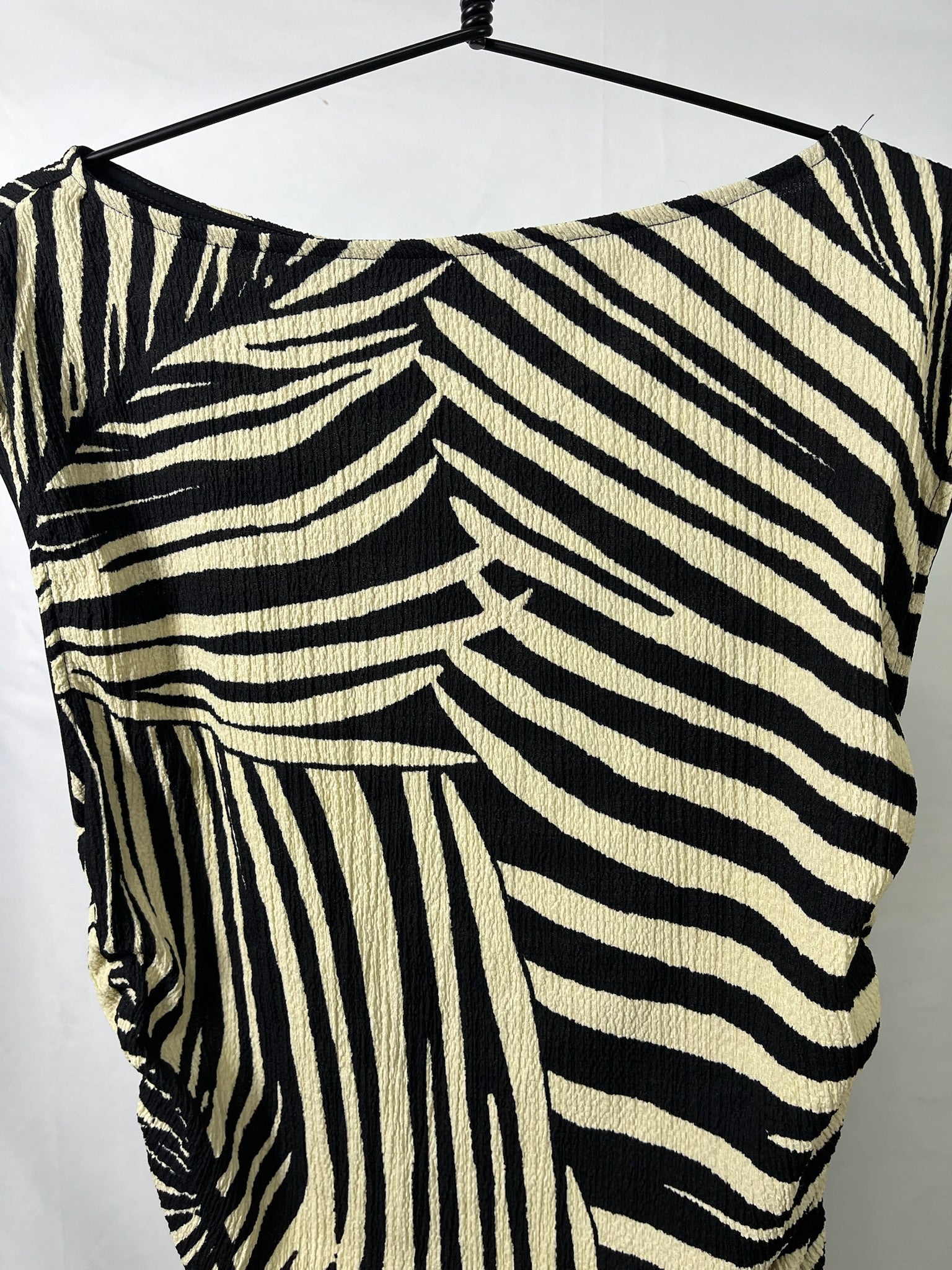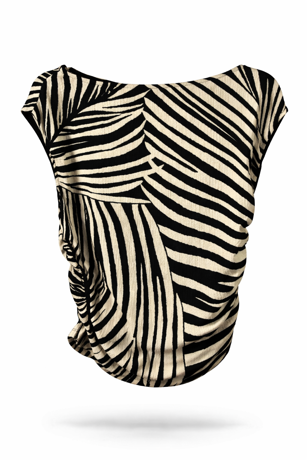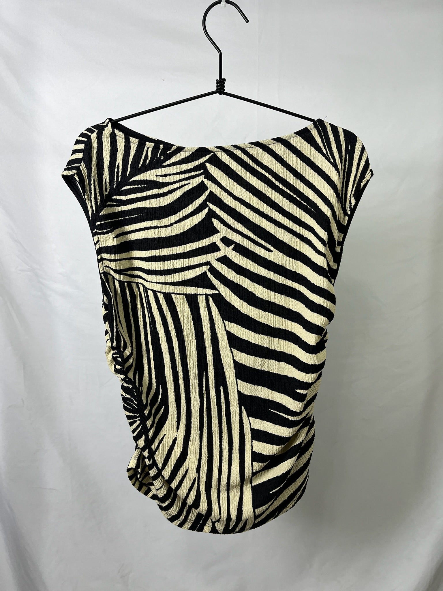 Black and cream zebra print top with a soft draped fit and cap sleeves. Features side scrunch detailing that cinches the waist for a flattering, slightly ruched silhouette.