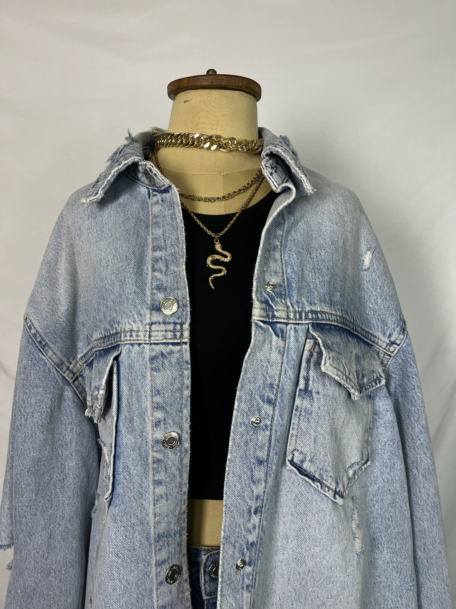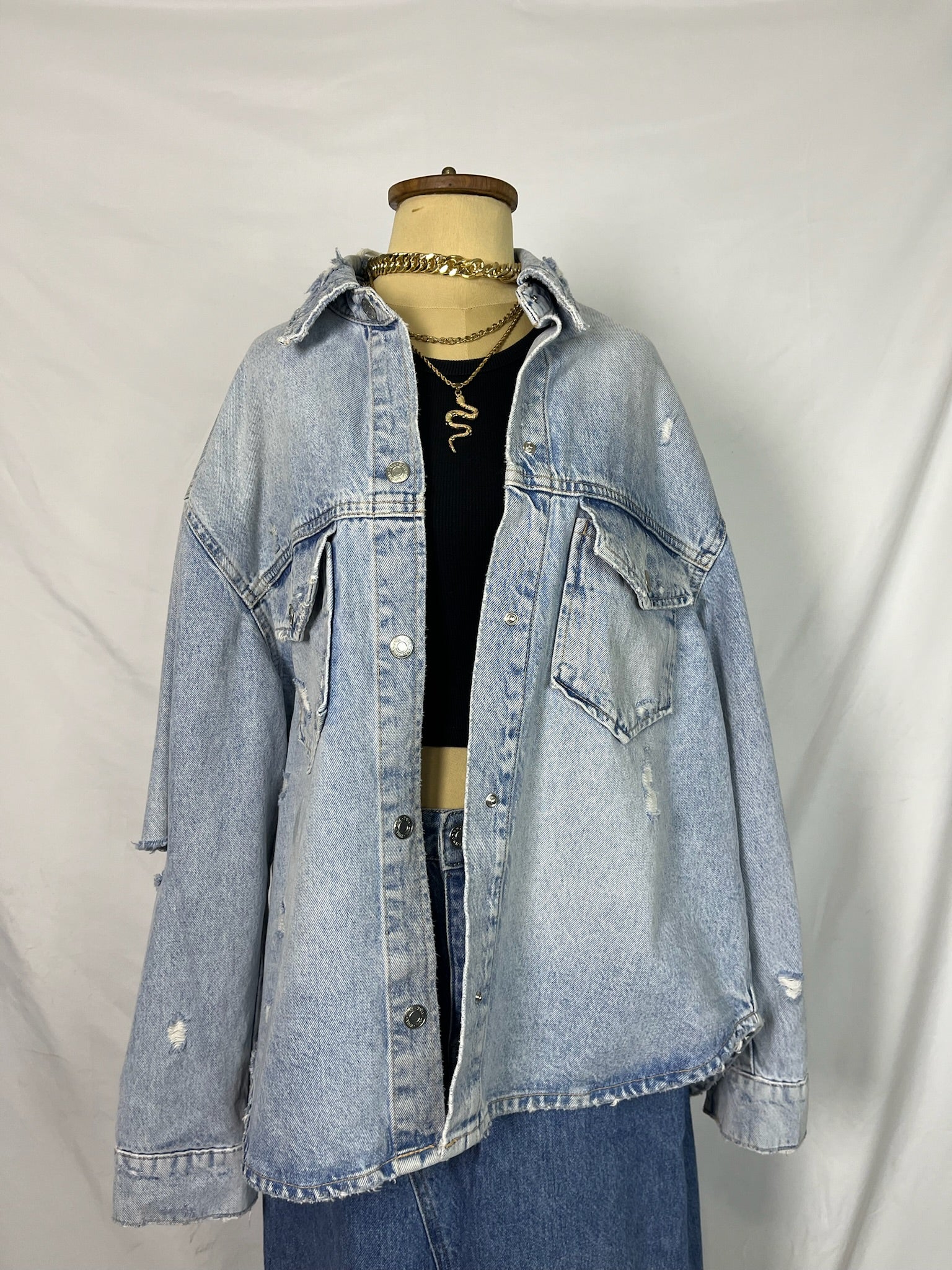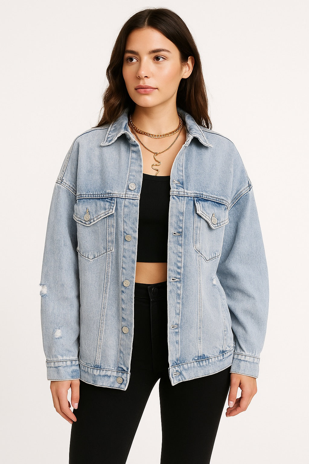 Washed light blue, frayed collar edges, with subtle rips across the sleeves and body, and raw-look hems, relaxed drop shoulder fit with snap buttons closure denim jacket.