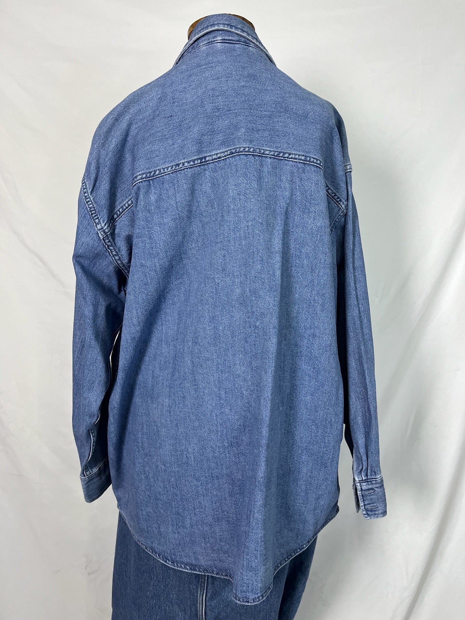 Blue denim, relaxed, slouchy fit, with easy snap button front, lightweight one side pocket jacket.