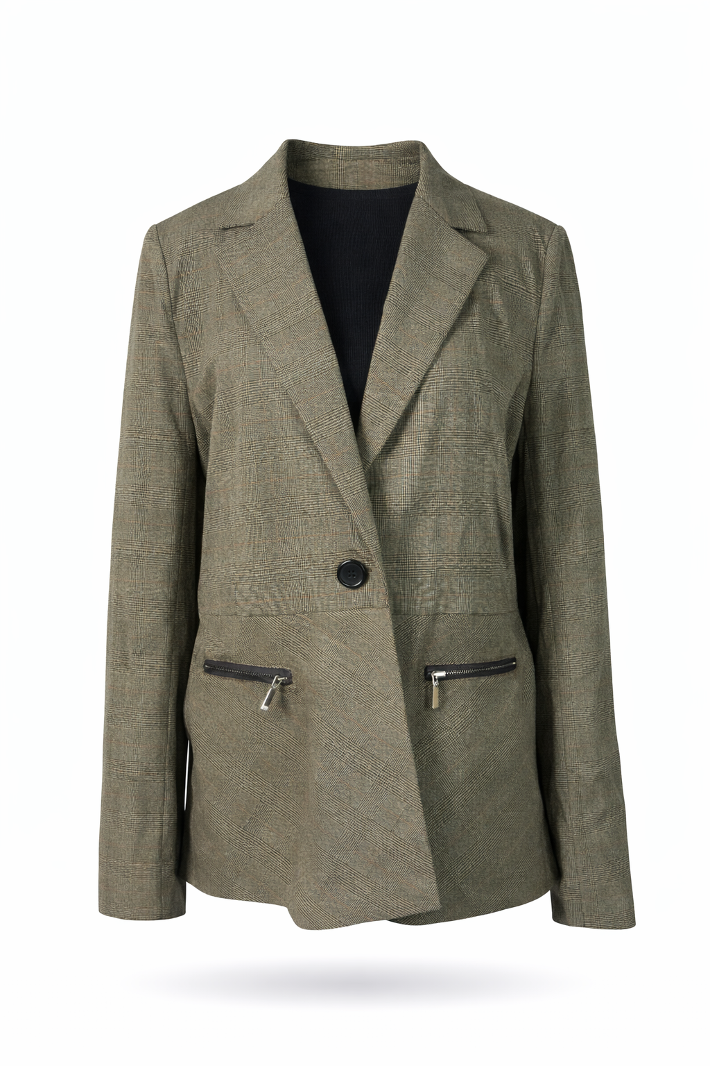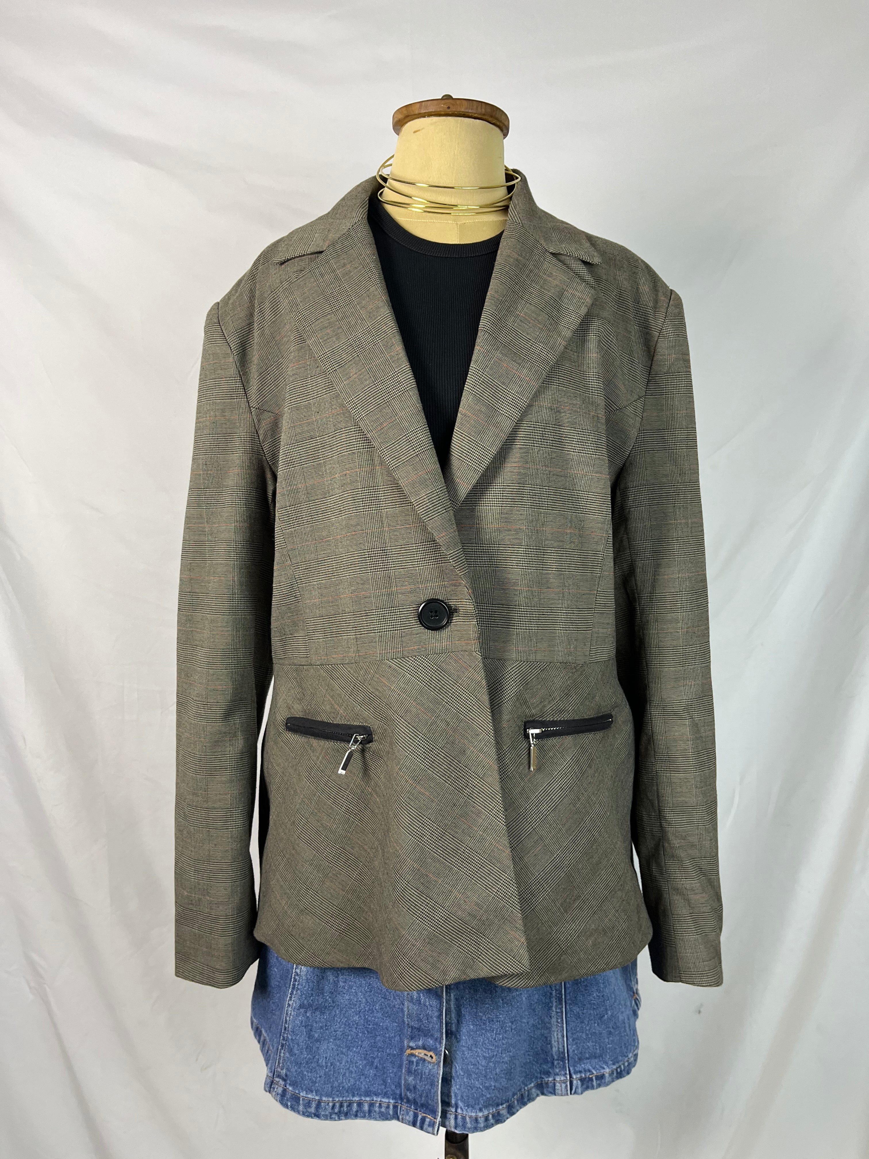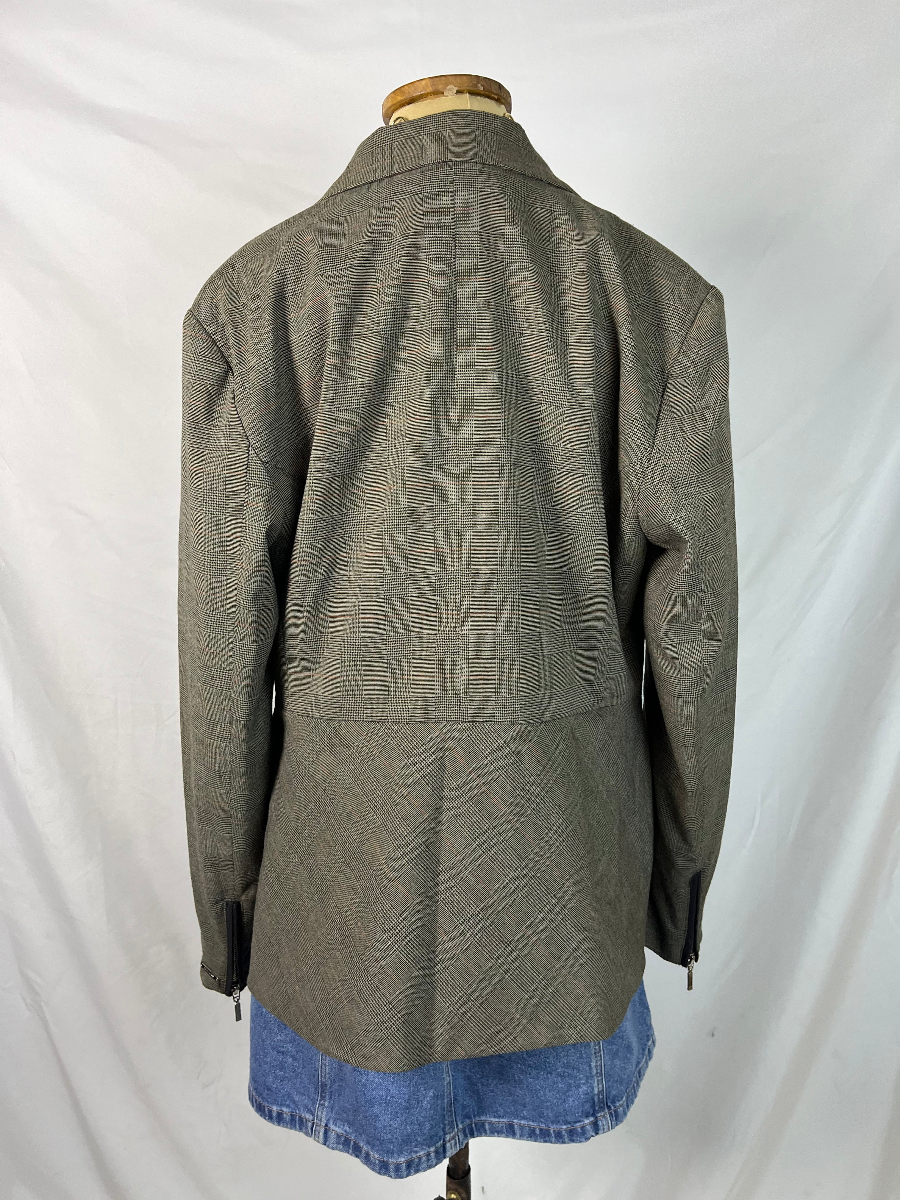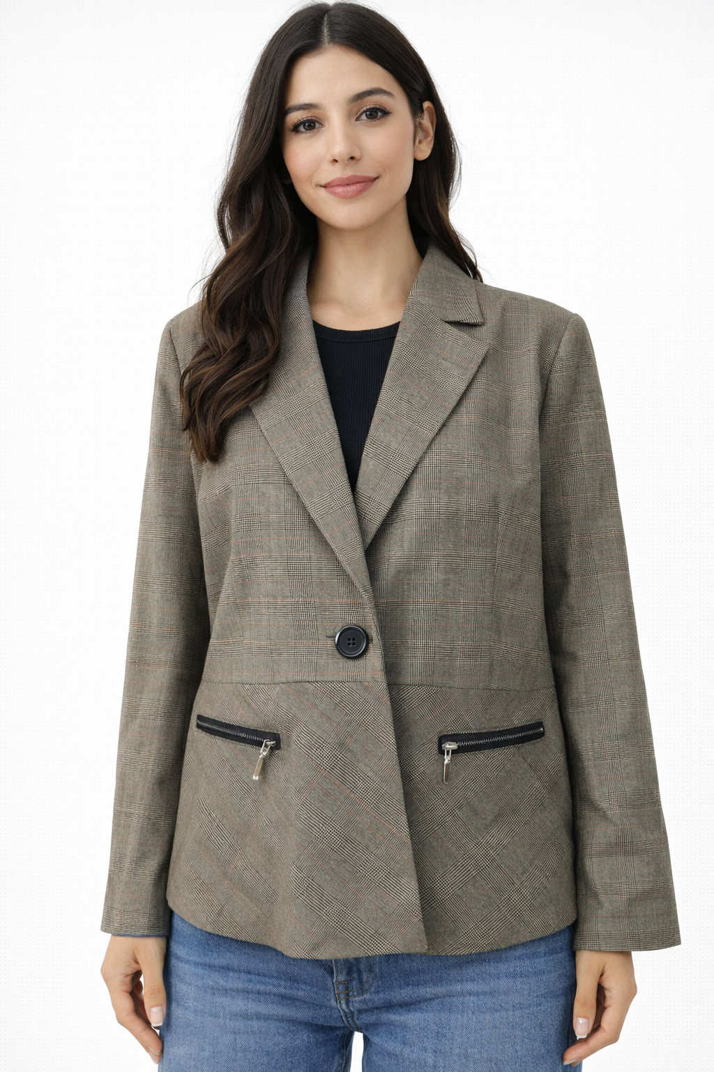 Gray checkered tailored fit single button closure long sleeves with zip detail pockets blazer.