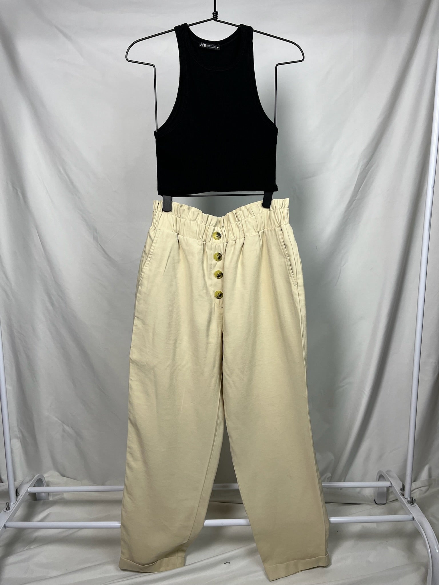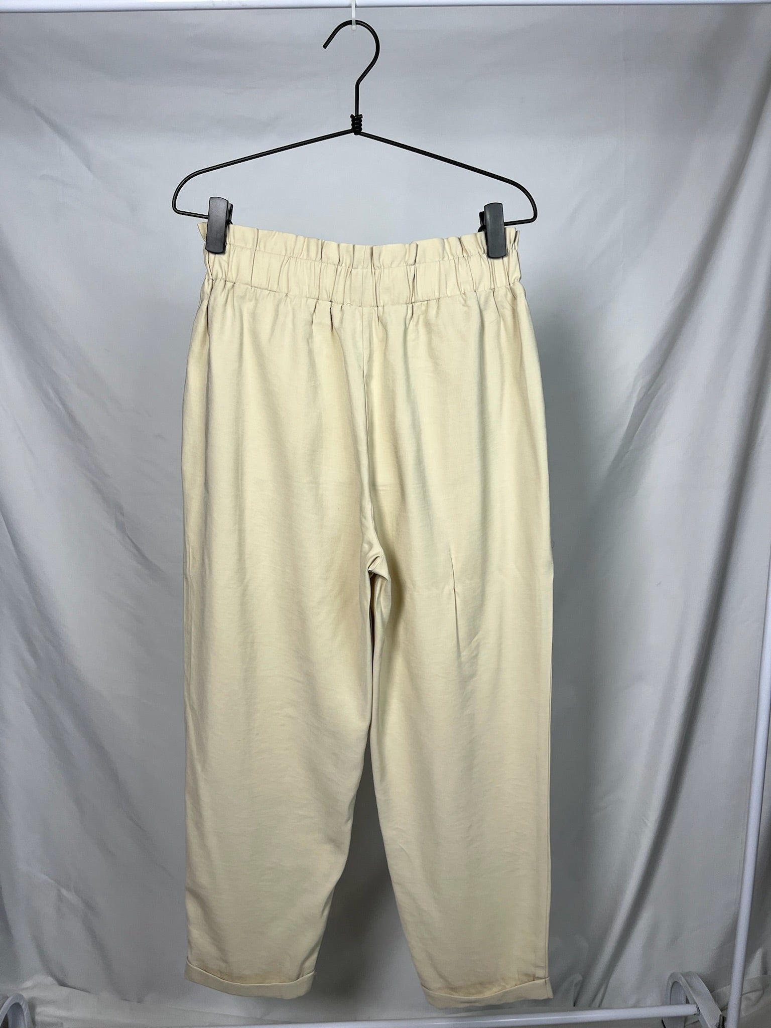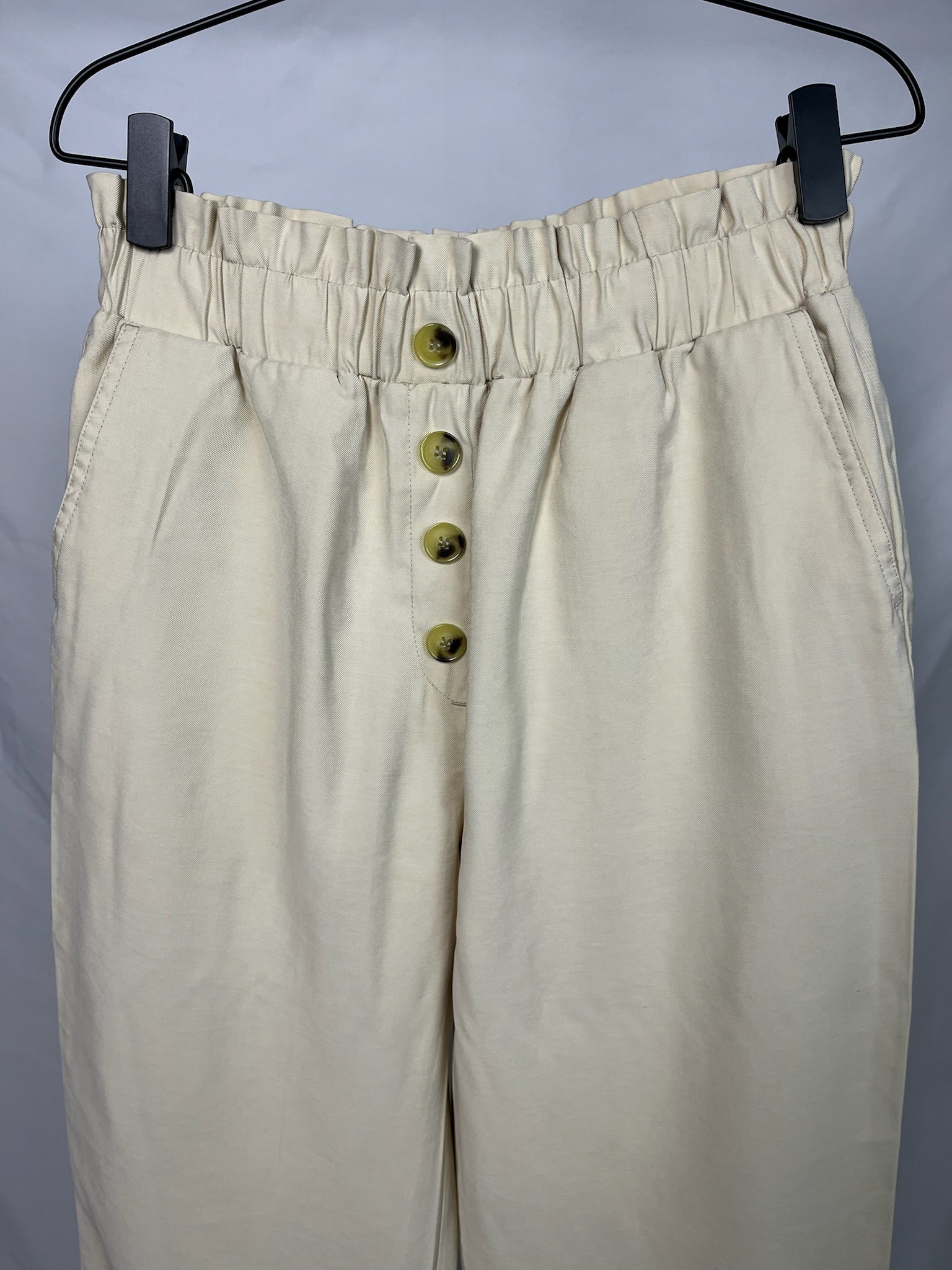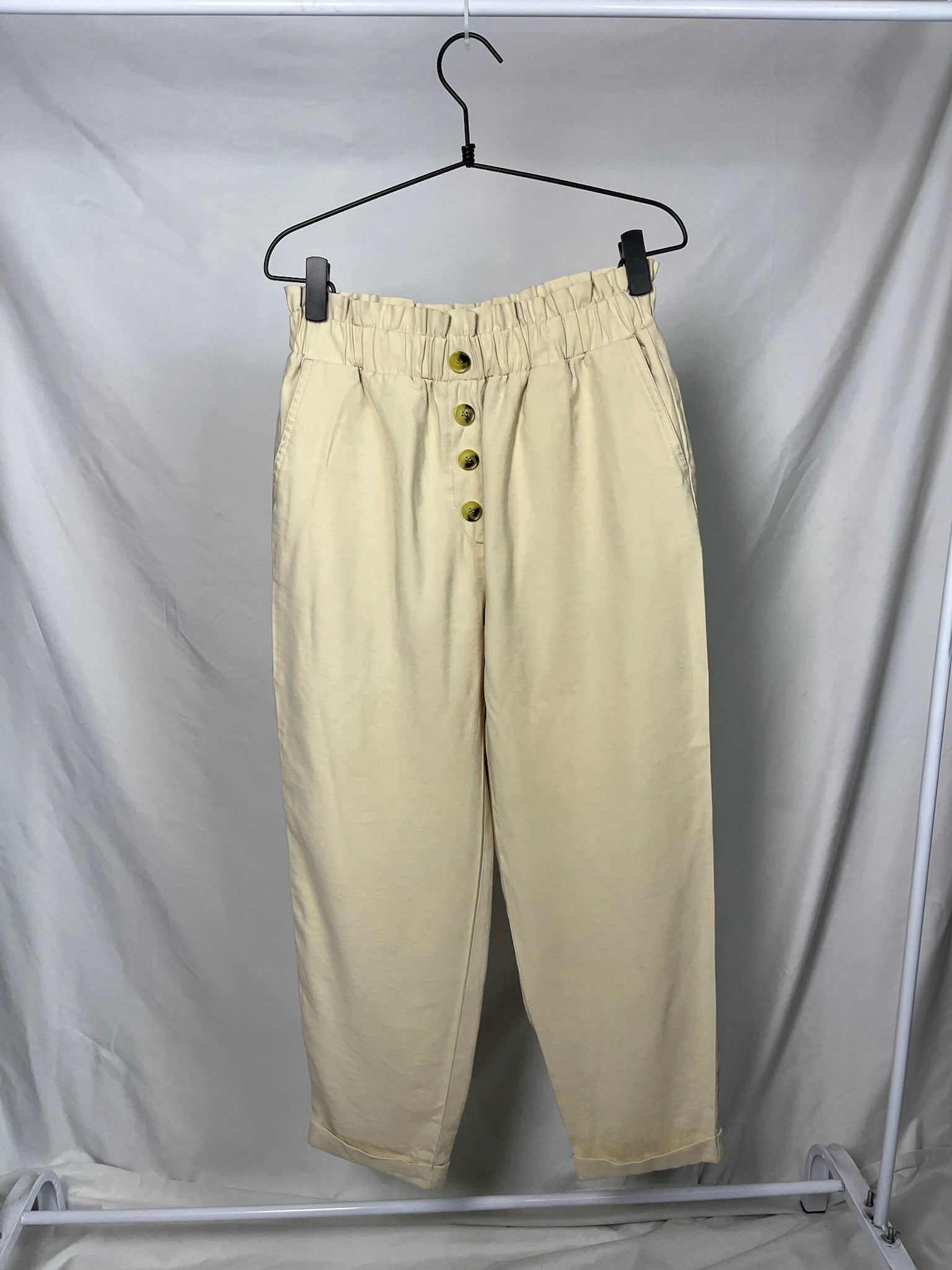 Light beige high waist elastic waistband button front closure straight leg fit with side pockets.