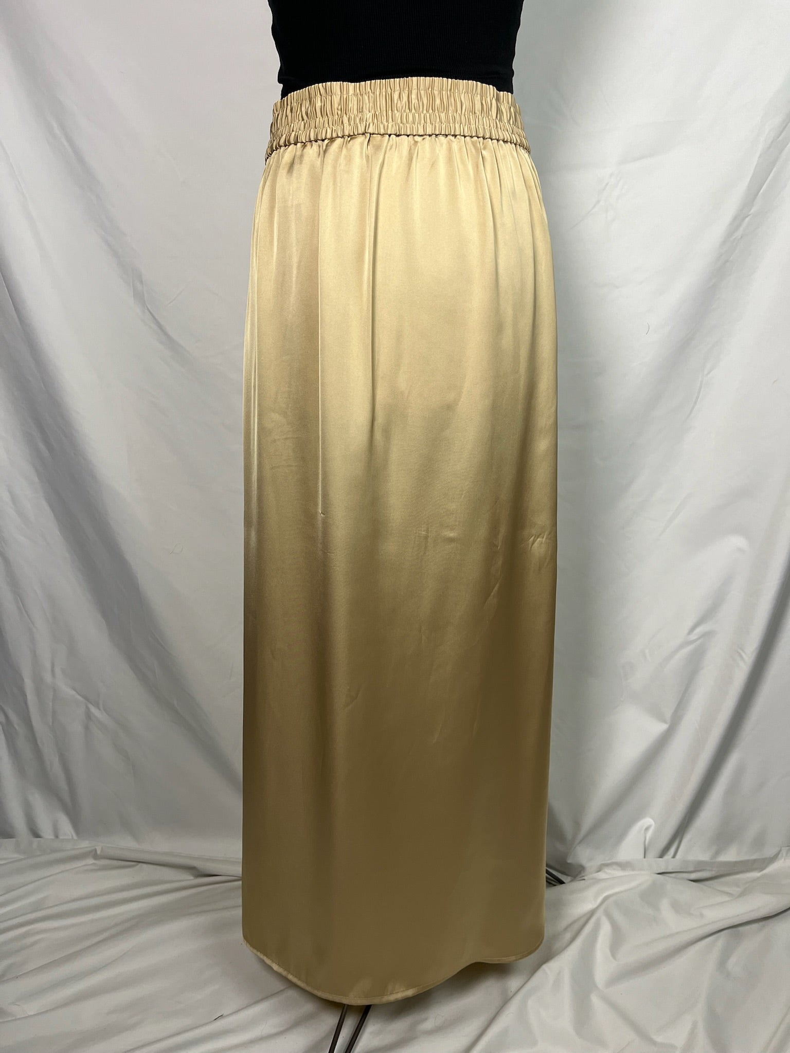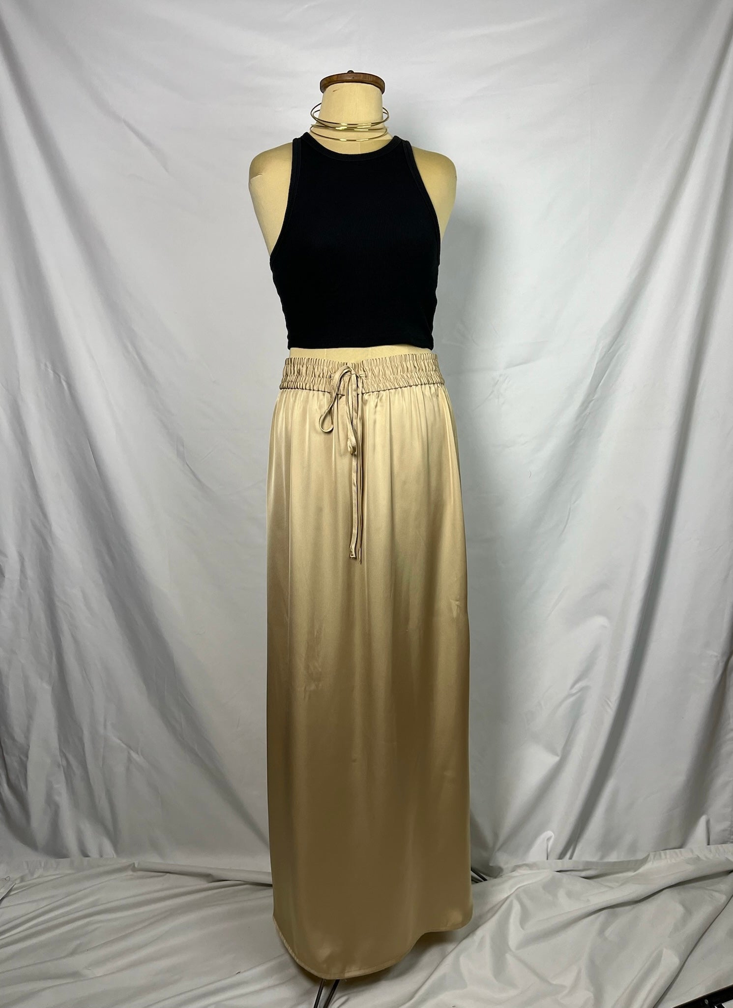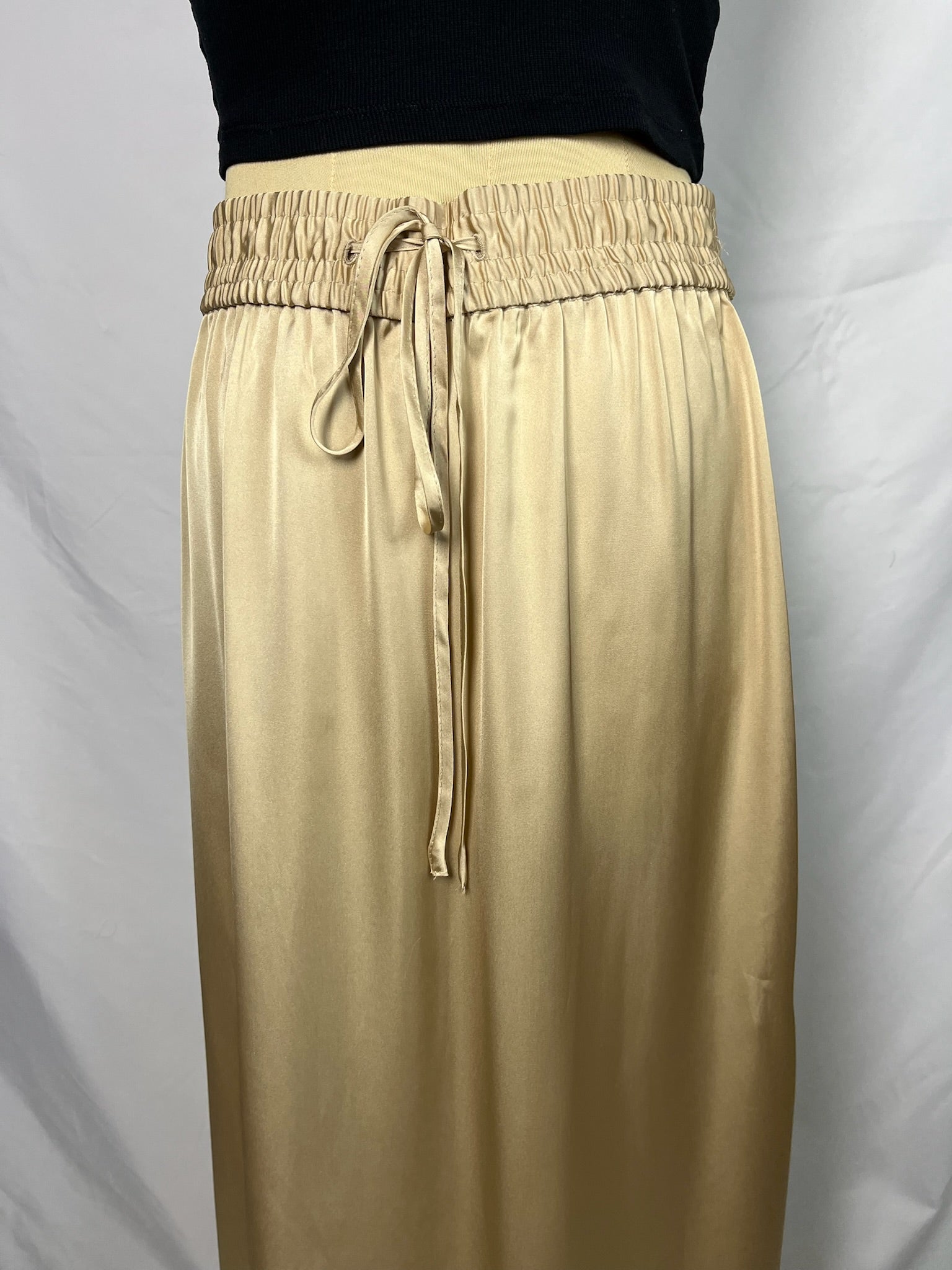 Golden beige satin drawstring waistline adjustable drawstring with two side slits golden beige maxi skirt.