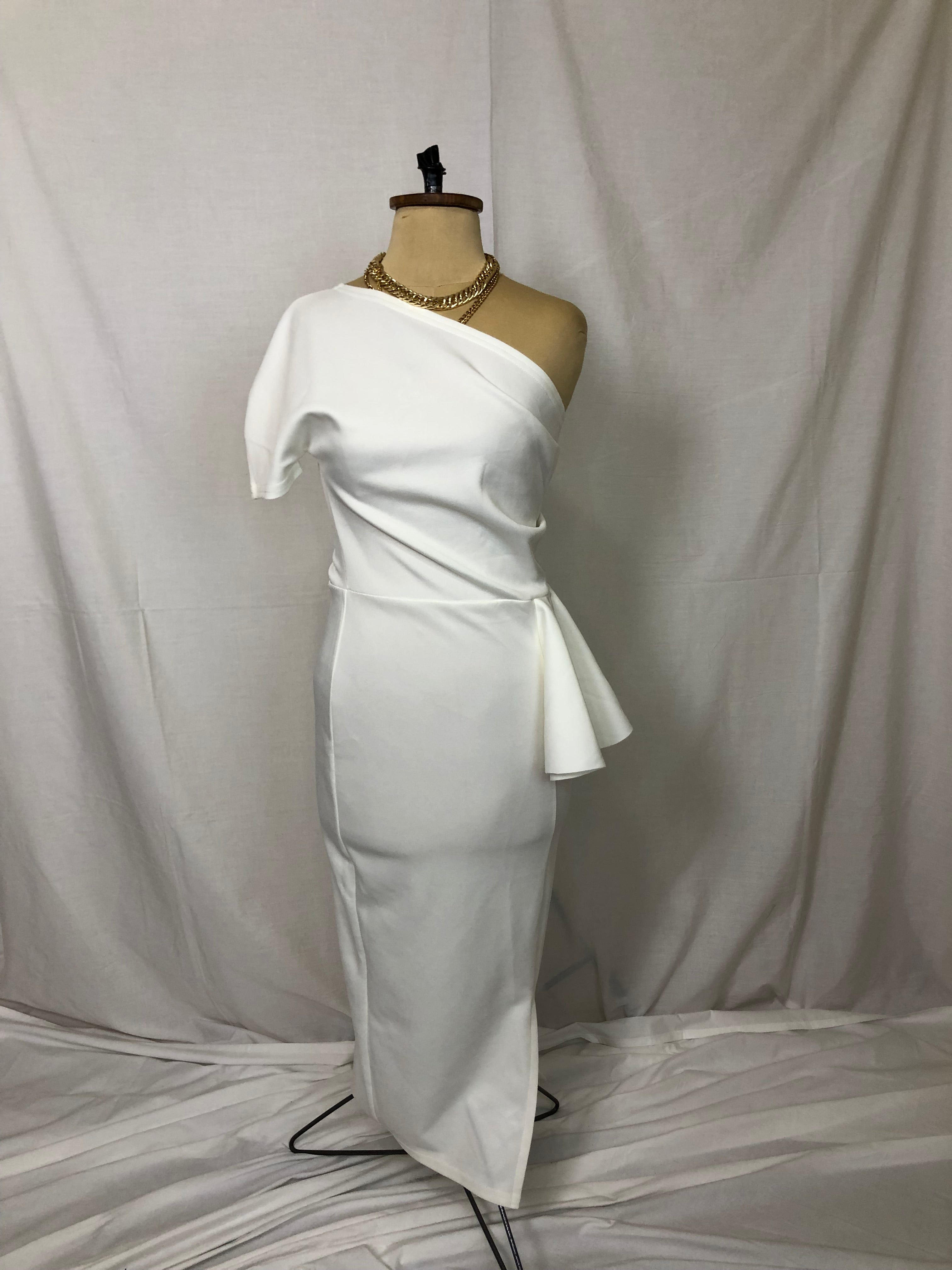 New white shirt sleeves full length one shoulder dress with a side slit.