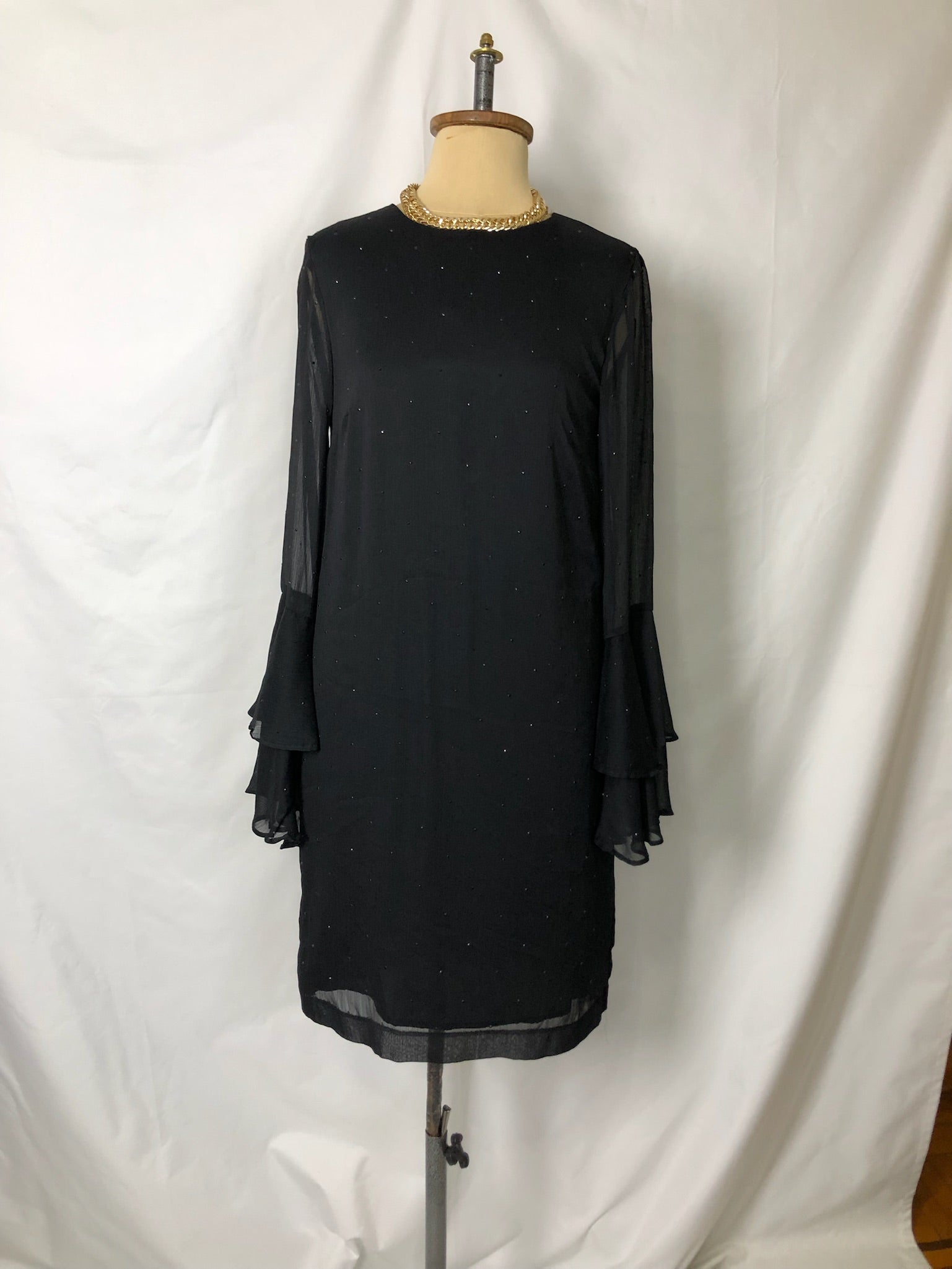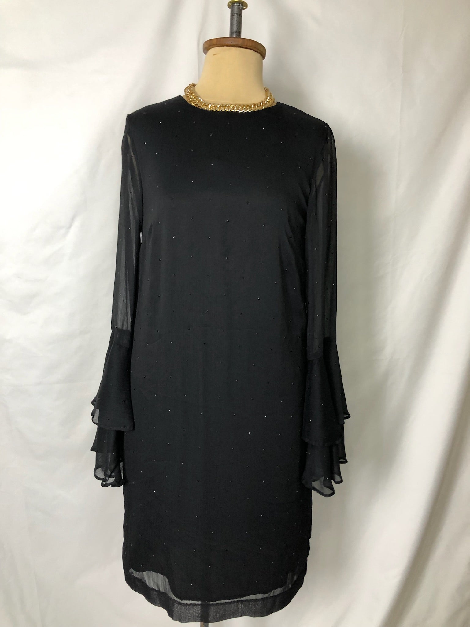 Black long sheer ruffle sleeves with shiny studs all over, round neck short-length dress.