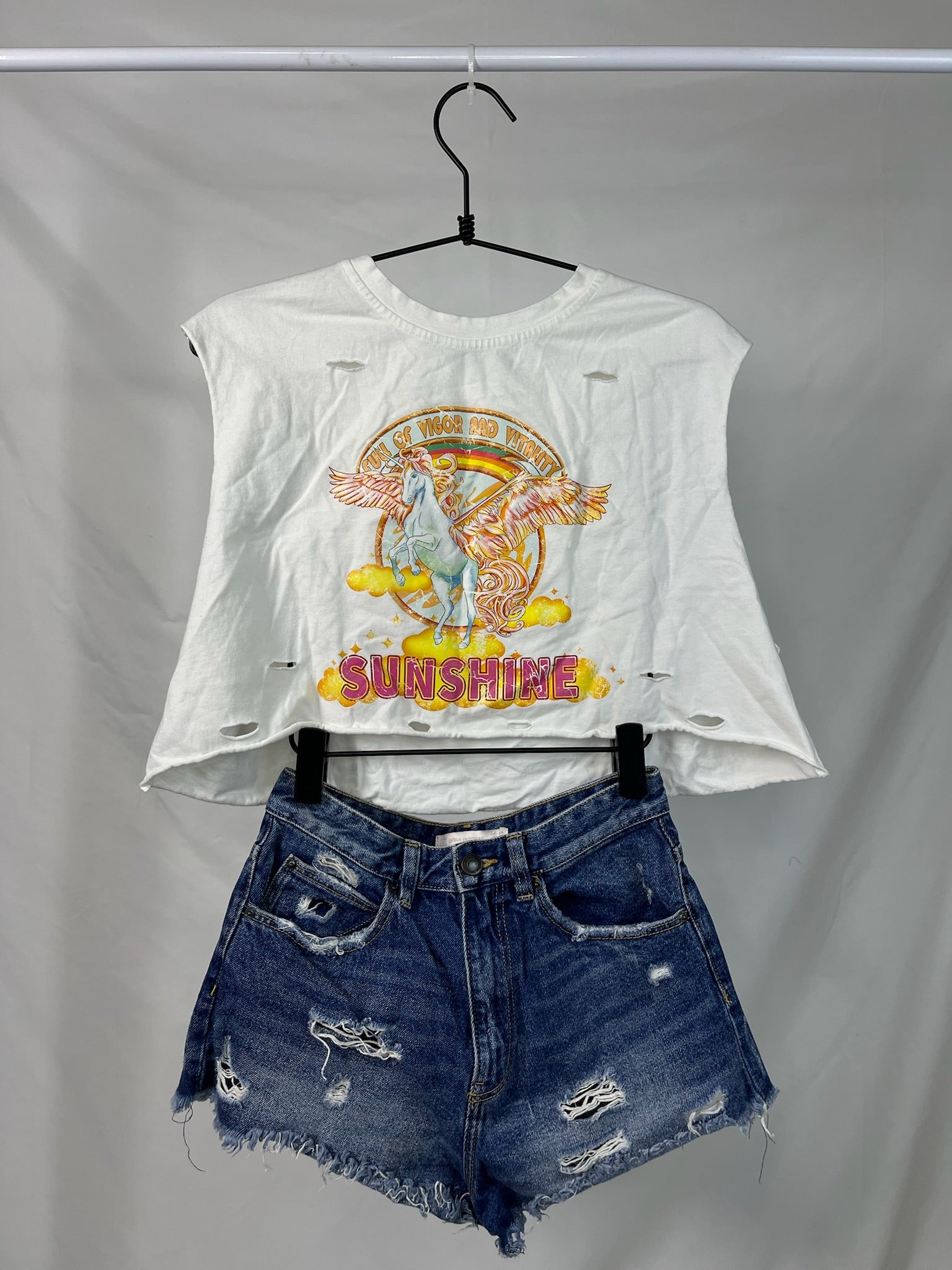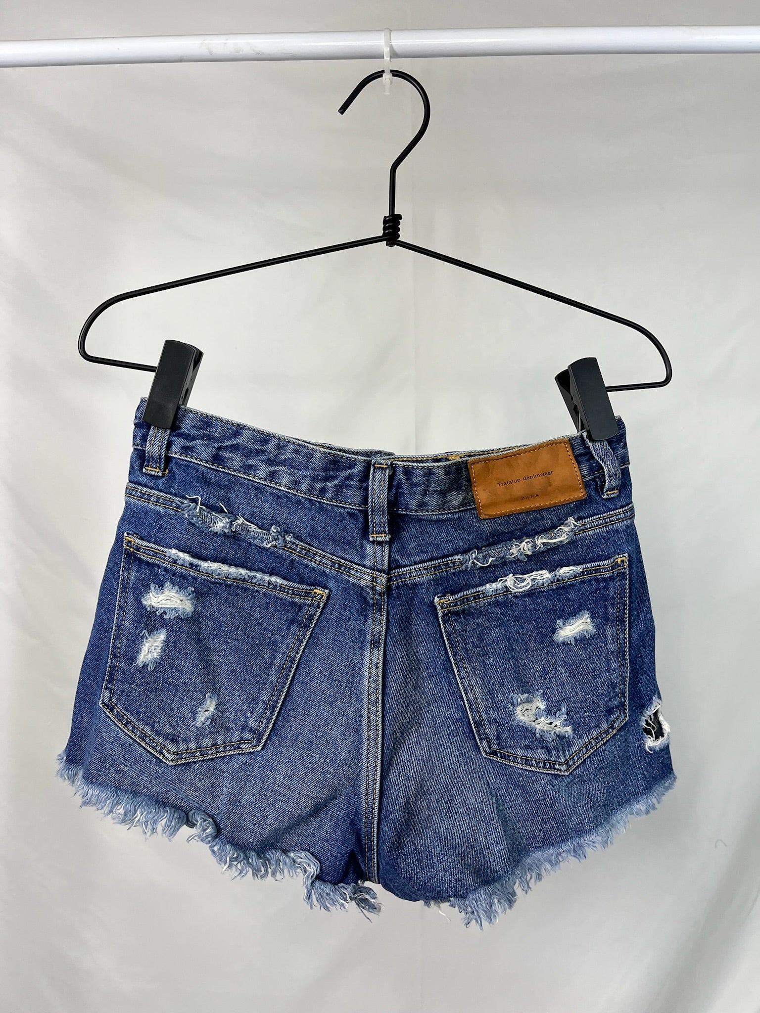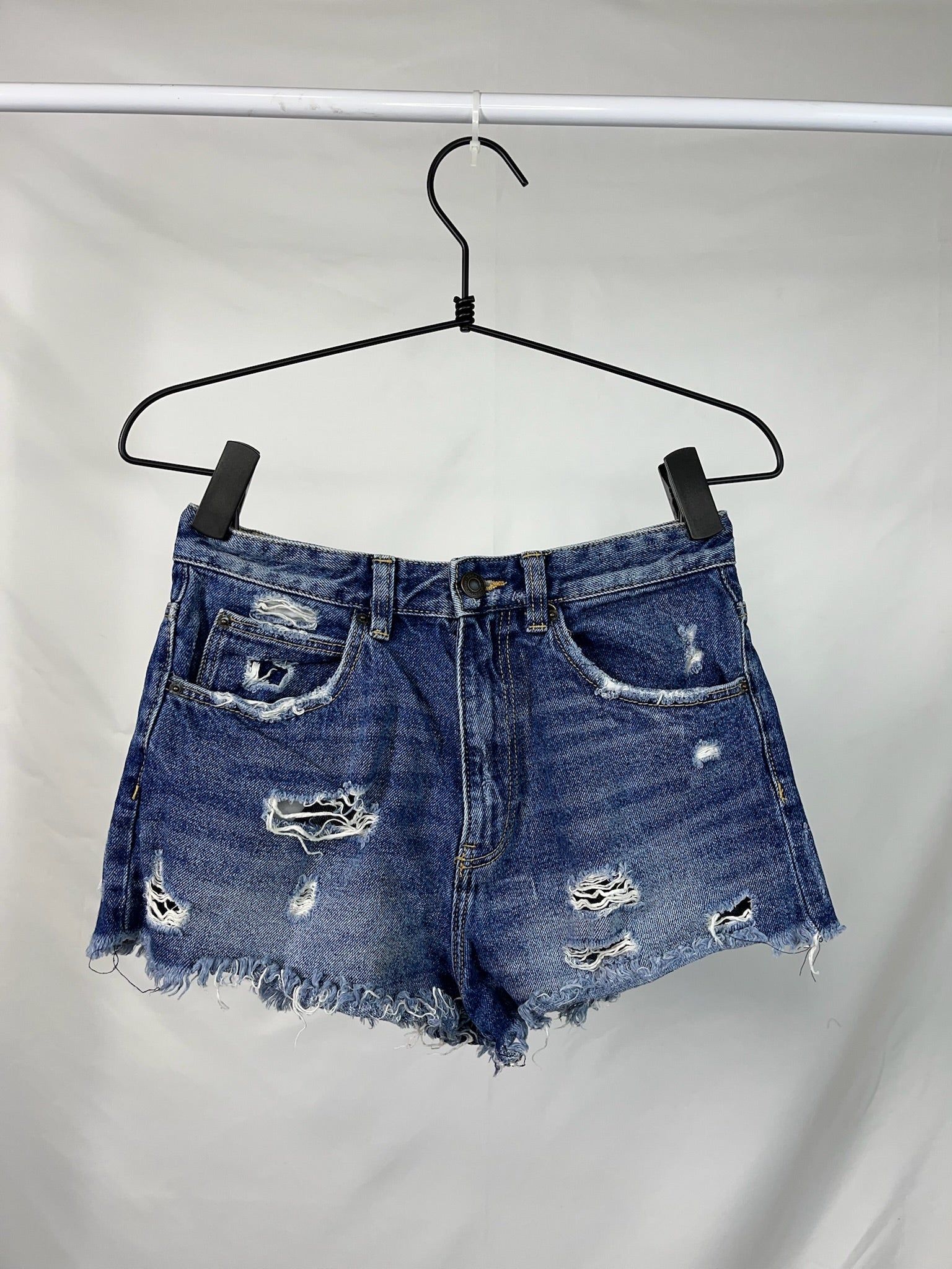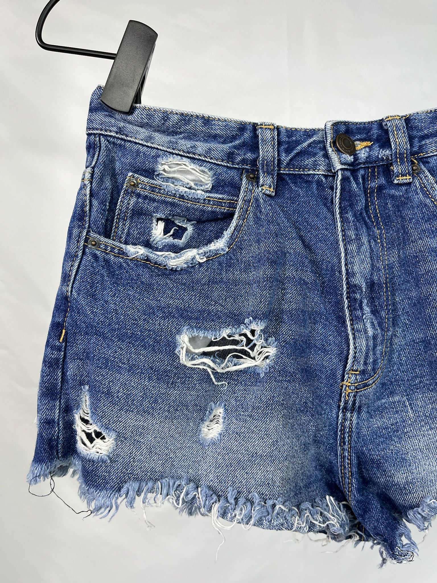 Blue mid-wash not so heavily distressed five pocket with belt loops denim shorts.
