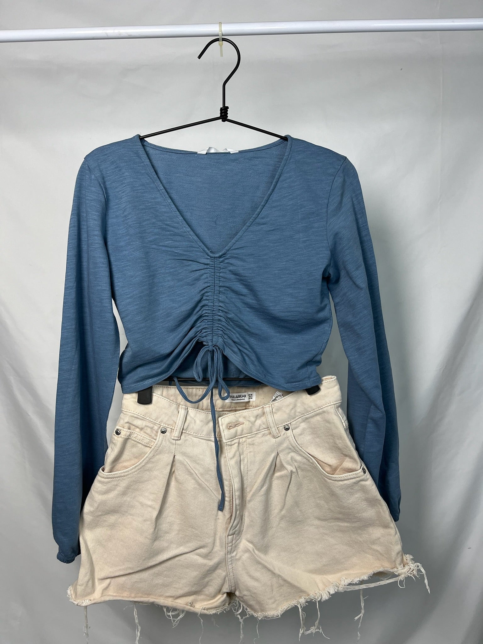 Baby pink-ish cream high waisted denim shorts with pockets.