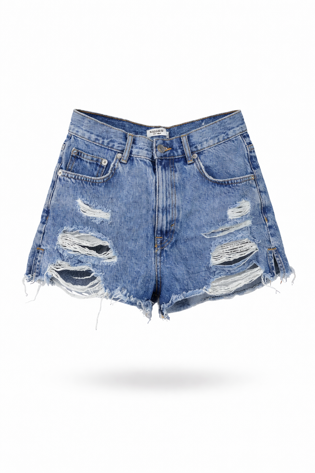 Regular blue high waisted heavy distressed detailing with frayed hems denim shorts with pockets.