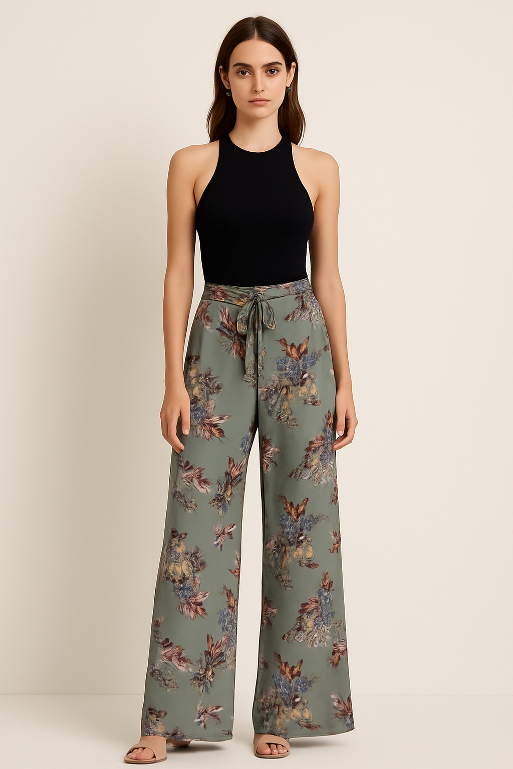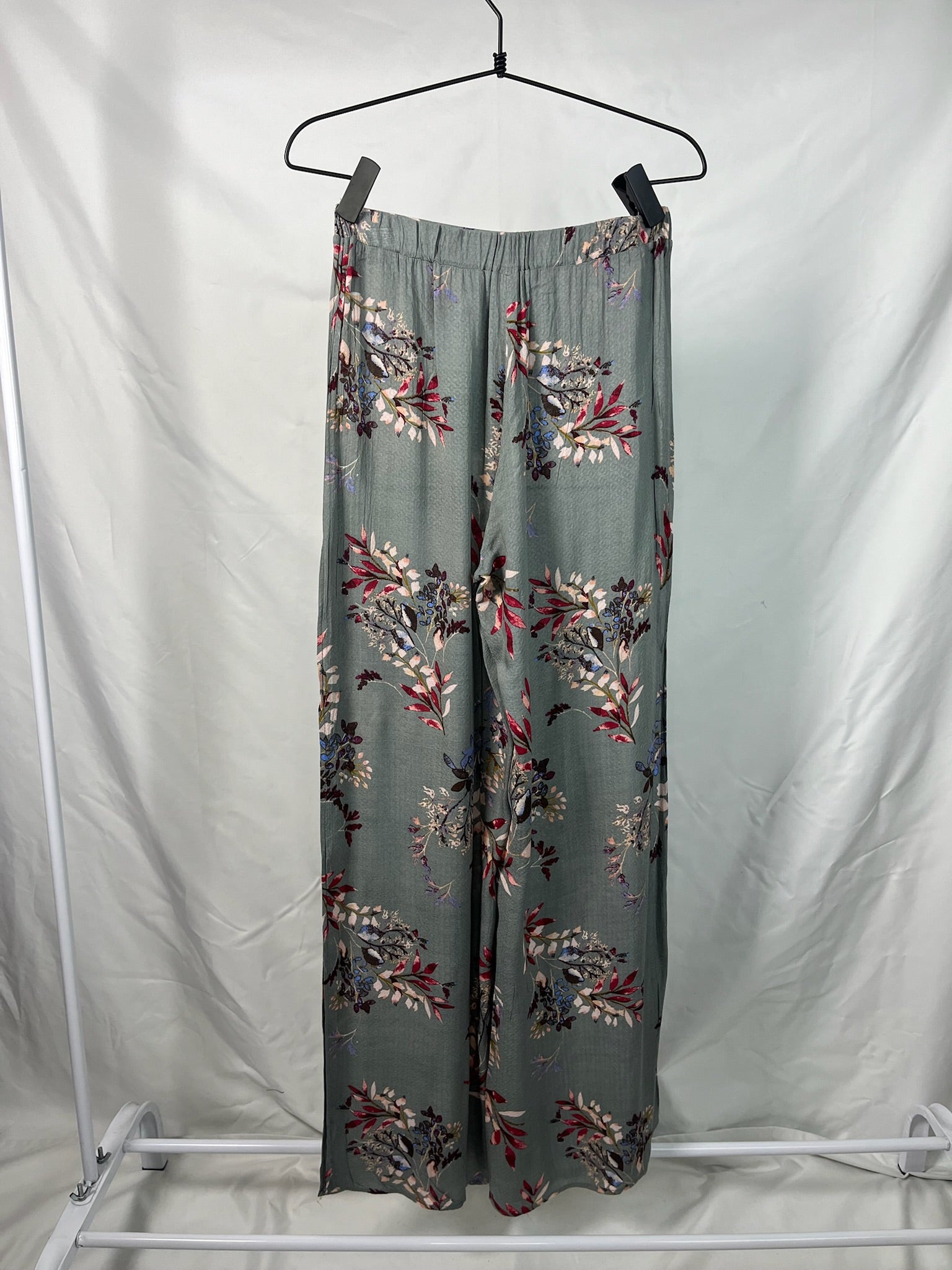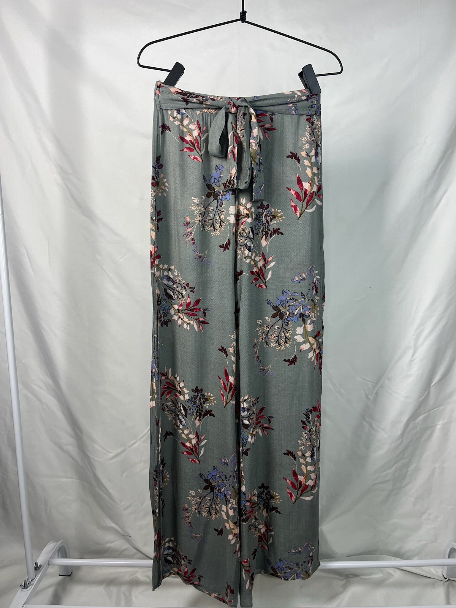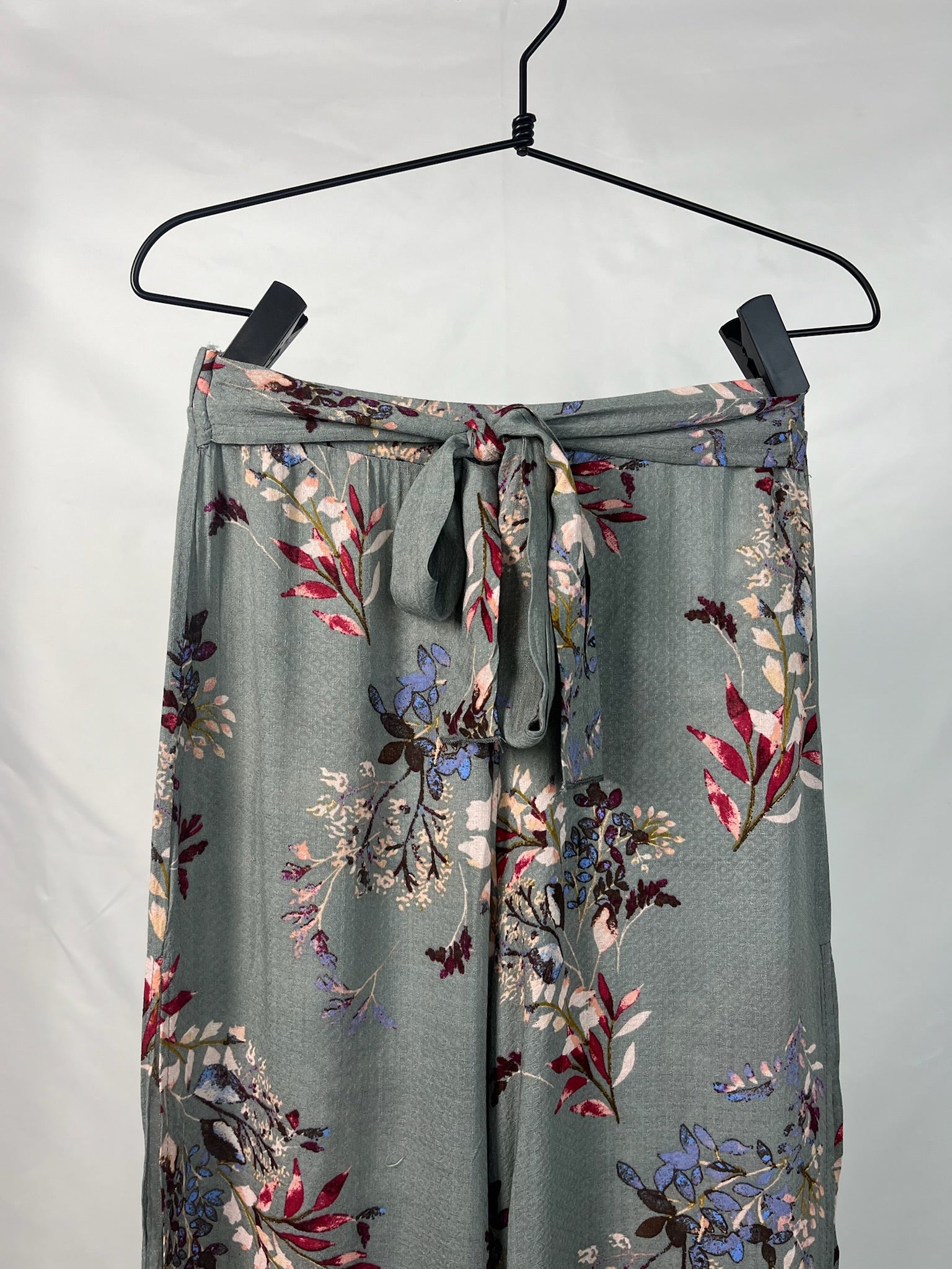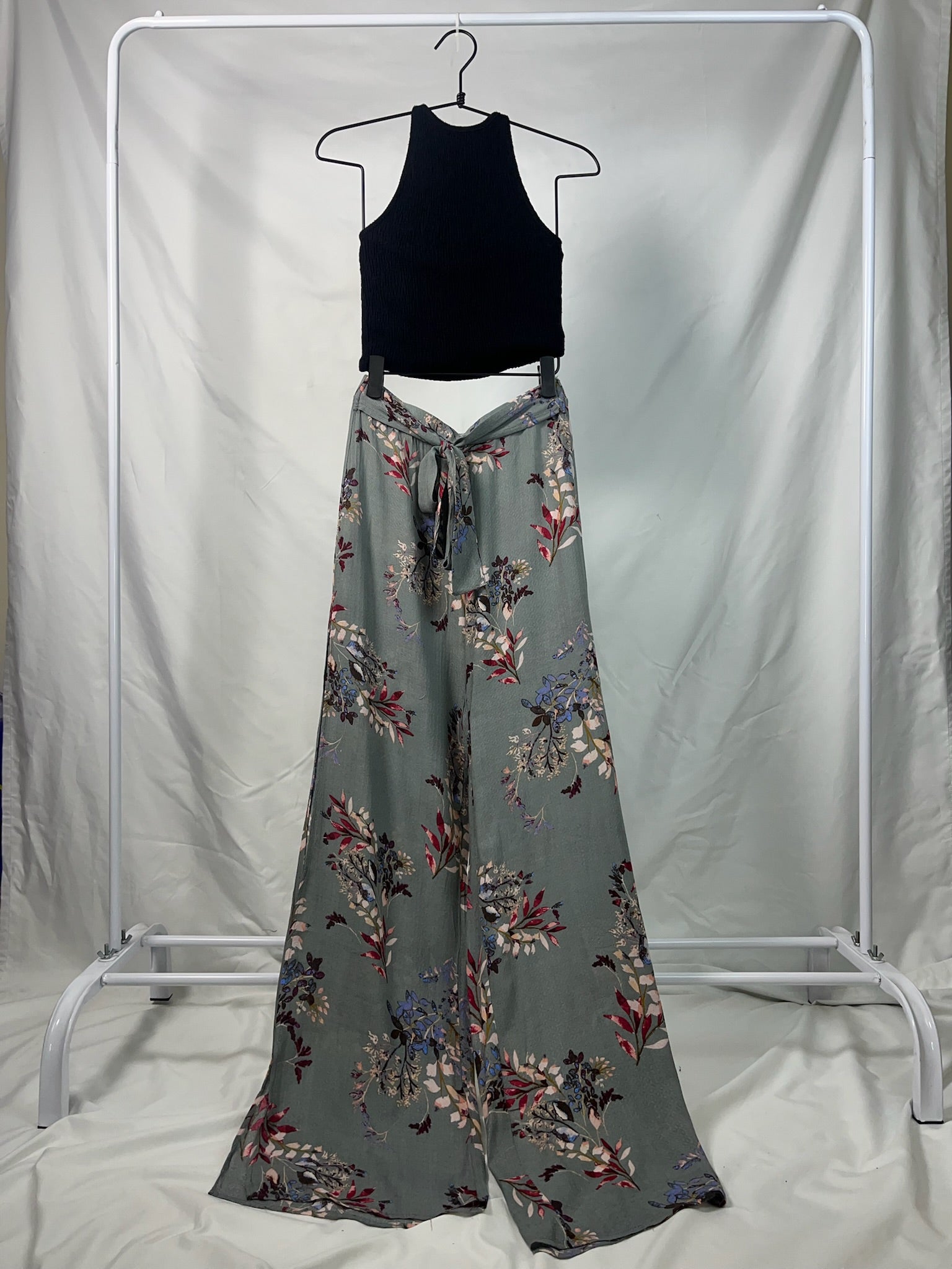 Gray base with flower bouquets scattered all of the pants it has two side slits, pocketless and comes with a matching tie belt.