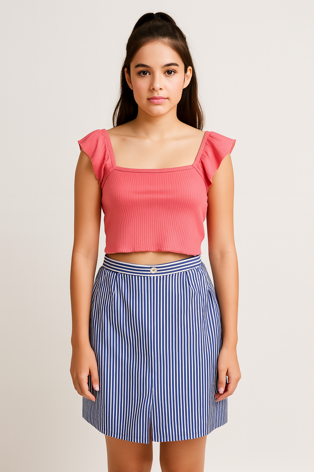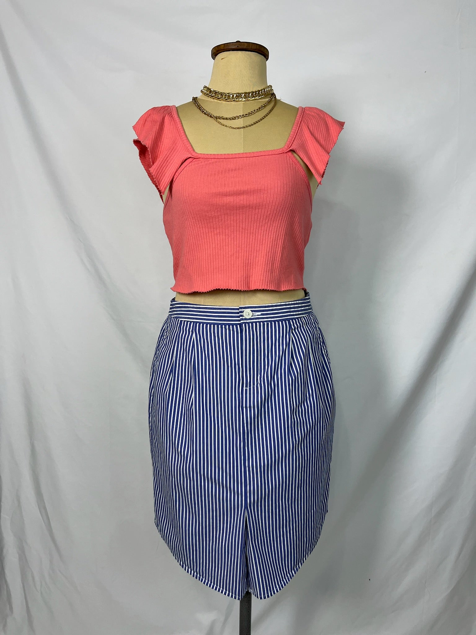 Blue and white pinstripe skirt with pockets.