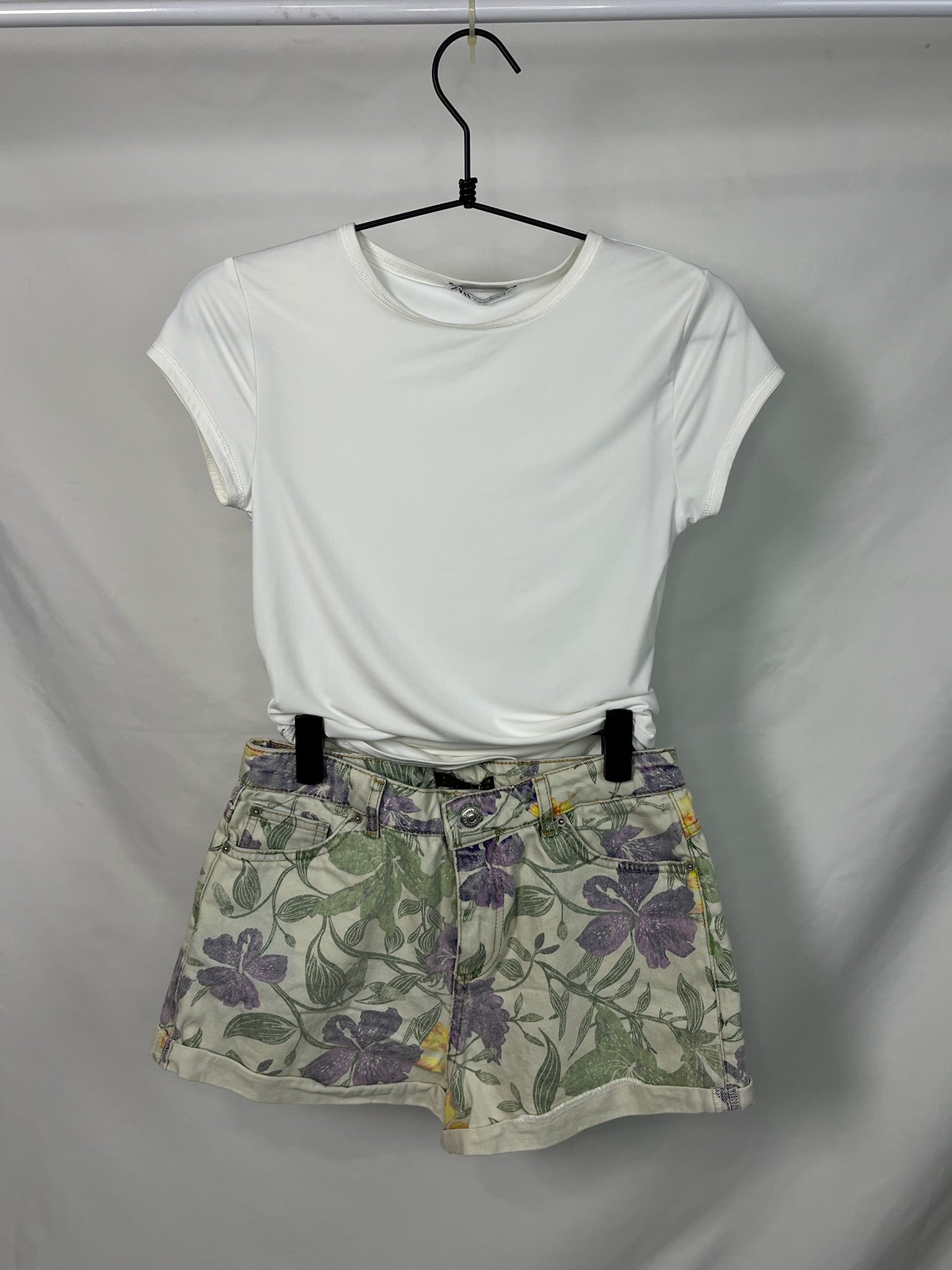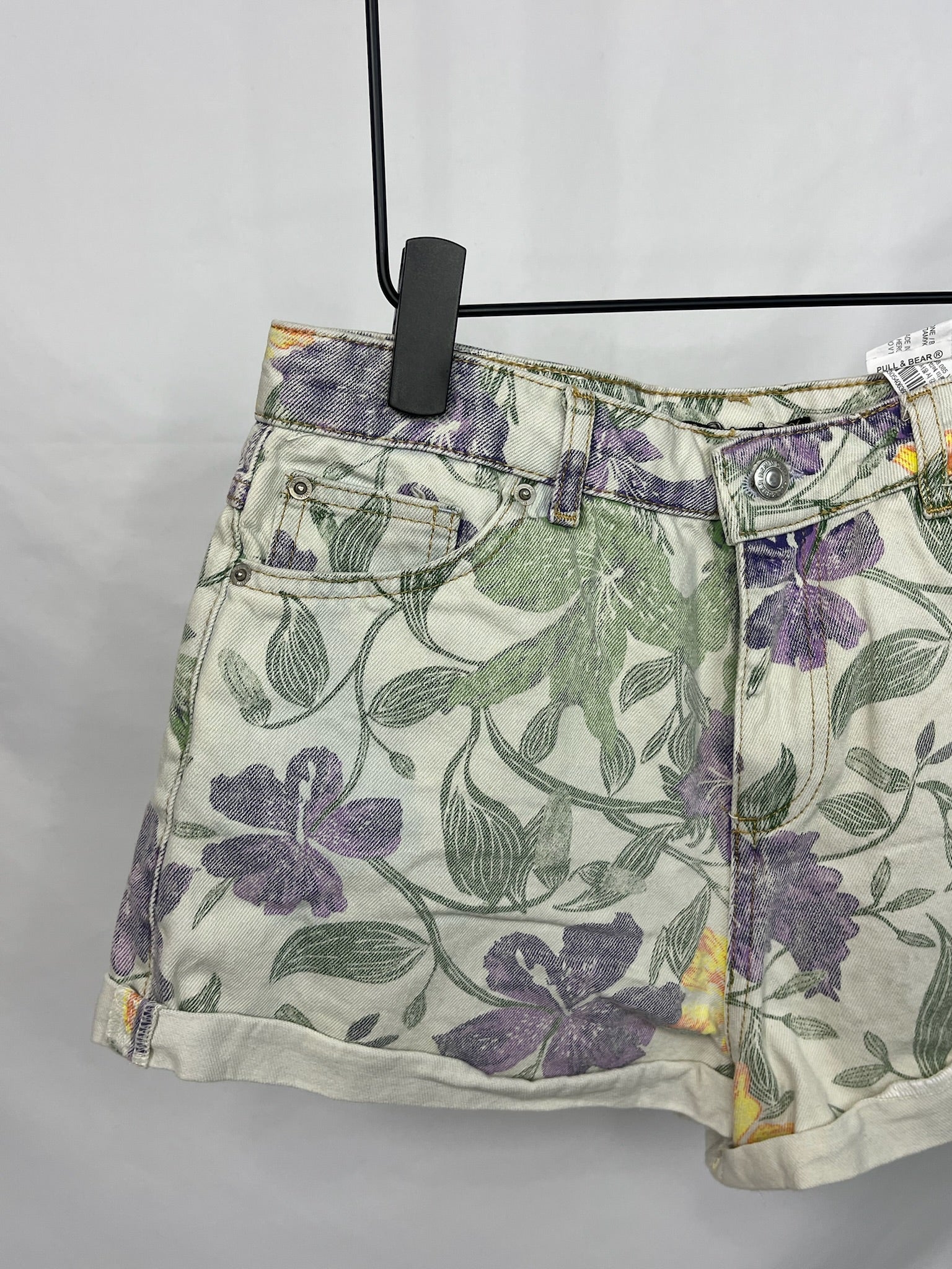 Pastel Violet & Green leafy denim shorts with pockets and belt loops.